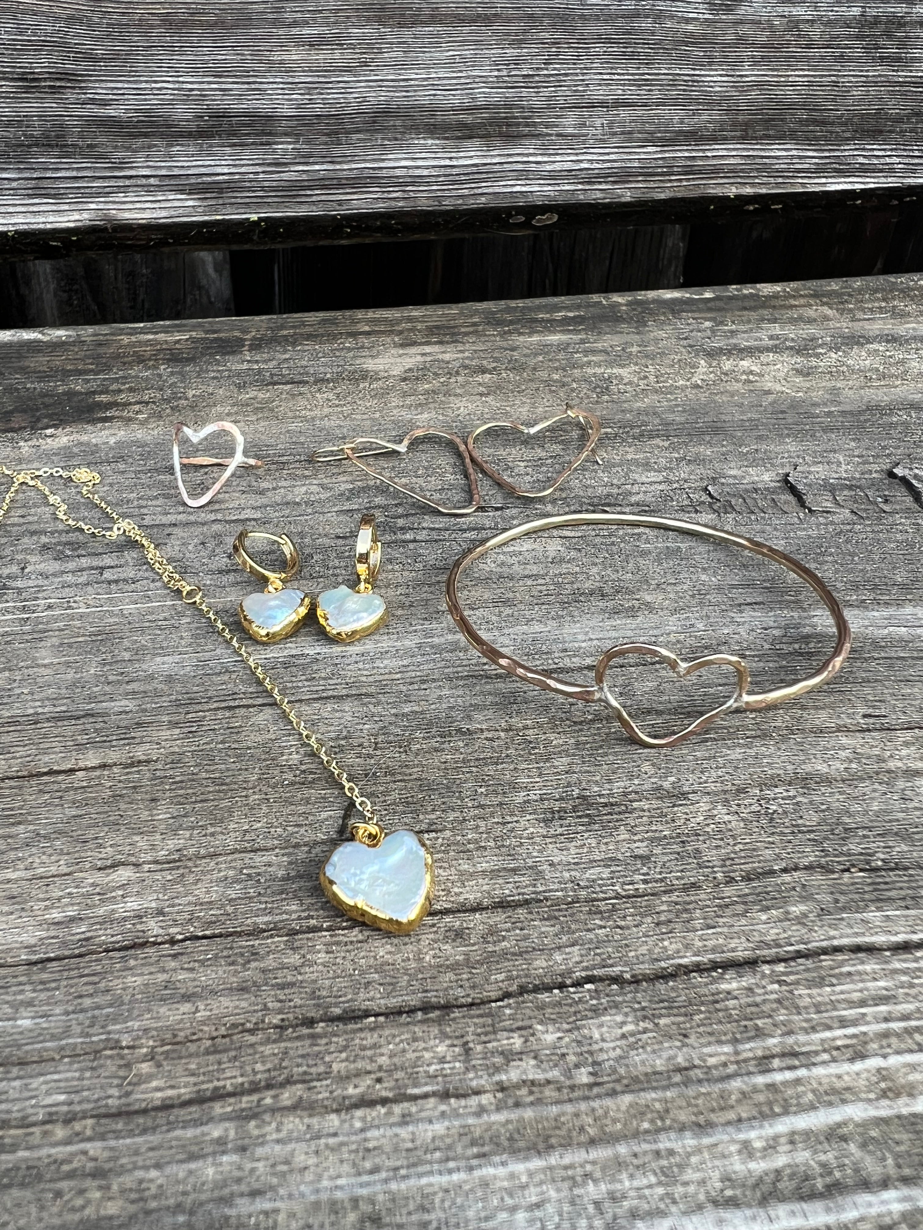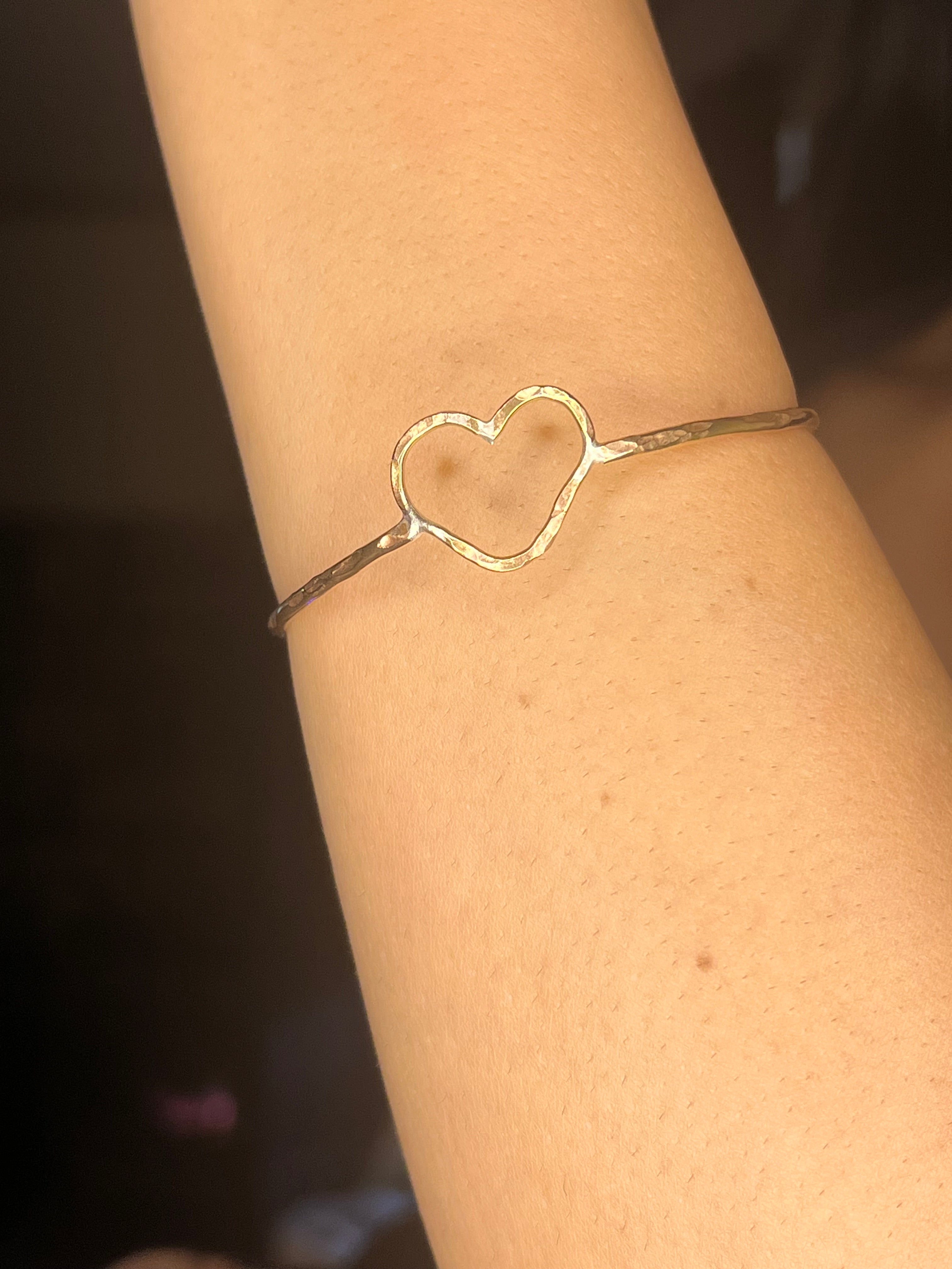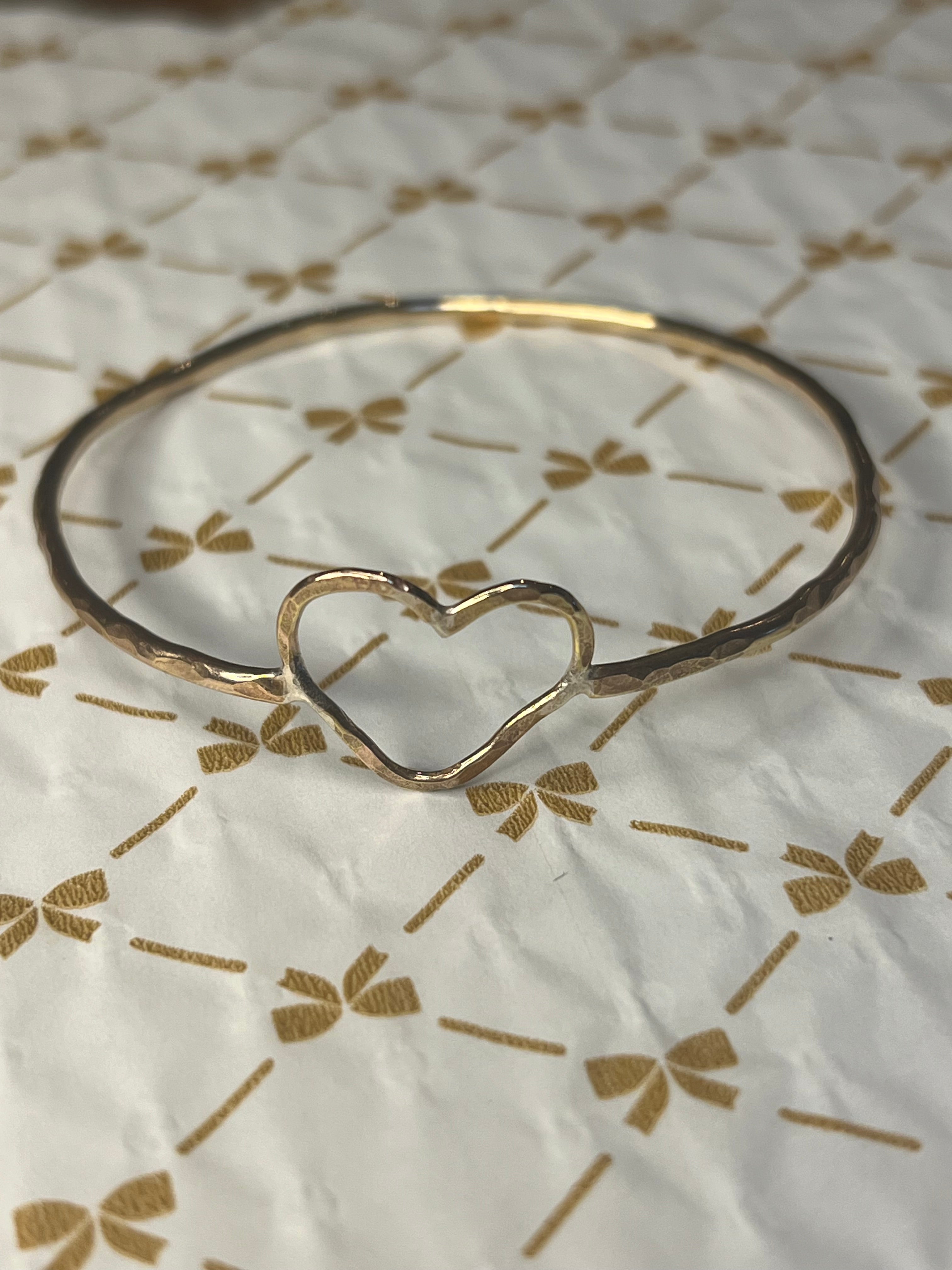 Crafted with care and precision, our Hammered Heart Bangle is a unique accessory that will add elegance to any outfit. Made from high-quality gold filled thick gauge hammered wire, each piece features a hand-shaped and soldered heart. Choose from different sizes to find the perfect fit by measuring the circumference of your fist after putting all your fingers together.. Each bangle is lovingly handmade, ensuring that no two pieces are exactly alike.
