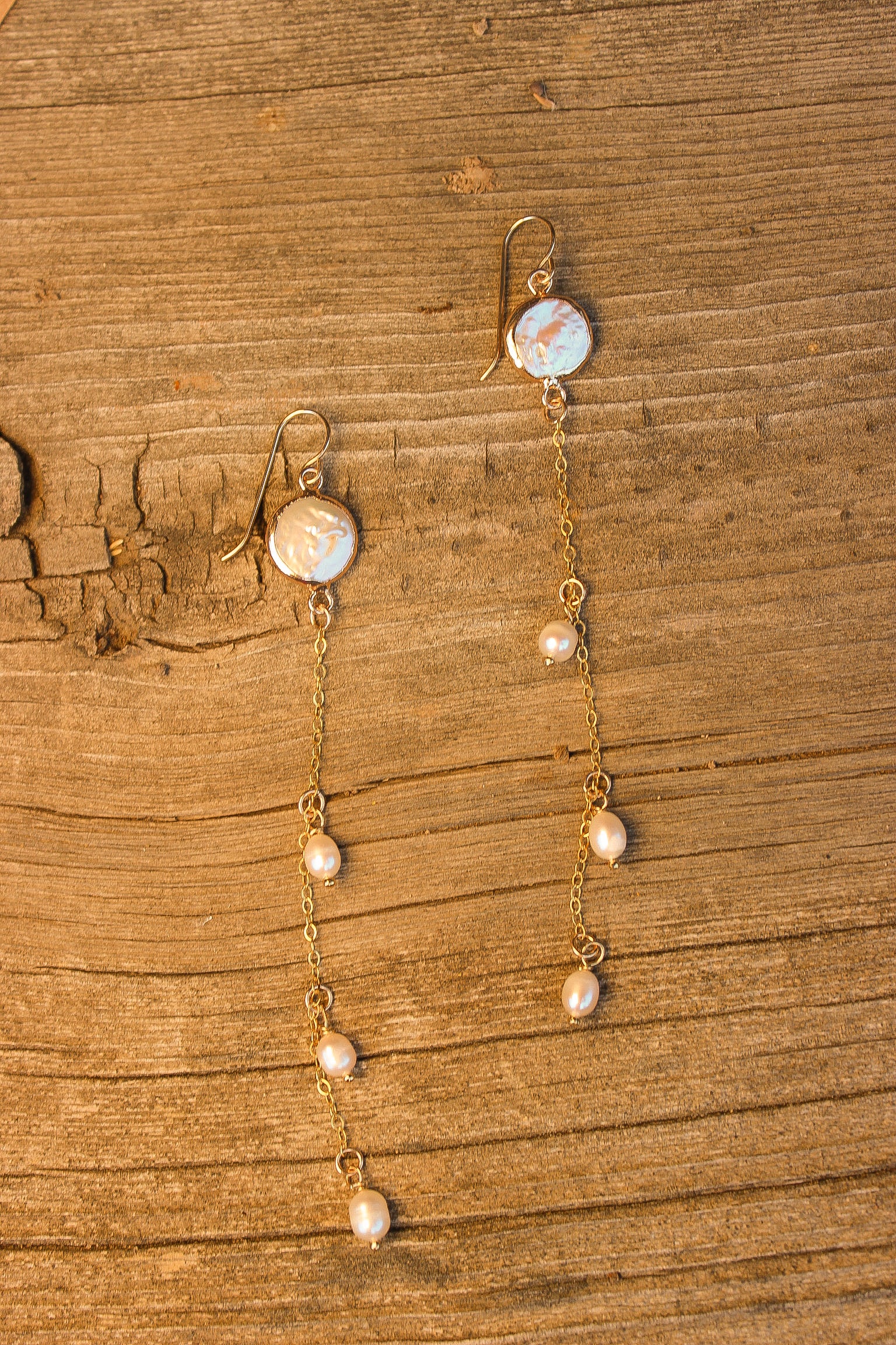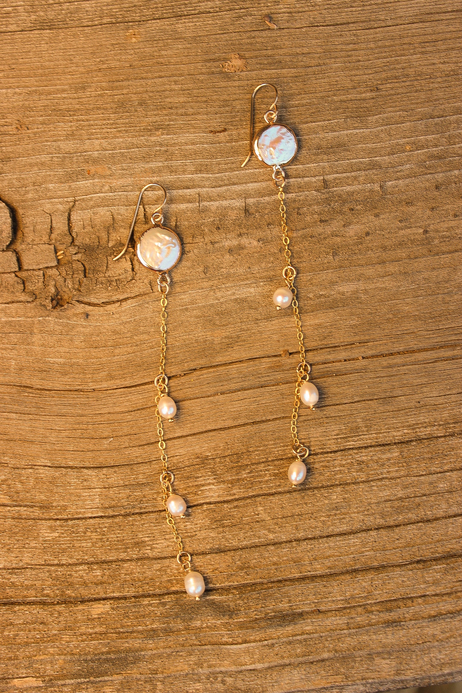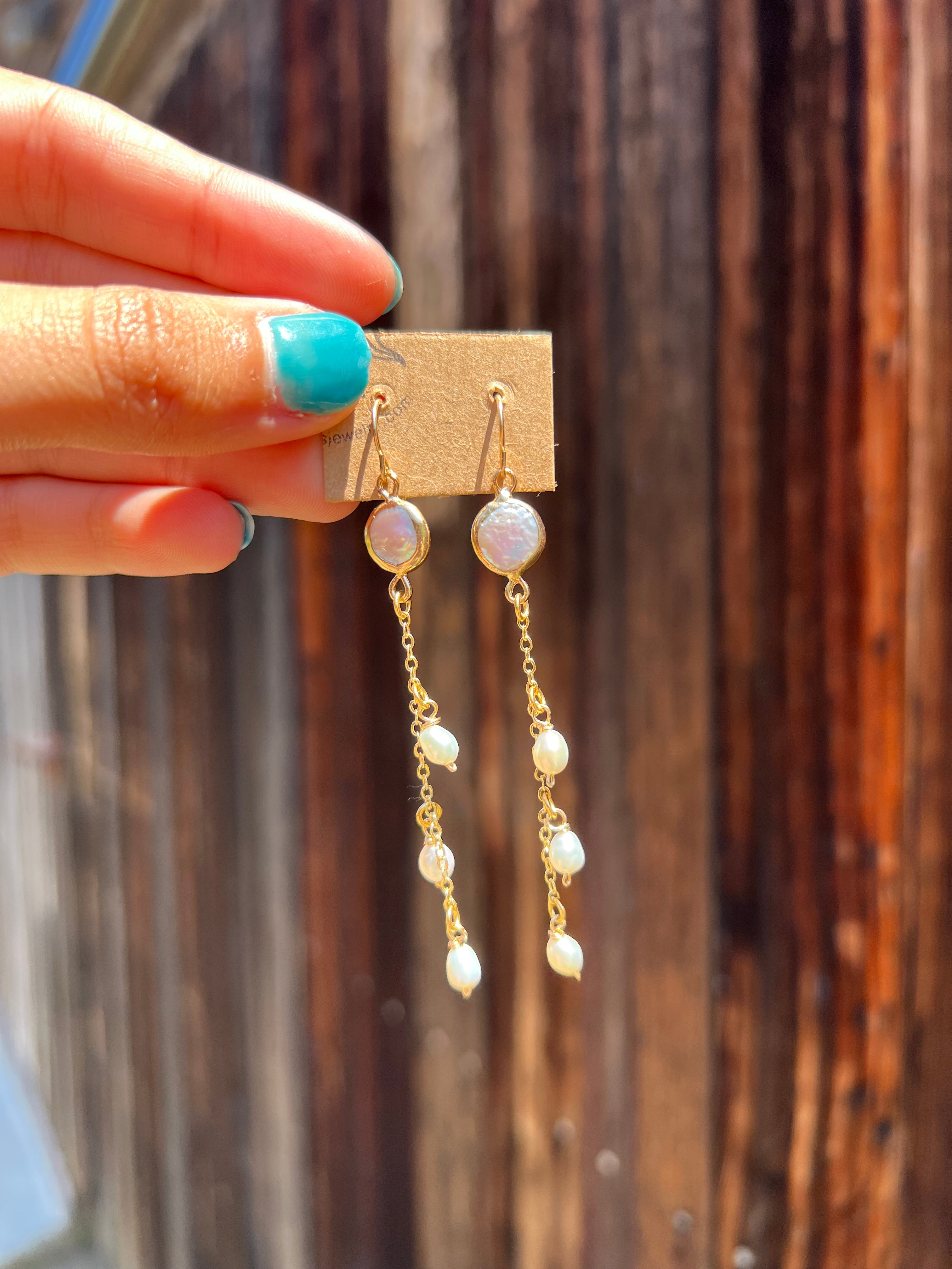 Elevate your look with Besos Earrings, delicately gold electroplated with pink pearls and accented with a drop down chain and small pearls. Made with gold filled material, these earrings measure 2-3 inches in length. Complete the set with the Besos necklace for a polished, coordinated look.