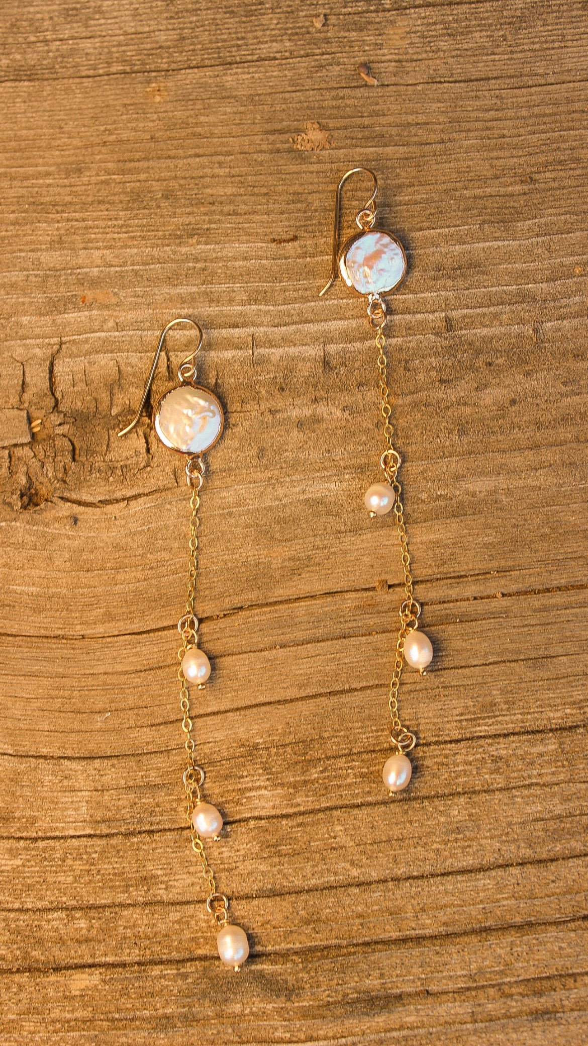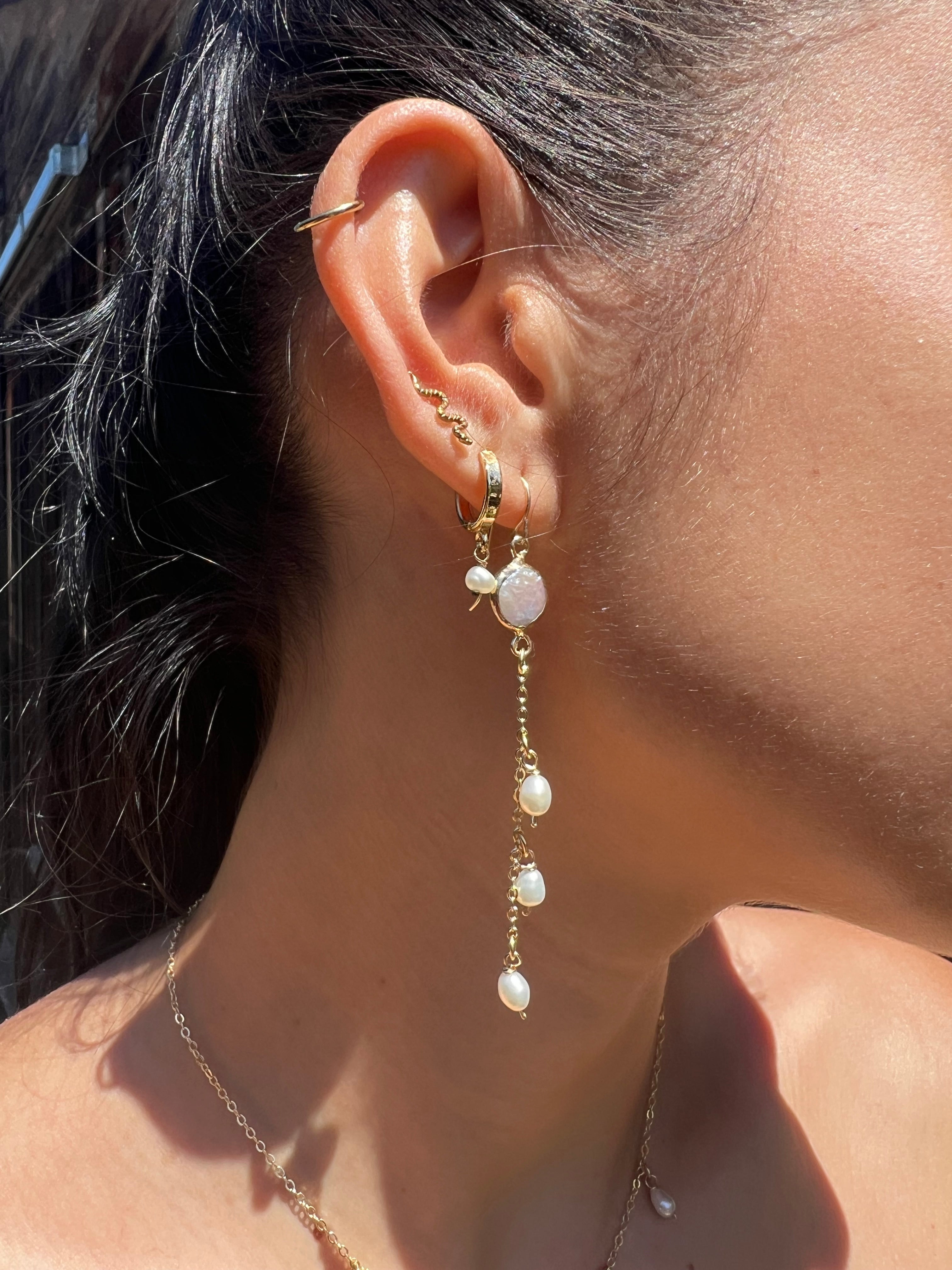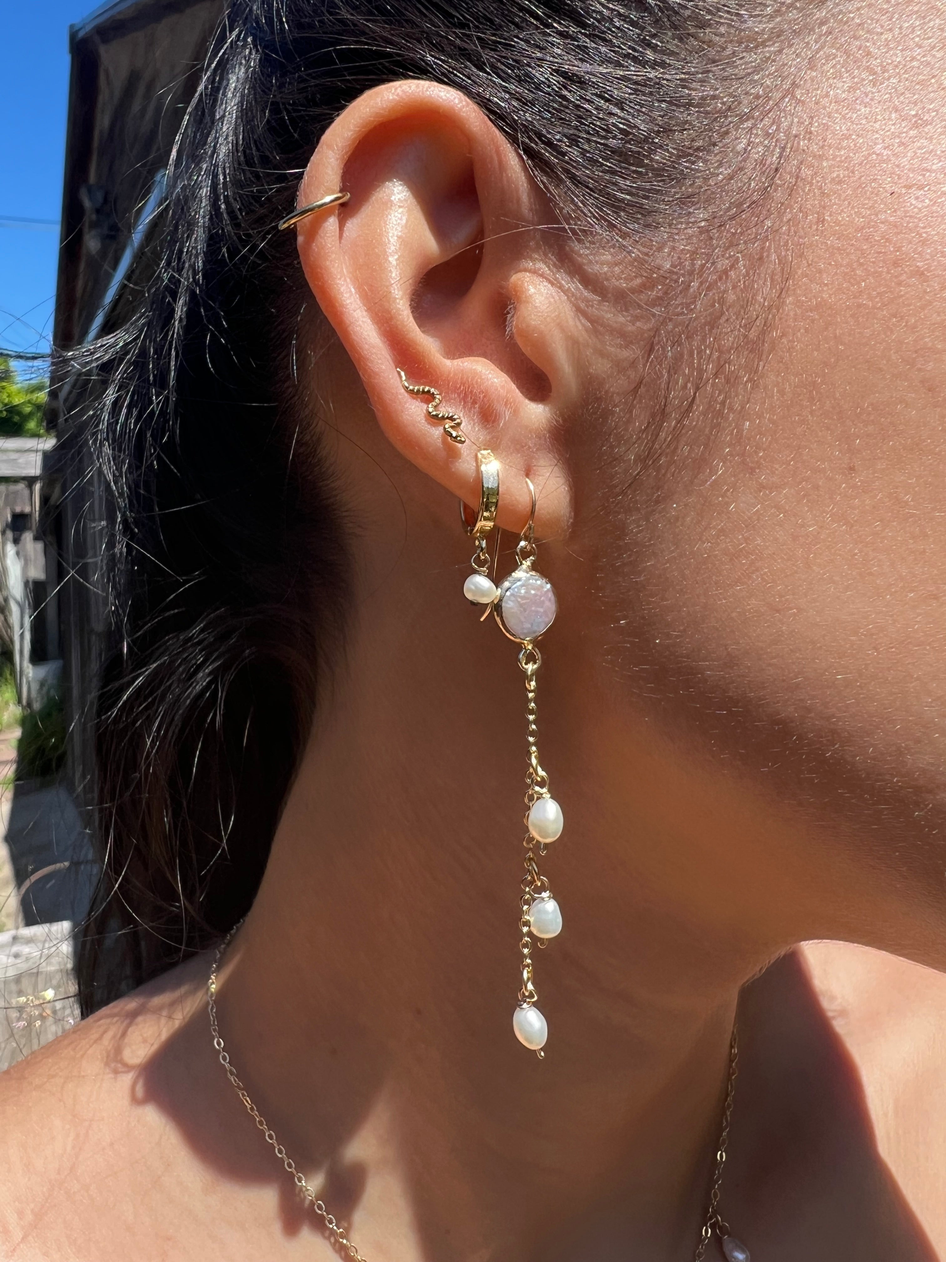 Elevate your look with Besos Earrings, delicately gold electroplated with pink pearls and accented with a drop down chain and small pearls. Made with gold filled material, these earrings measure 2-3 inches in length. Complete the set with the Besos necklace for a polished, coordinated look.