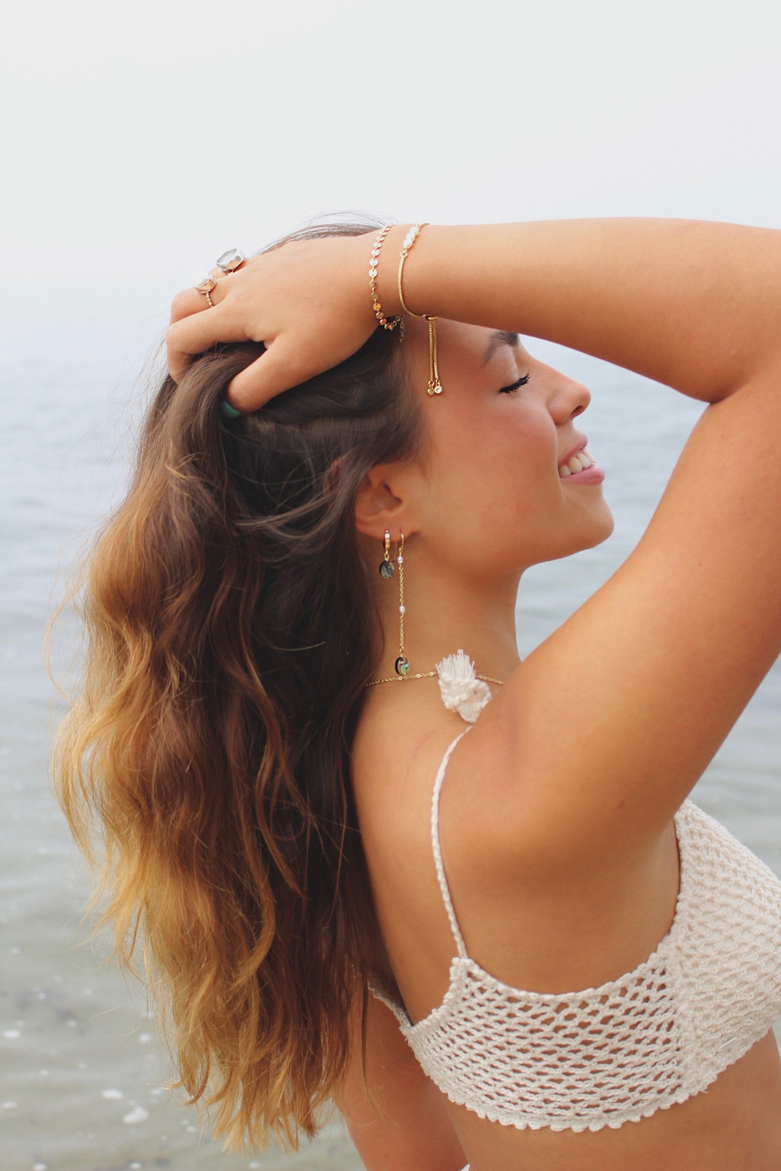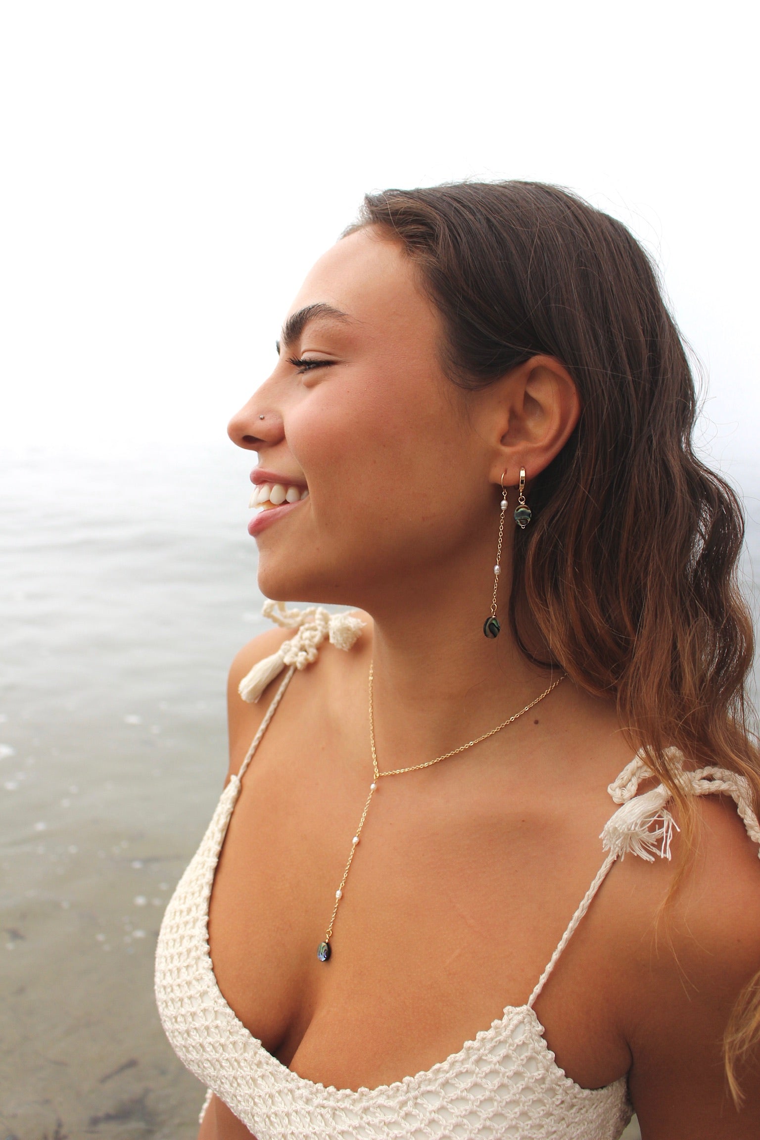 Elevate your style with Arielle Abalone Huggies. These elegant 14k gold filled huggie earrings feature a secure snap latch back and delicate oval abalone charms, adding a touch of ocean-inspired beauty to any outfit. Perfect for any occasion, these 3mm huggies are a must-have for any jewelry collection. Shown in the second piercing here.
