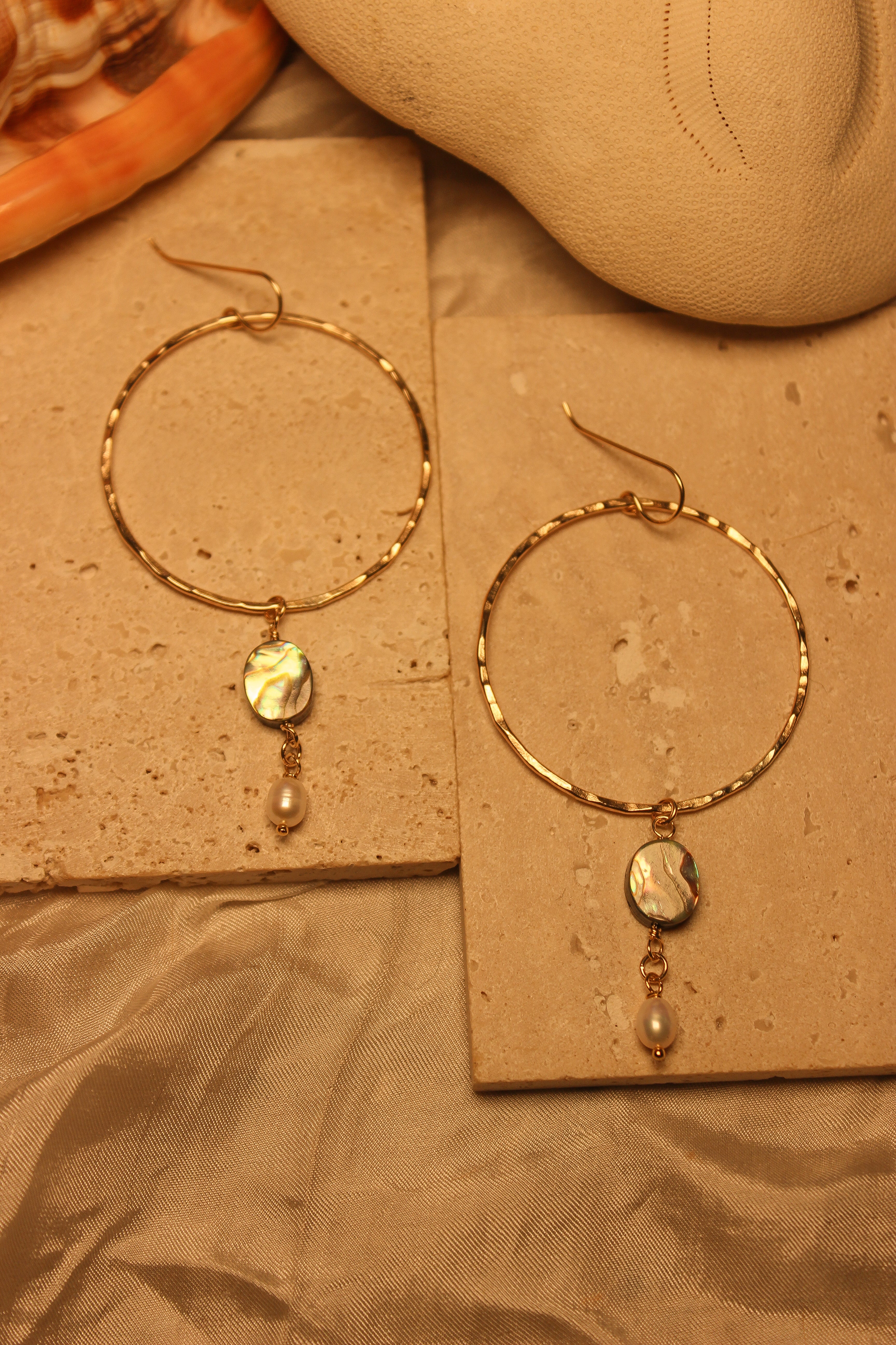 Expertly crafted with hammered gold filled hoops, the Bondi Big Hoops are statement earrings that elevate any outfit. Featuring an oval abalone and white keshi pearl, these hoops exude sophistication and elegance. Perfect for any occasion, these earrings are a must-have for any fashion-forward individual. Around 2” in diameter.
