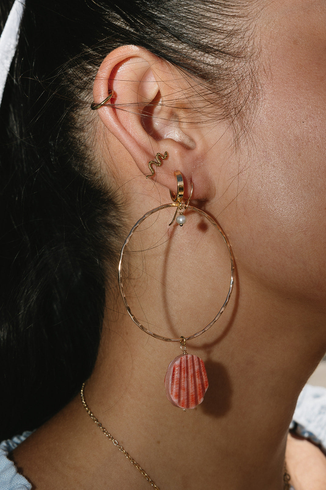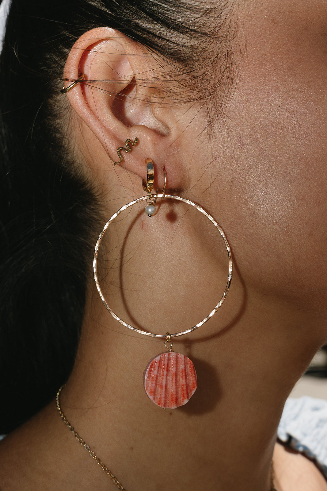 Upgrade your hoop game with Calypso Big Hoops. These 5.5" hoops are the bigger version of our popular Calypso Mini Hoops, featuring a hammered texture for added dimension. Adorned with a double-sided shell circle charm, each one unique. Elevate your style with these statement hoops.