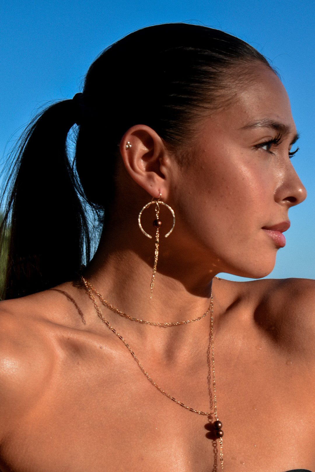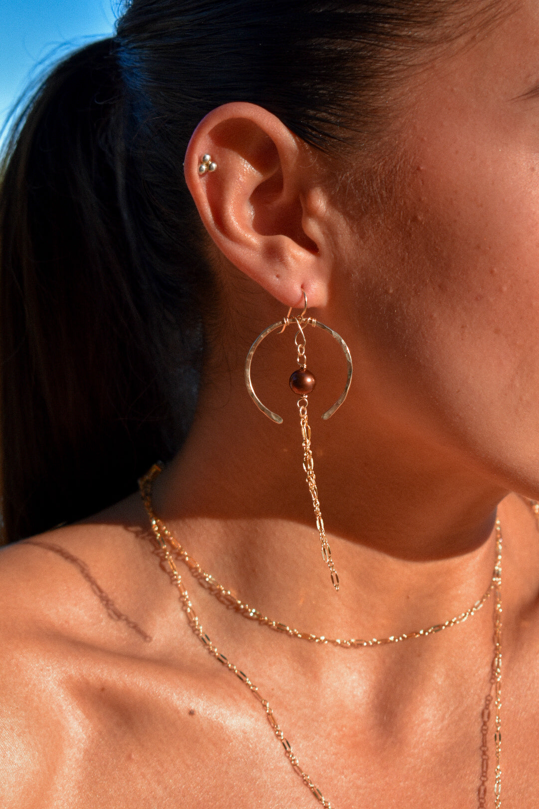 Expertly crafted for the fall season, the Canela Hoops are a charming twist on our popular half pipe hoops. Featuring hammered open hoops adorned with a chocolate pearl and shimmering drop chain, these hypoallergenic earrings are both stylish and gentle on your ears. Elevate your look with these unique and elegant hoops.