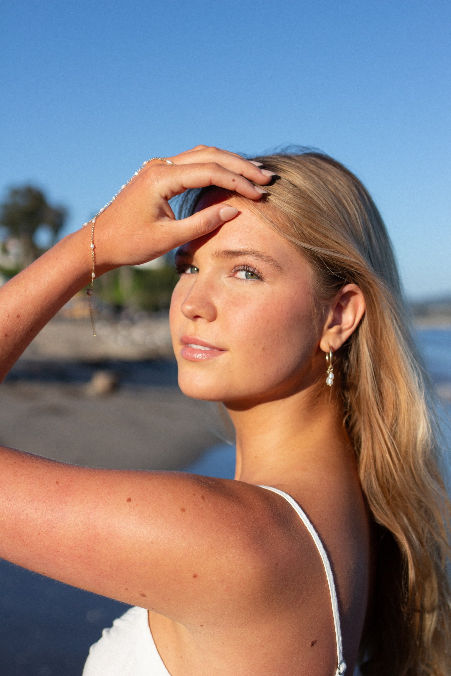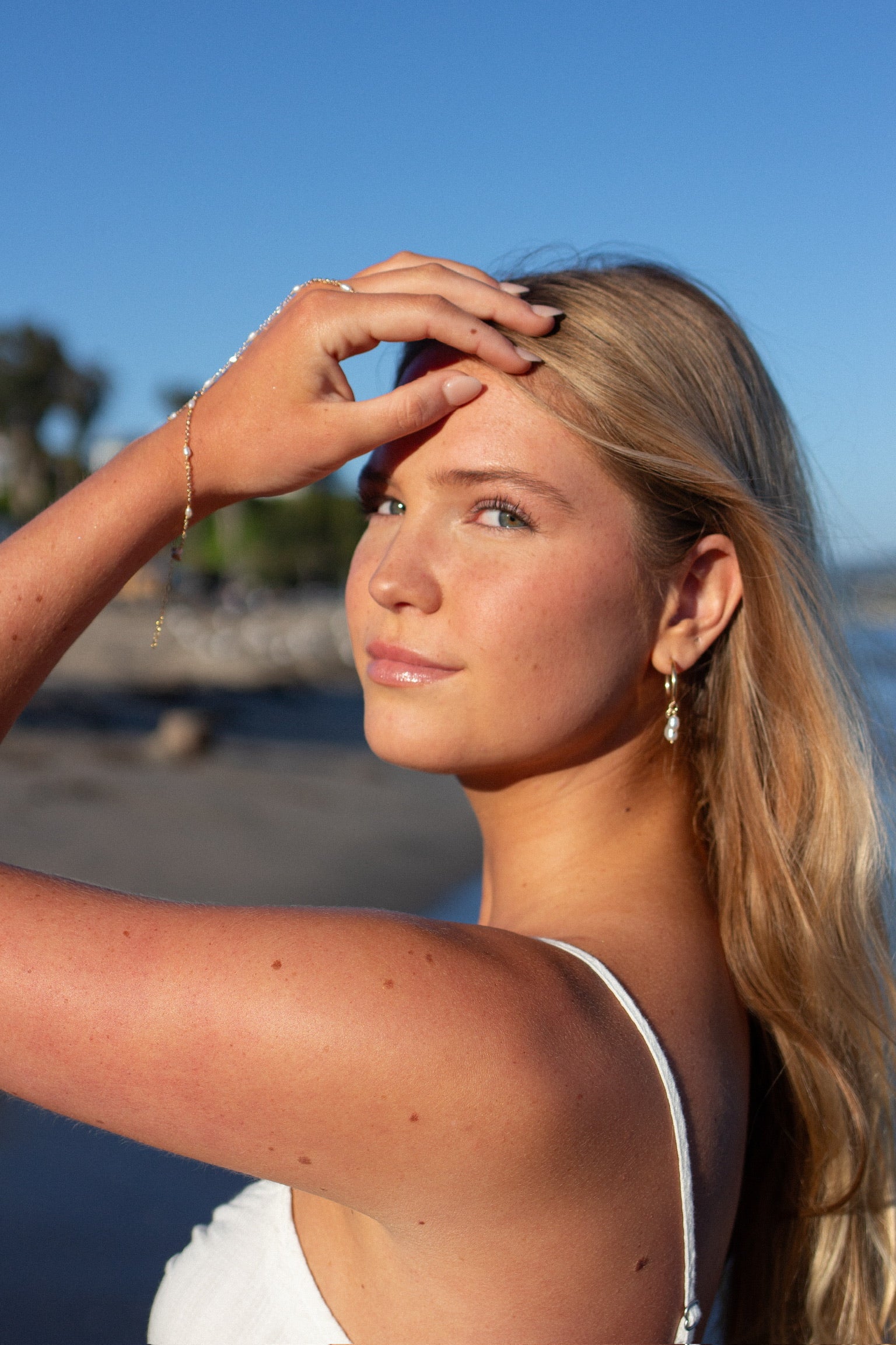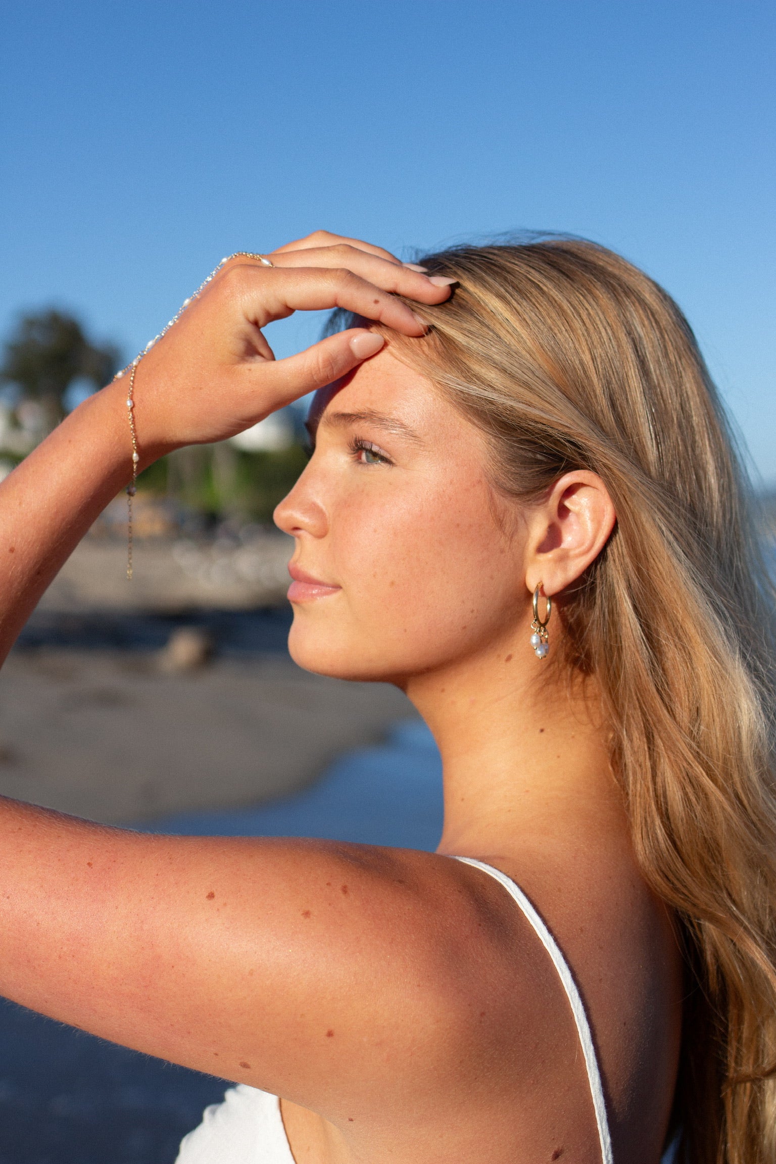 These gold-filled, nickel-free huggie hoops feature a latch closure and three luminous freshwater pearls that sway gently with every step. Inspired by Encinitas—where coastal cool meets quiet elegance—these earrings reflect the town’s peaceful beaches, artistic energy, and love for all things natural and sunlit. Lightweight and hypoallergenic, they’re made for days that start with salty air and end with golden light. Just like Encinitas, they’re effortlessly beautiful and made to be lived in.