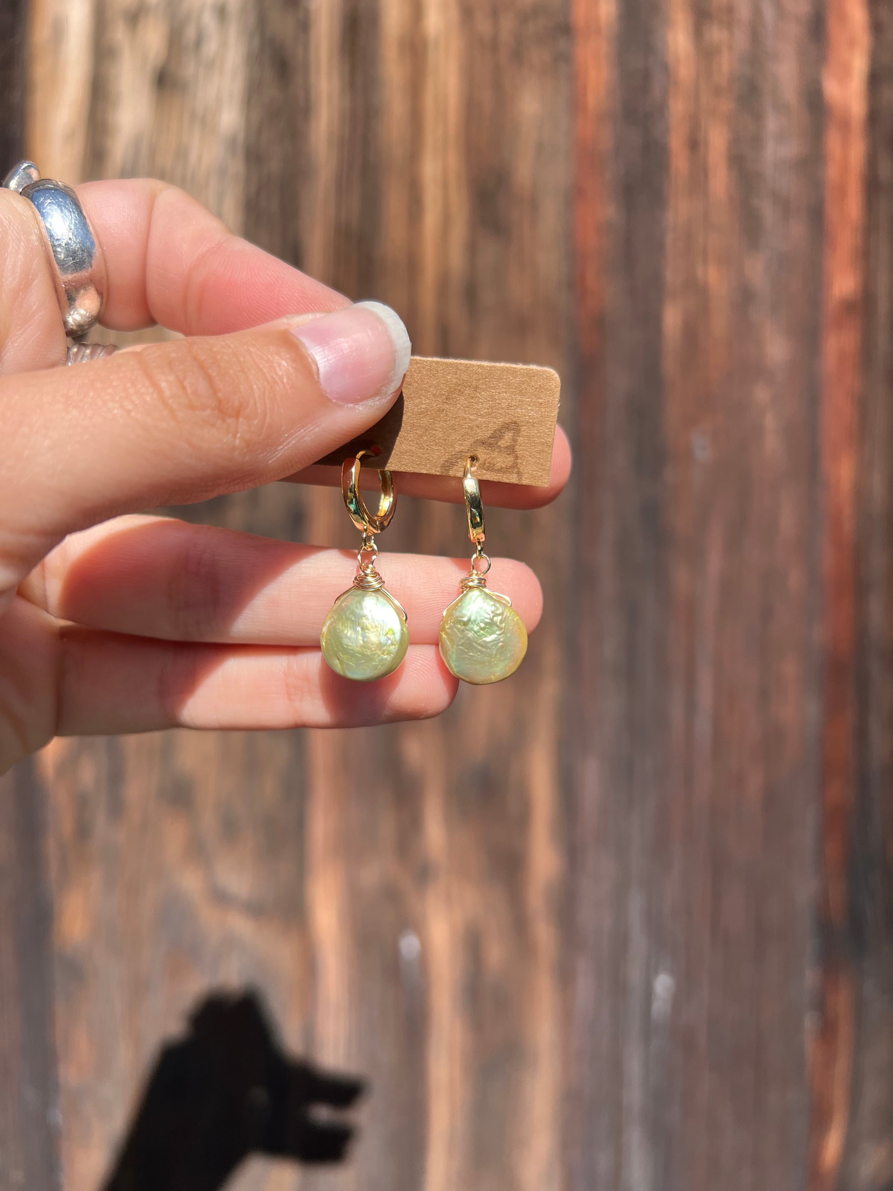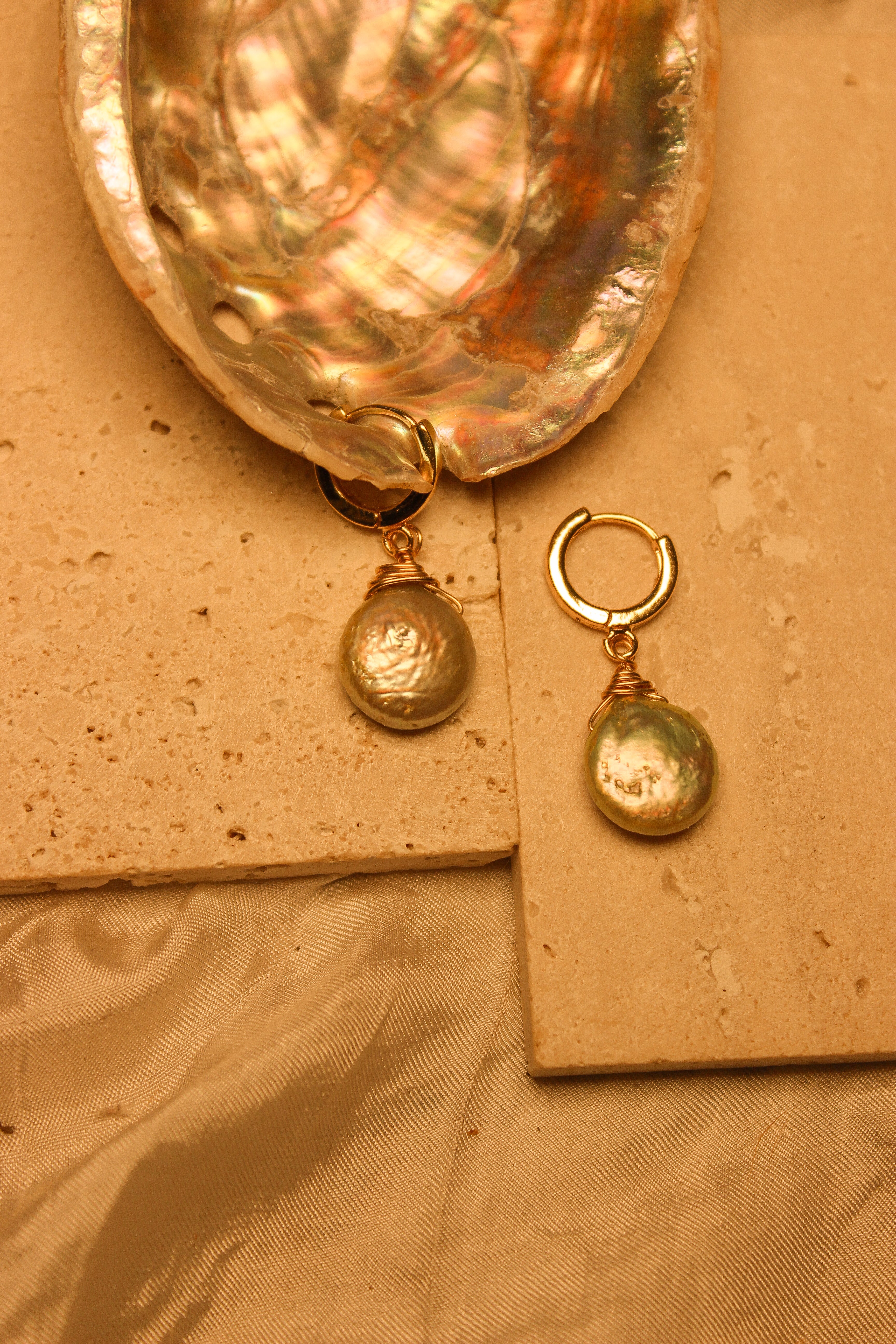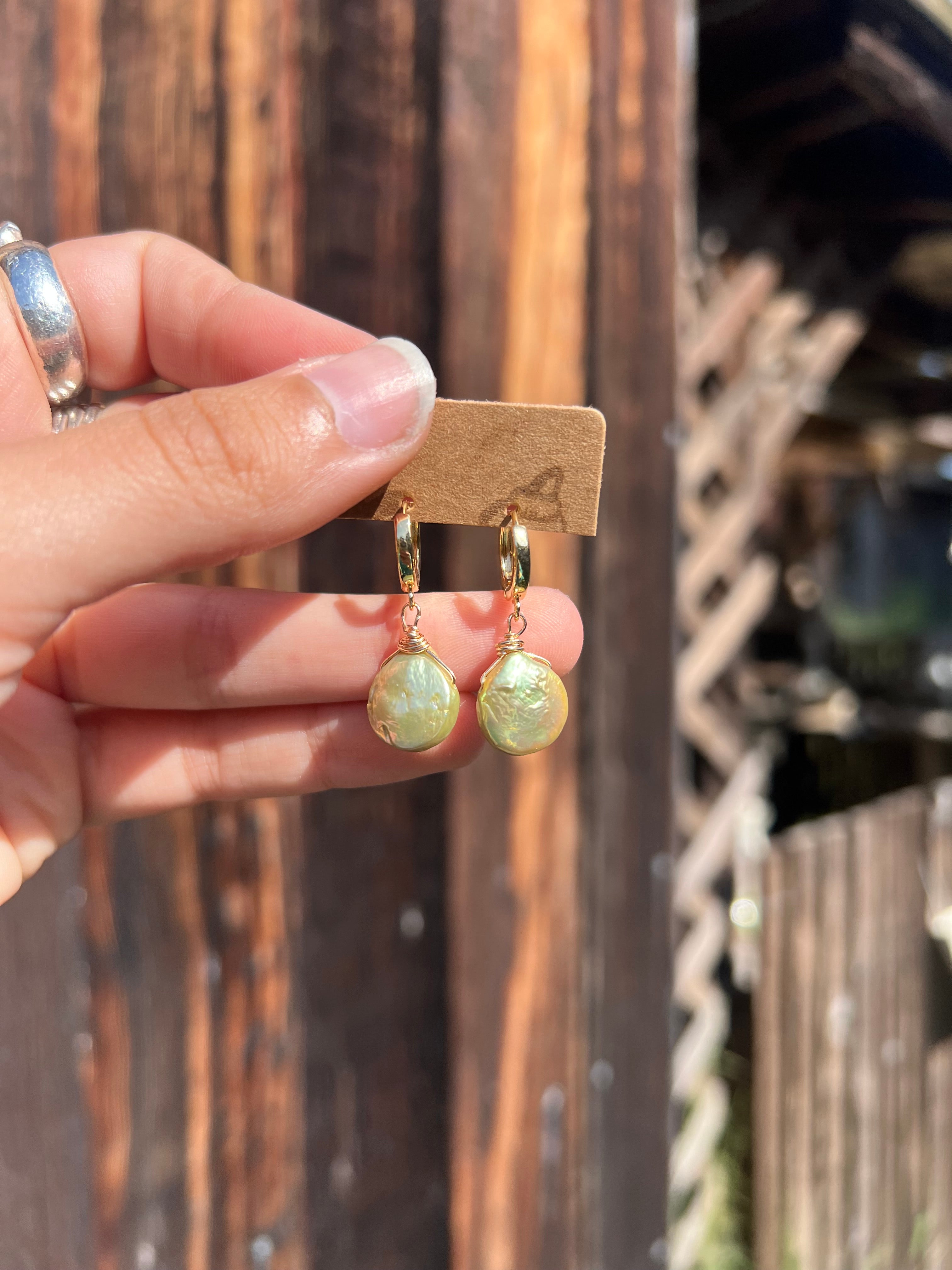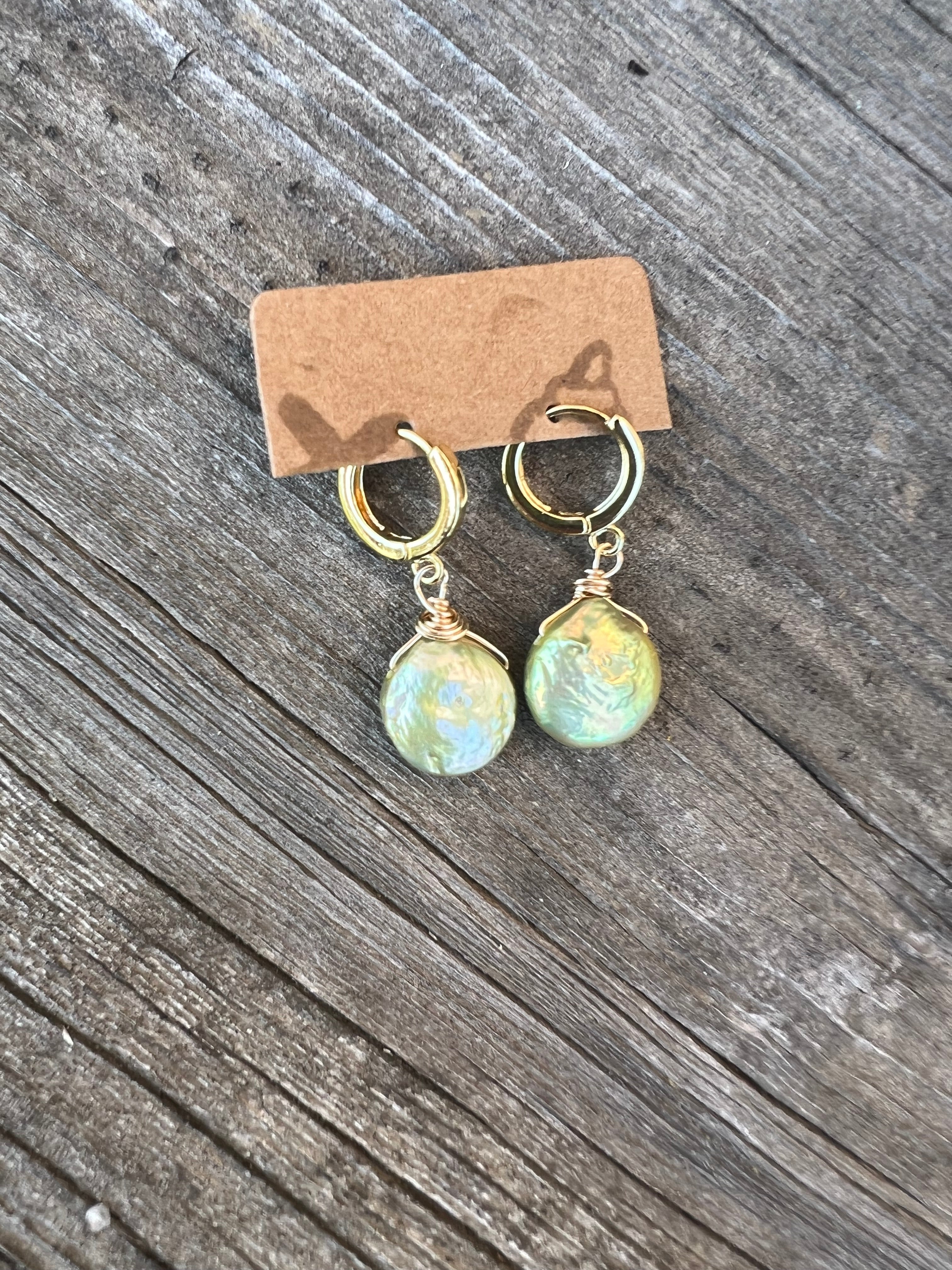 Gold filled 13mm huggies with hatch closure. Featuring green baroque coin pearls. Each Pearl is gold-filled wire wrapped. Each will be unique in size, shape, and color as pearls are one of a kind. Waterproof. Hypoallergenic. Non-tarnishing.