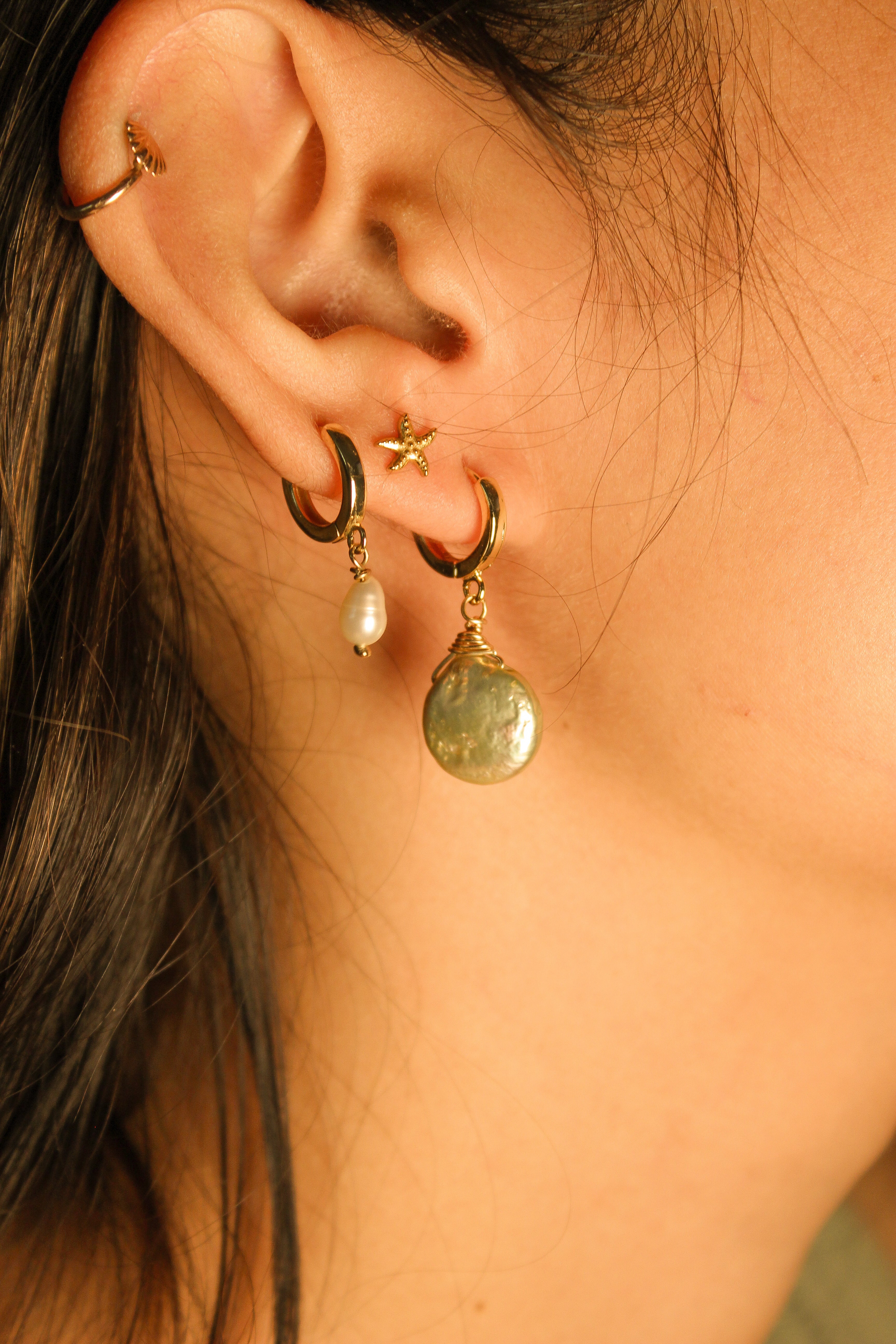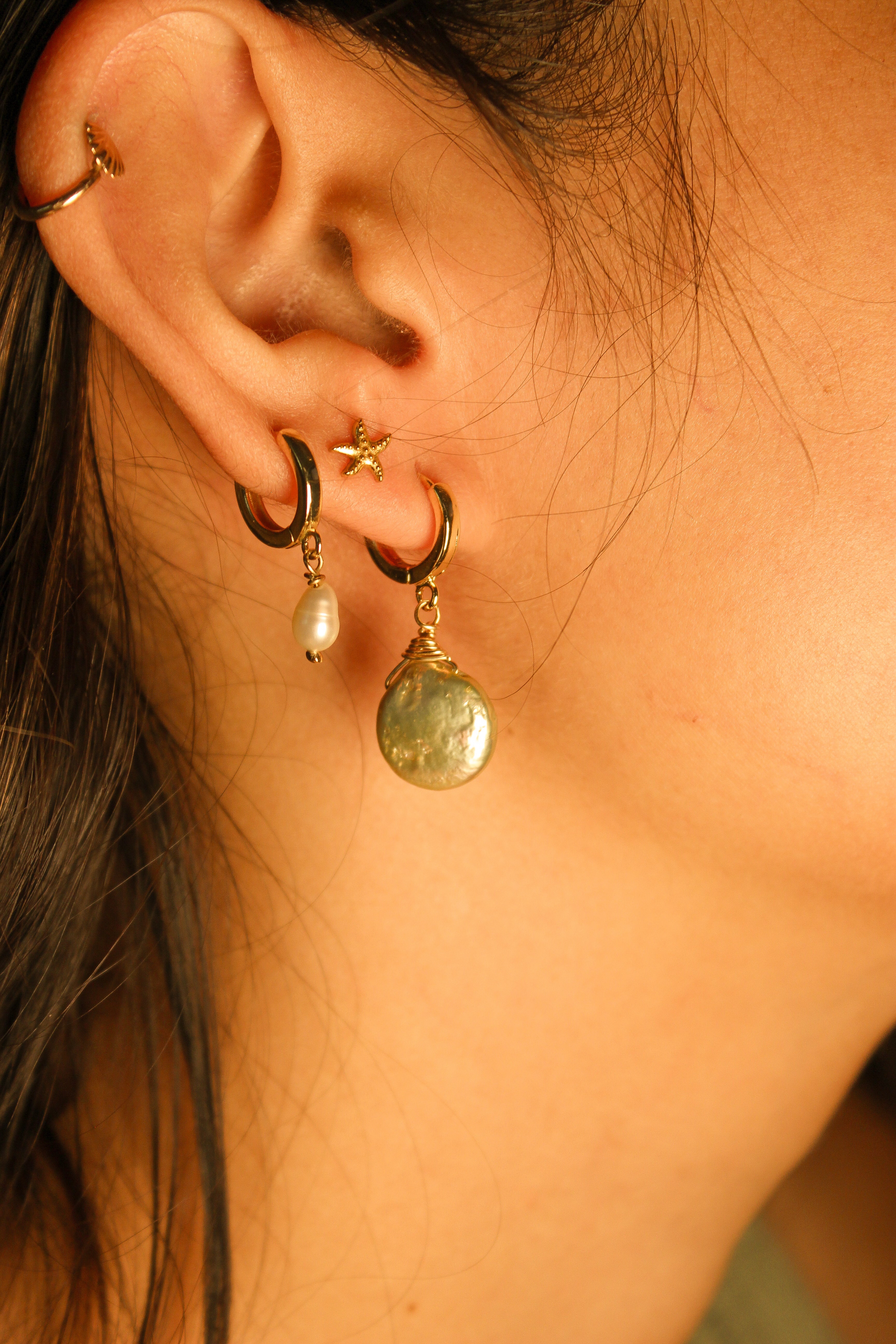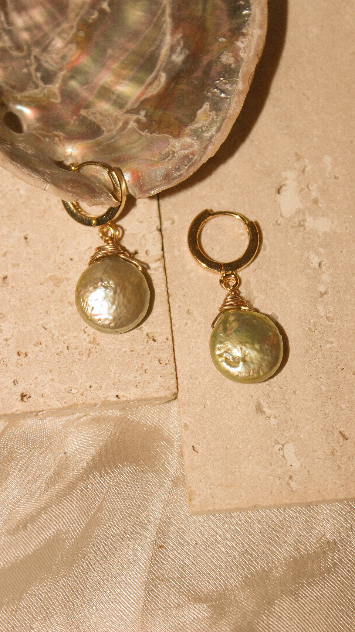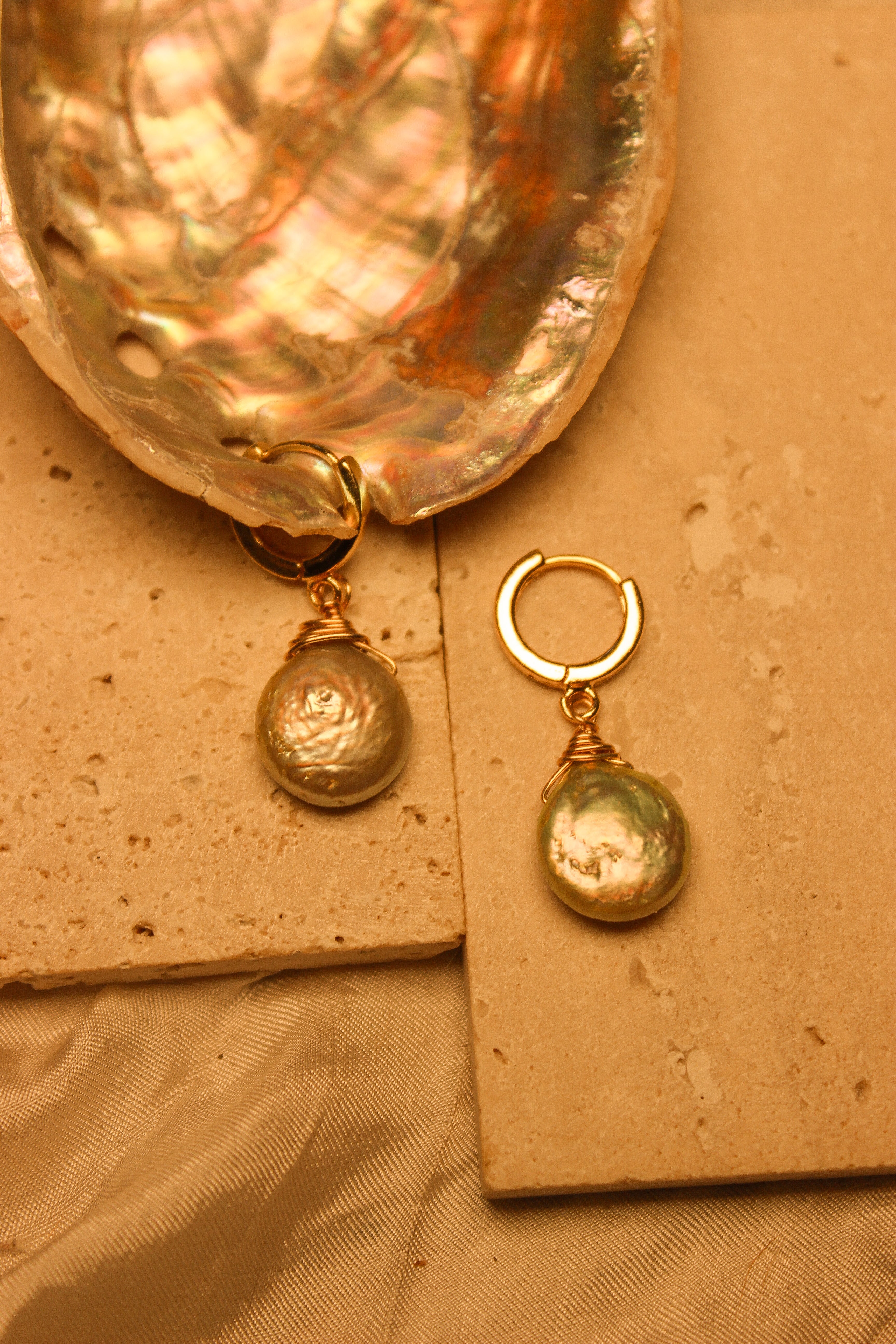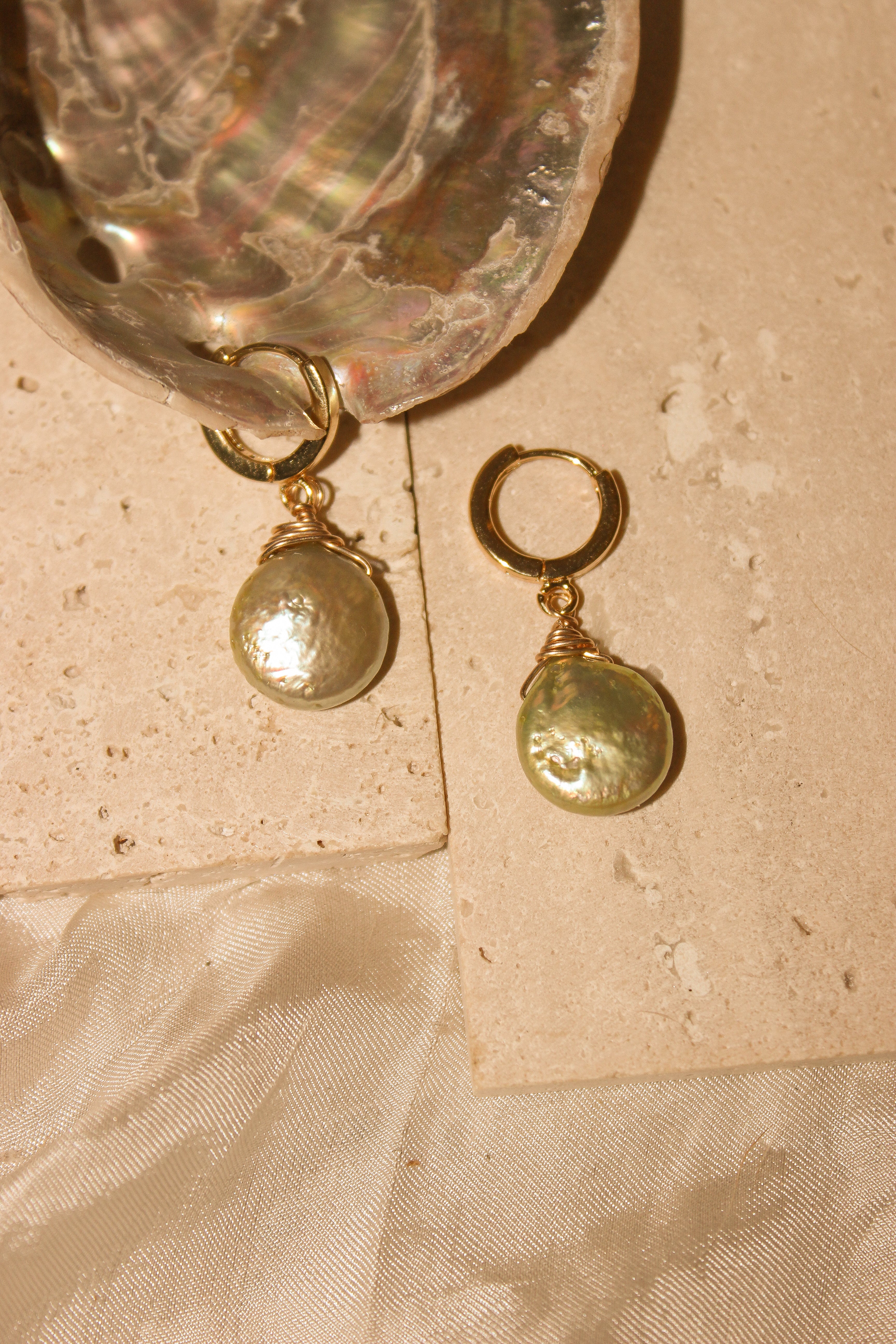 Gold filled 13mm huggies with hatch closure. Featuring green baroque coin pearls. Each Pearl is gold-filled wire wrapped. Each will be unique in size, shape, and color as pearls are one of a kind. Waterproof. Hypoallergenic. Non-tarnishing.