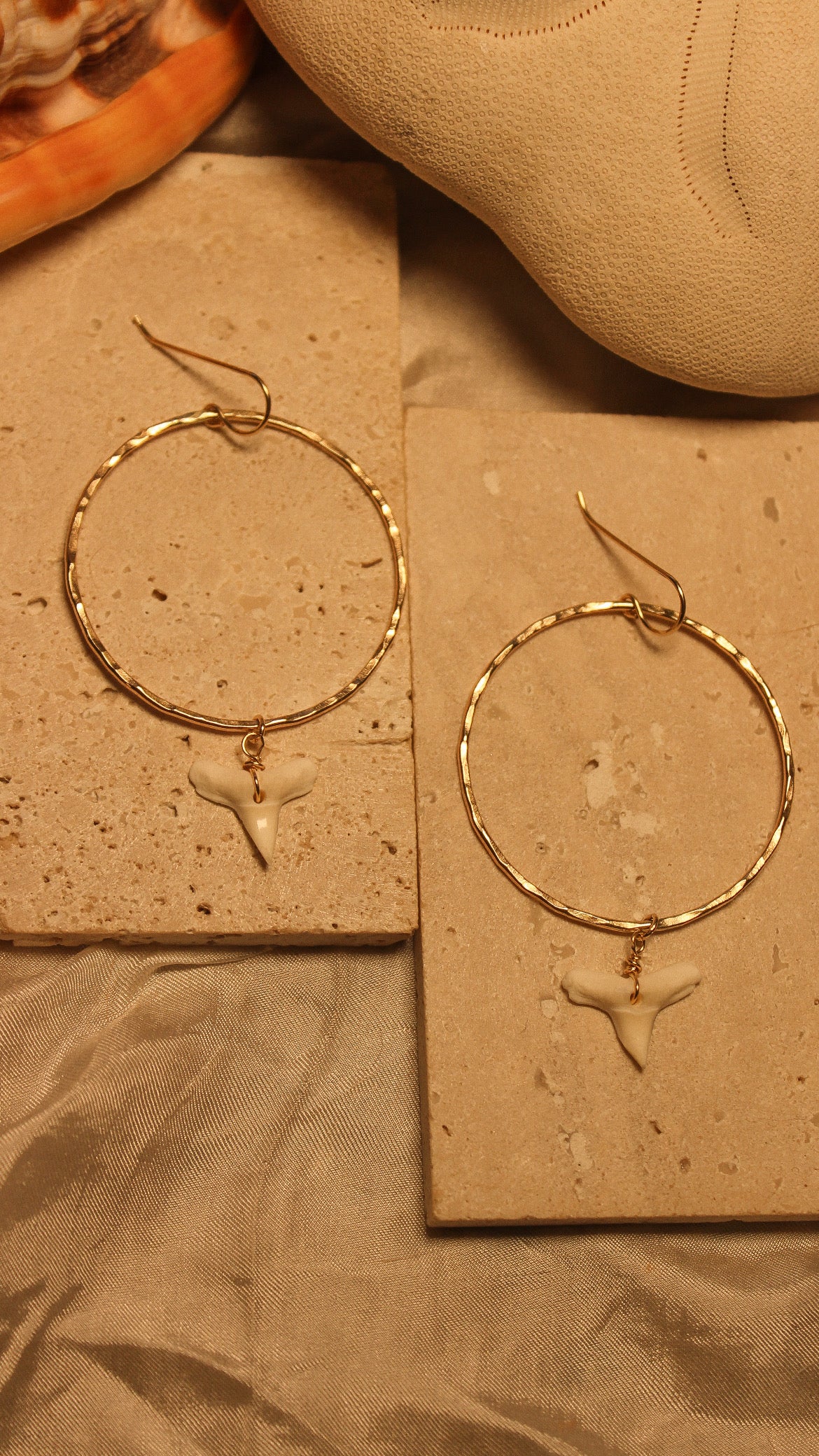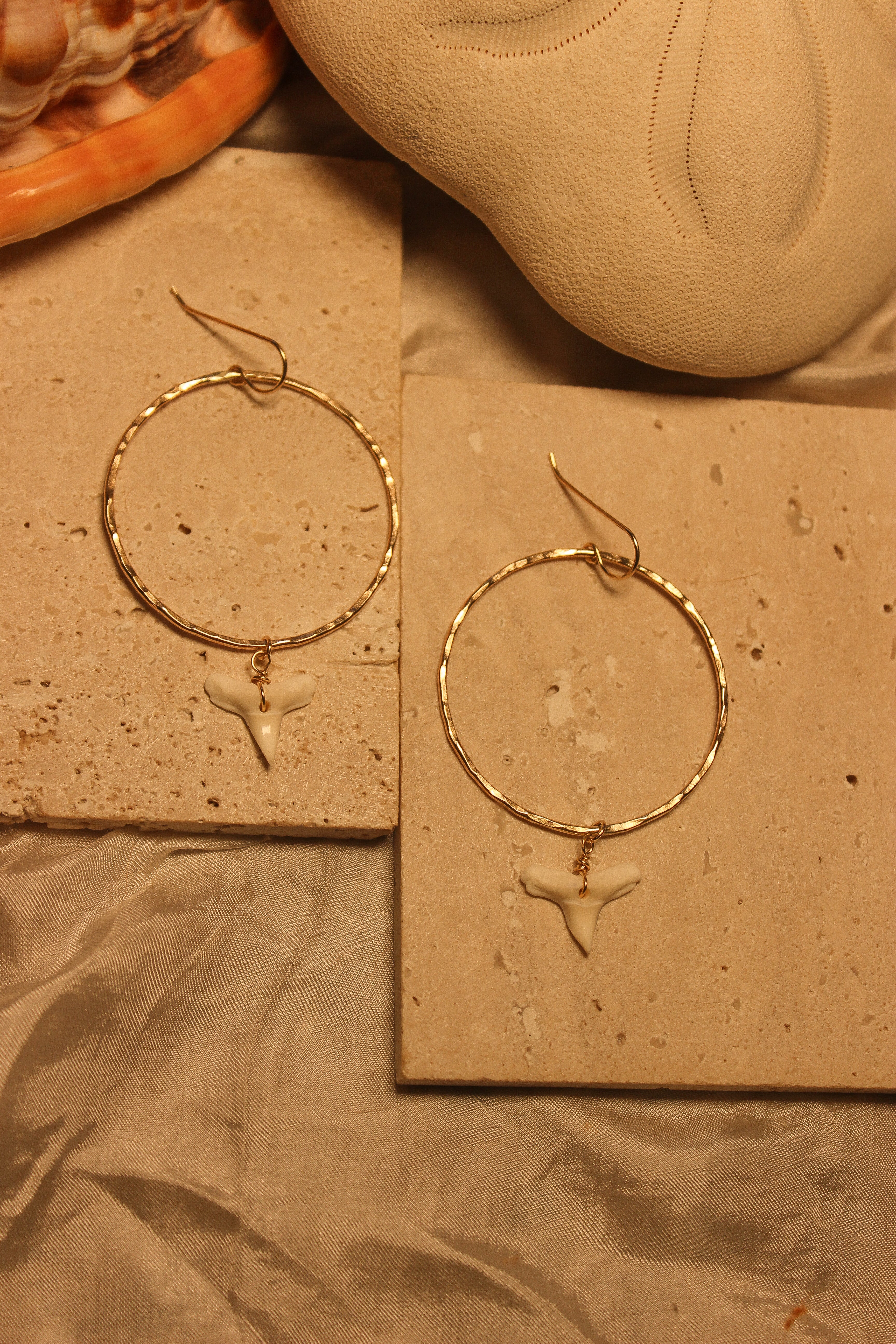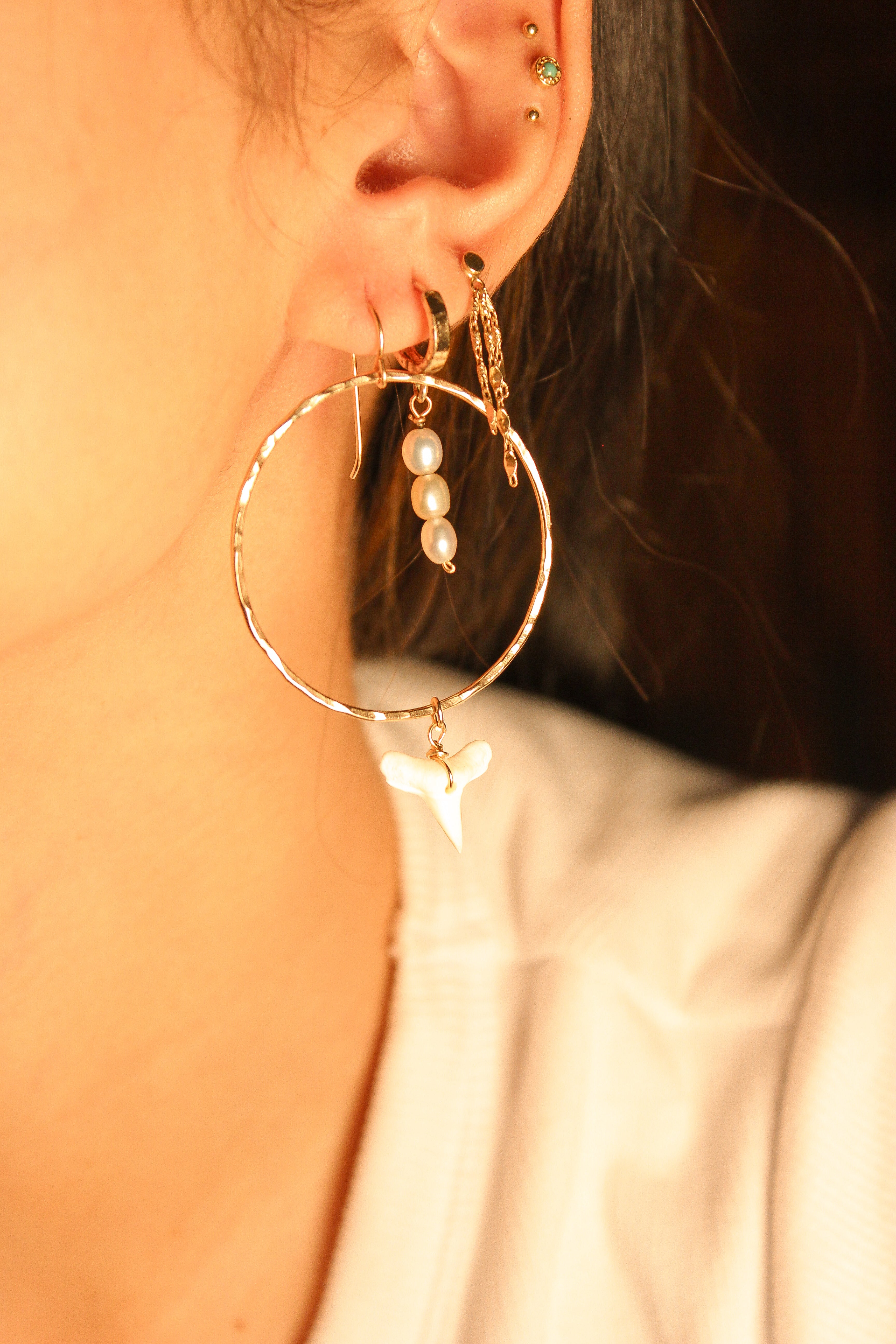 A coastal statement with a clean edge. These 5” hammered gold filled hoops are water resistant and lightweight, designed to shine through sun, salt, and long beach days. Finished with a single white shark tooth charm, they bring just the right amount of bold to your seaside style.