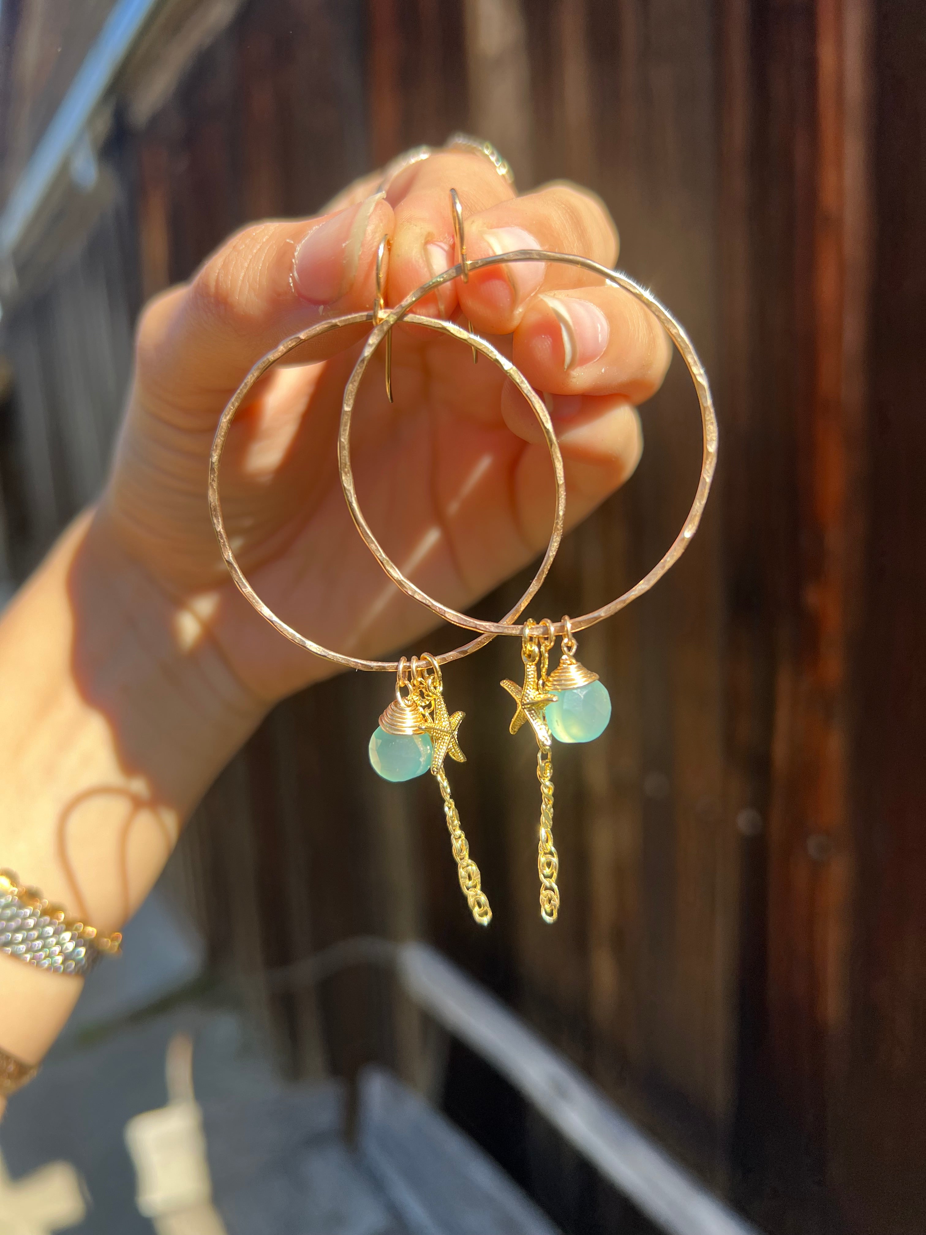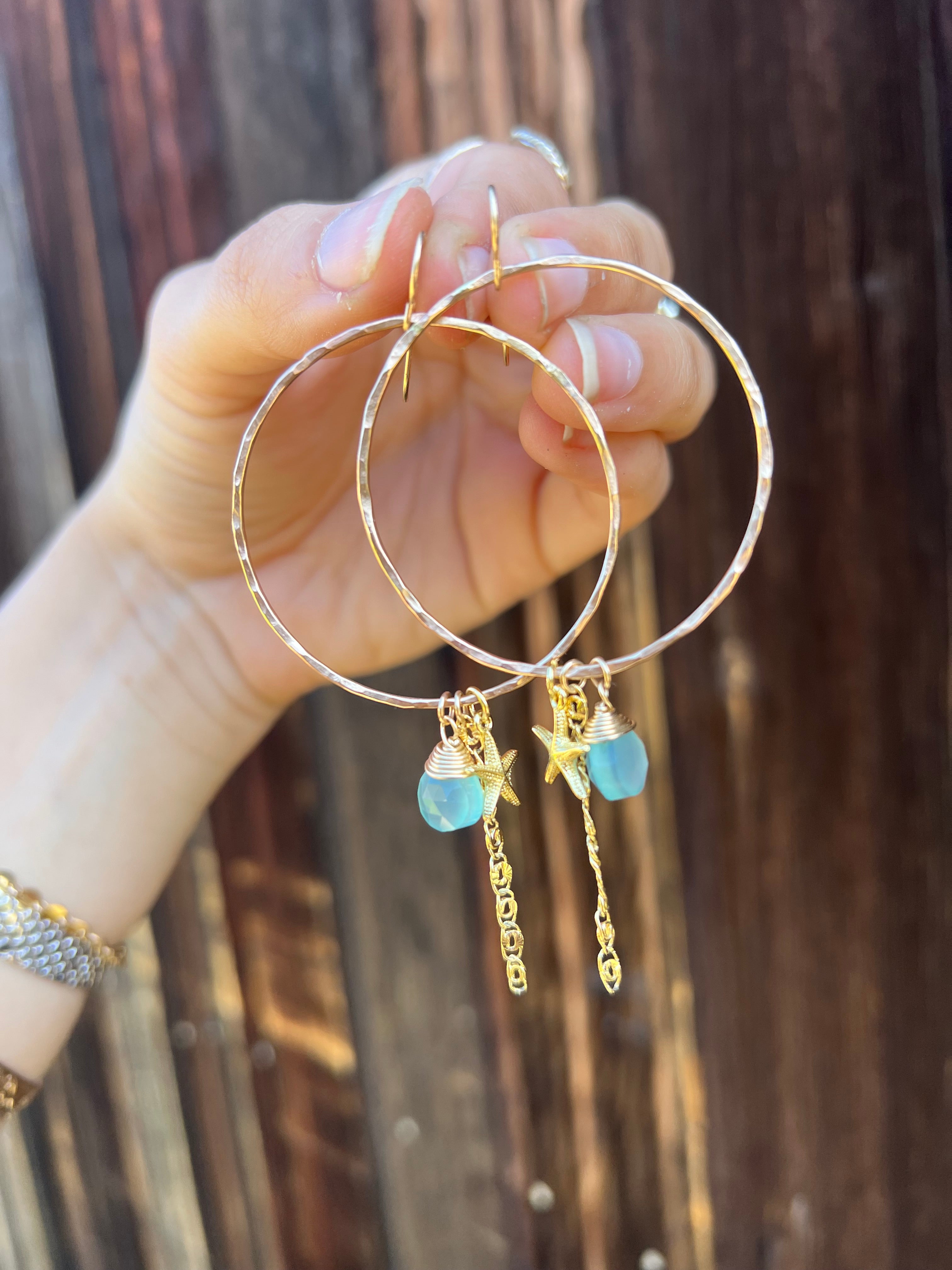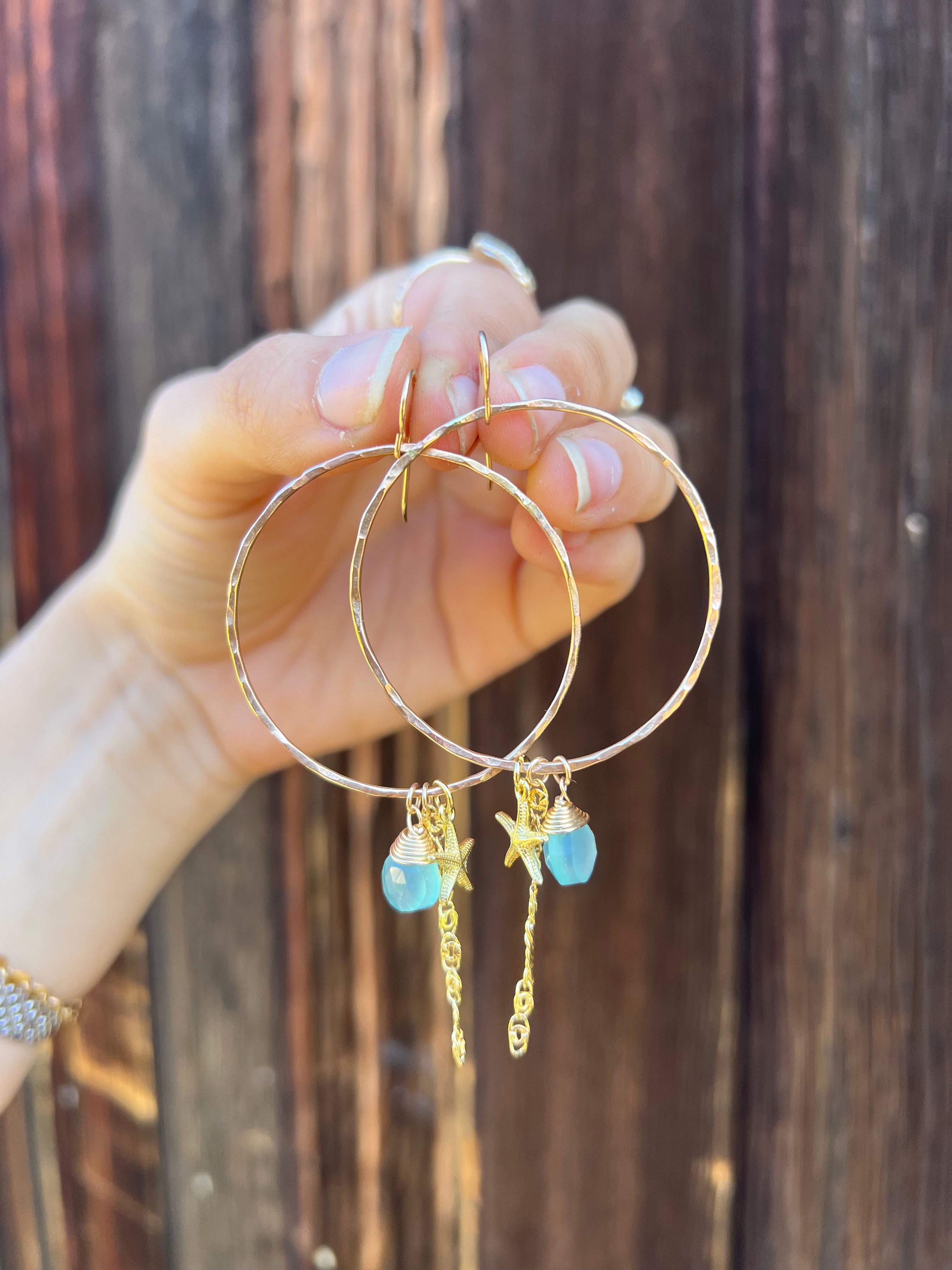 Expertly crafted with blue gold-filled wrapped stones and delicate but sturdy hammered gold-filled hoops, this stunning piece also features gold-filled chain and starfish charms for an elegant touch. Hypoallergenic ear wires ensure comfort for all-day wear. A must-have for any jewelry collection.