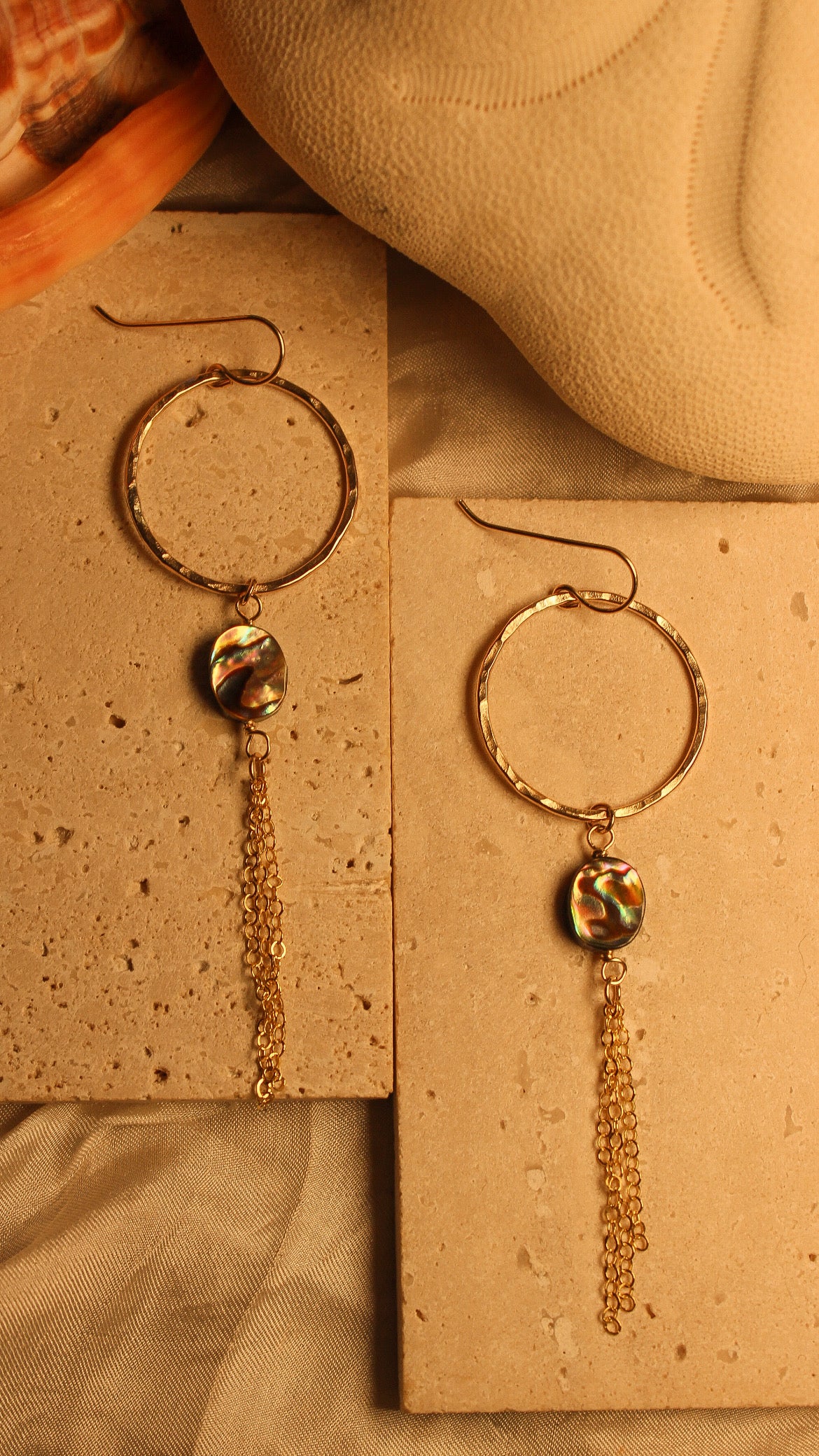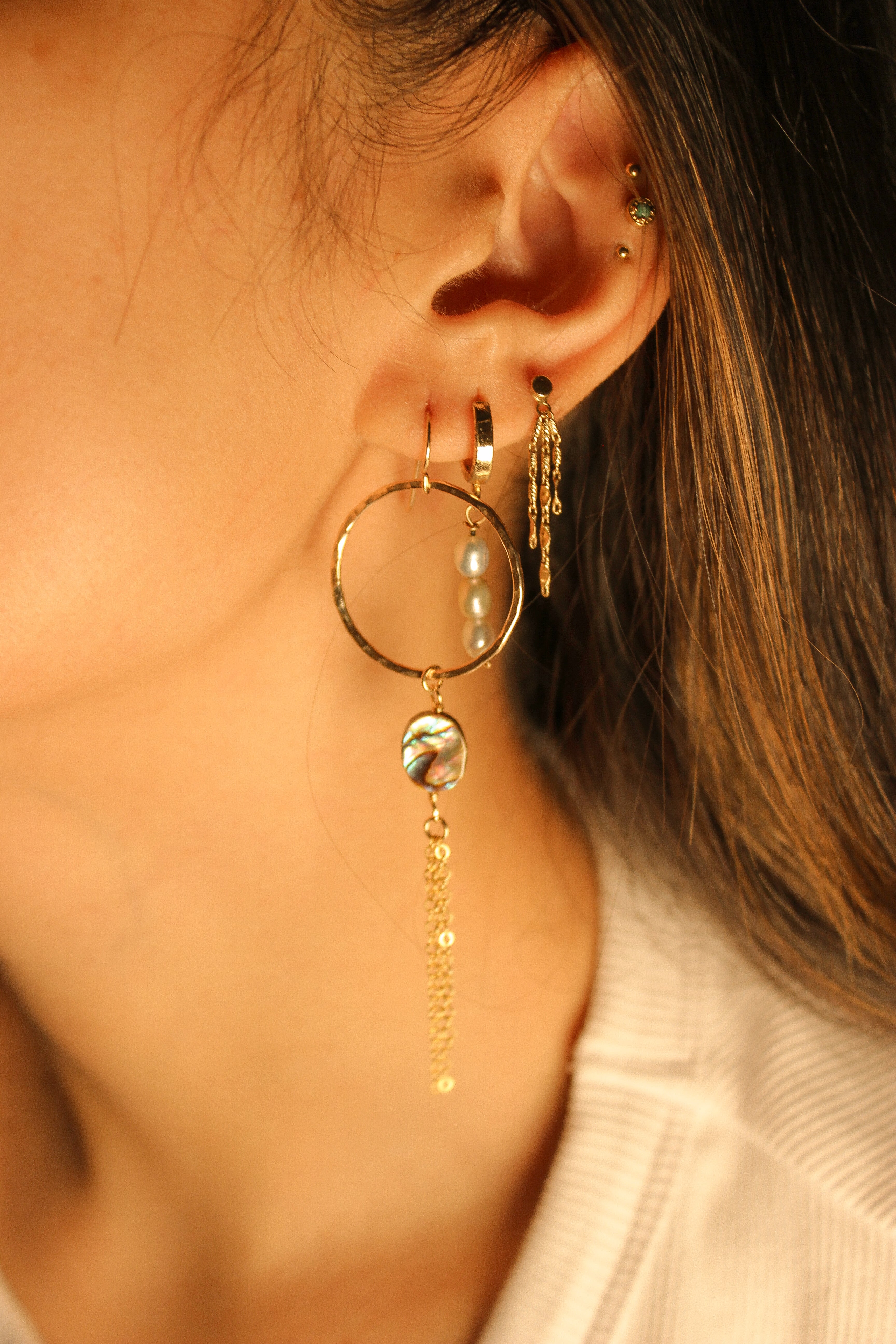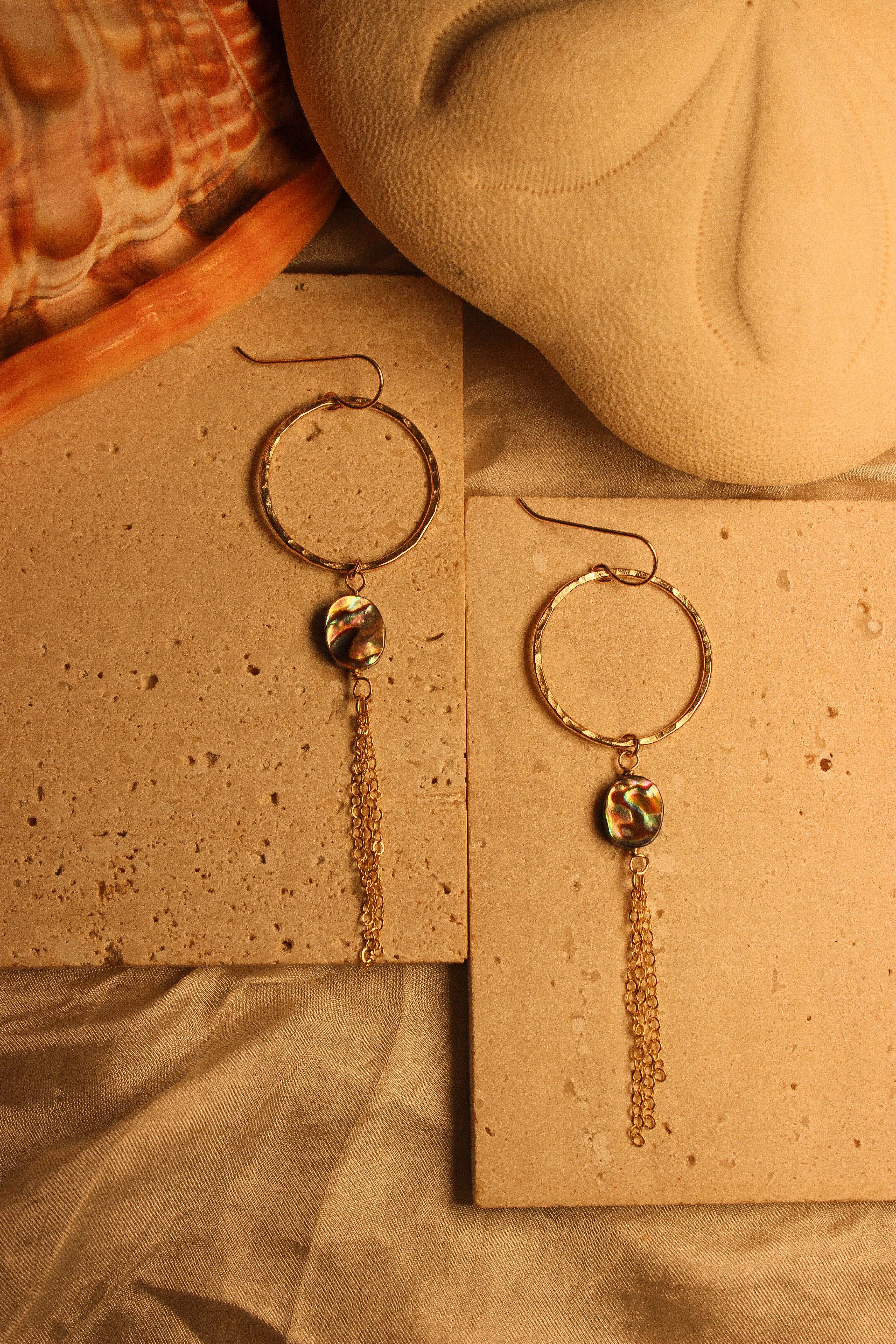 Indulge in luxury with our Nariali Abalone Hoops. Crafted with gold fill, these mini hammered texture hoops feature small oval abalone and tassel chain for a touch of elegance. Elevate any outfit with these beautiful and unique earrings.