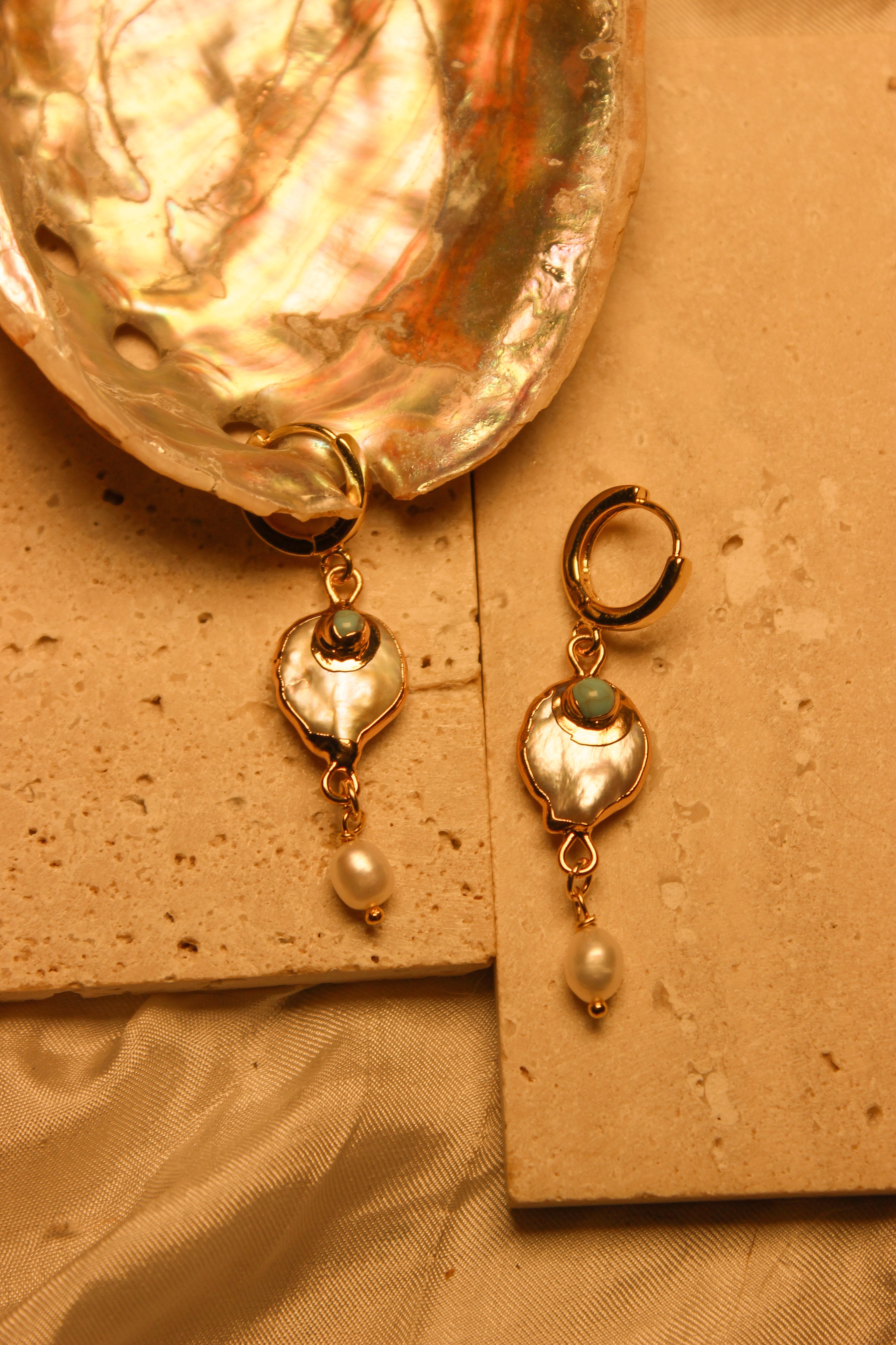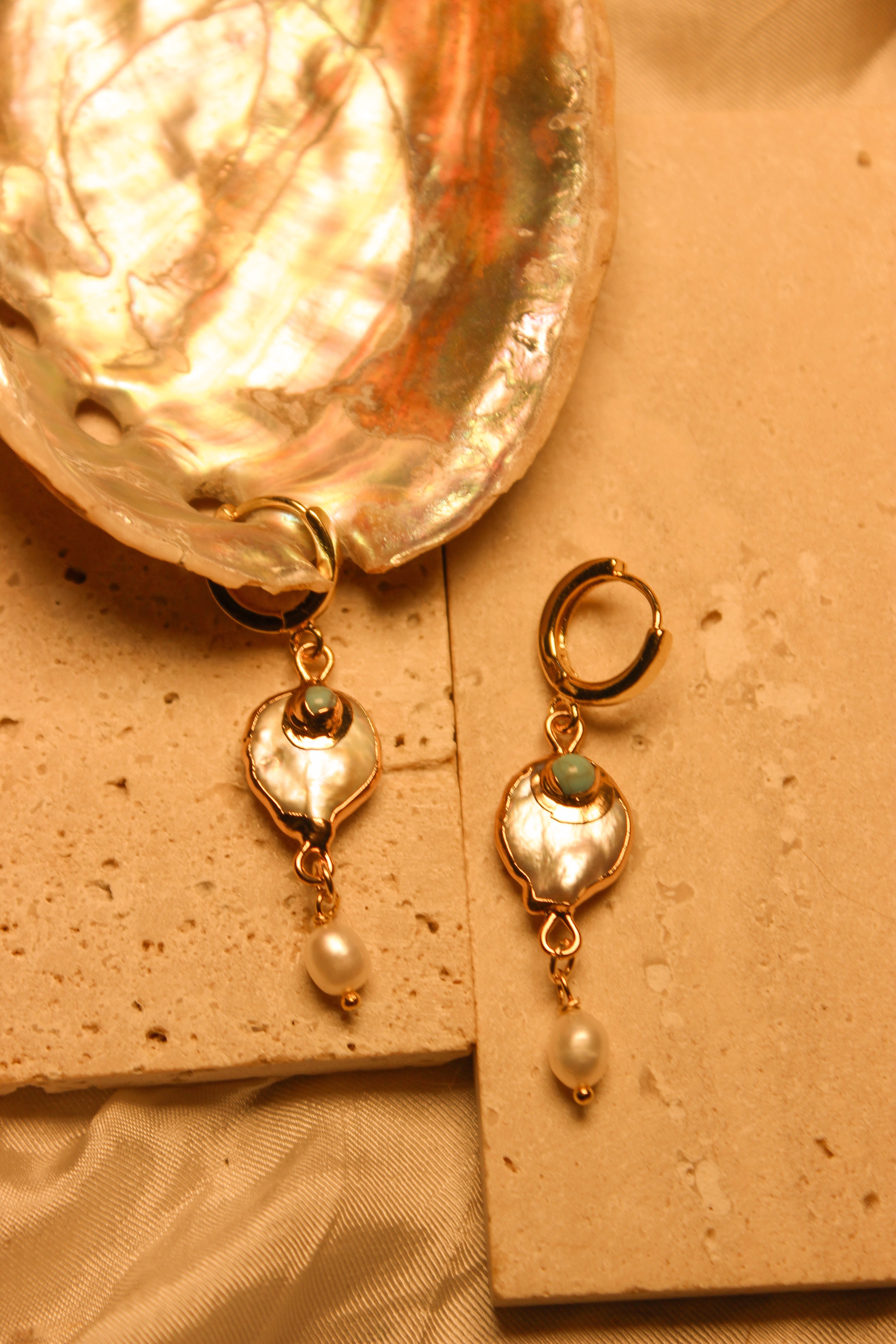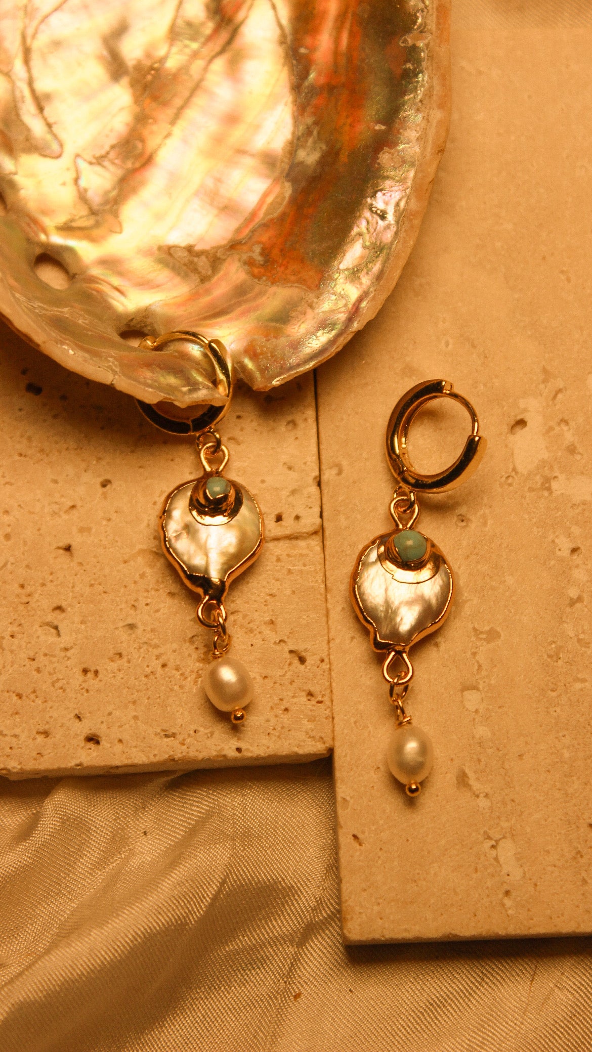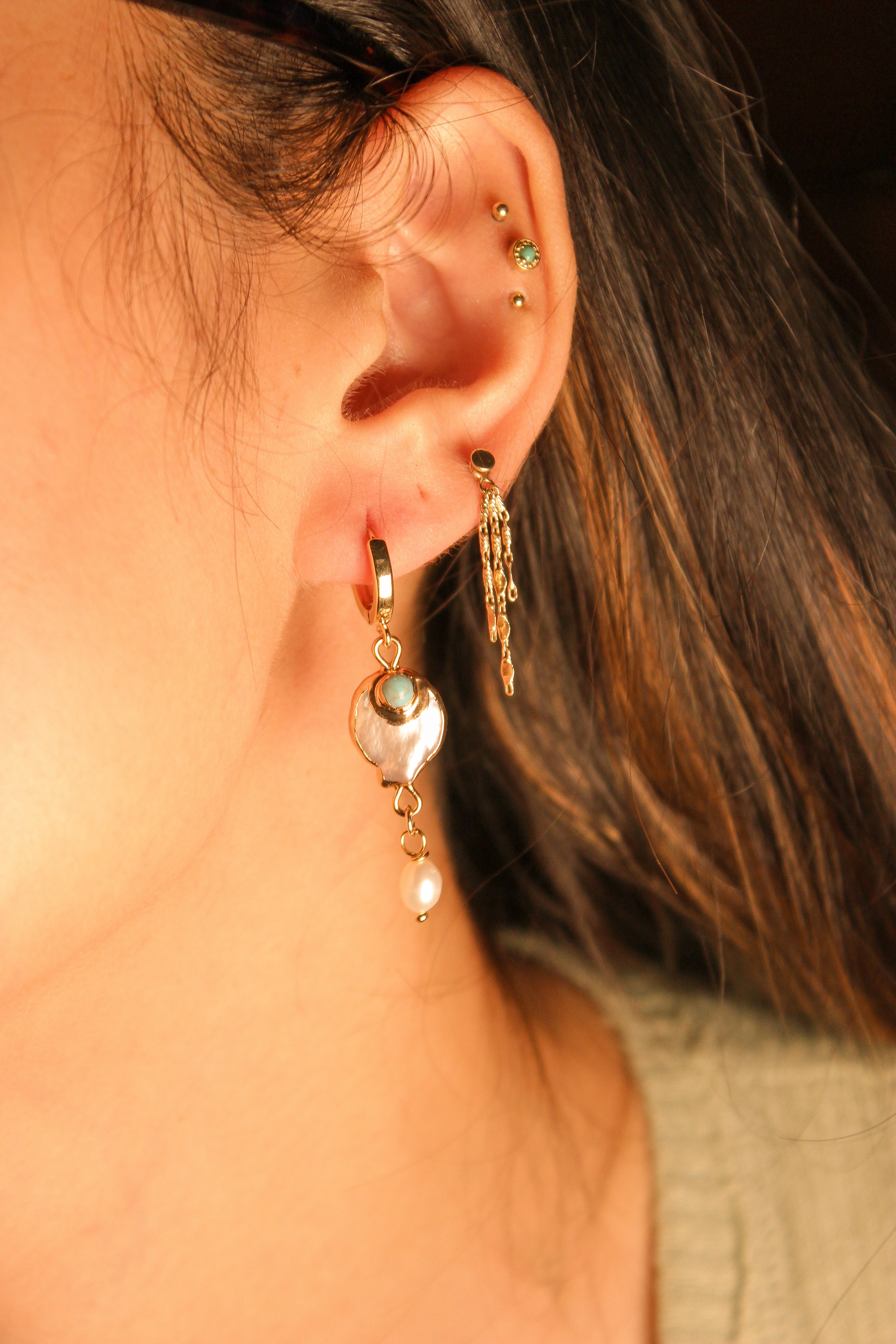 A quiet shimmer, like moonlight on low tide. These gold filled huggies feature a luminous oyster-inspired charm, finished with a freshwater pearl drop and a soft blue electroplated stone at the top. While the huggies are water resistant, the top stone is not recommended for chemical or saltwater contact — treat it gently to keep the glow. Dreamy, lightweight, and made for slow days by the sea.
