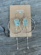 Medium 14k gold filled hammered hoops featuring stacked sea glass pieces and a delicate pearl chain. Each pair is handmade in Santa Cruz with ocean-inspired materials.
