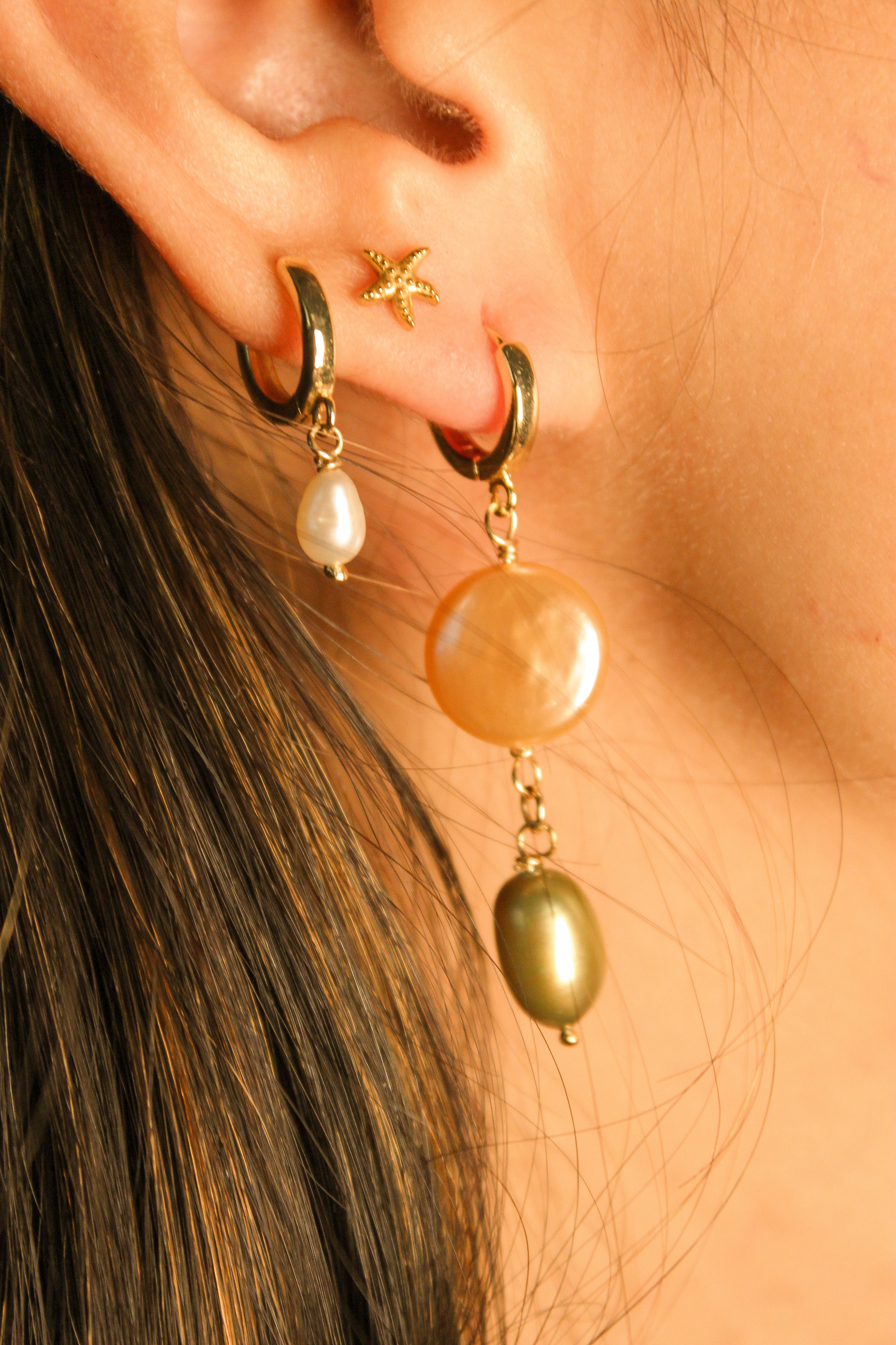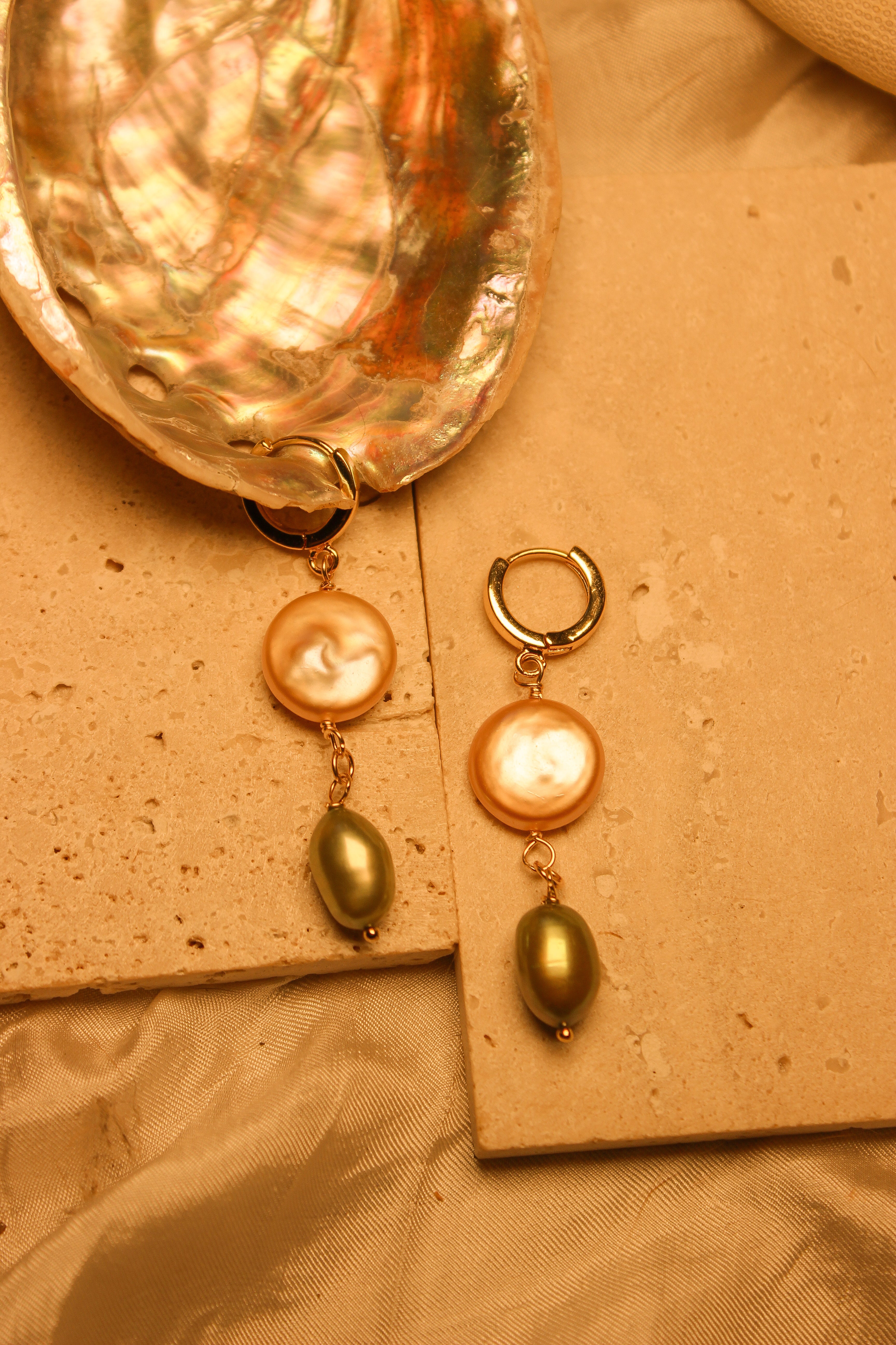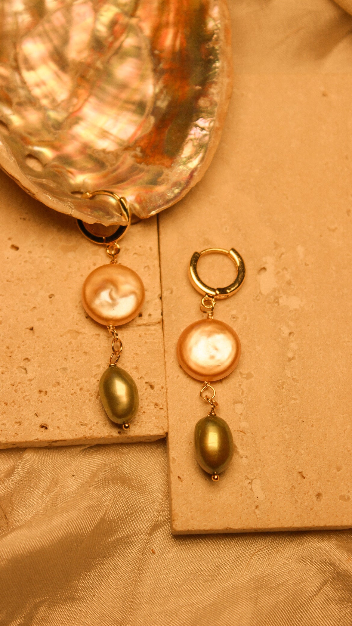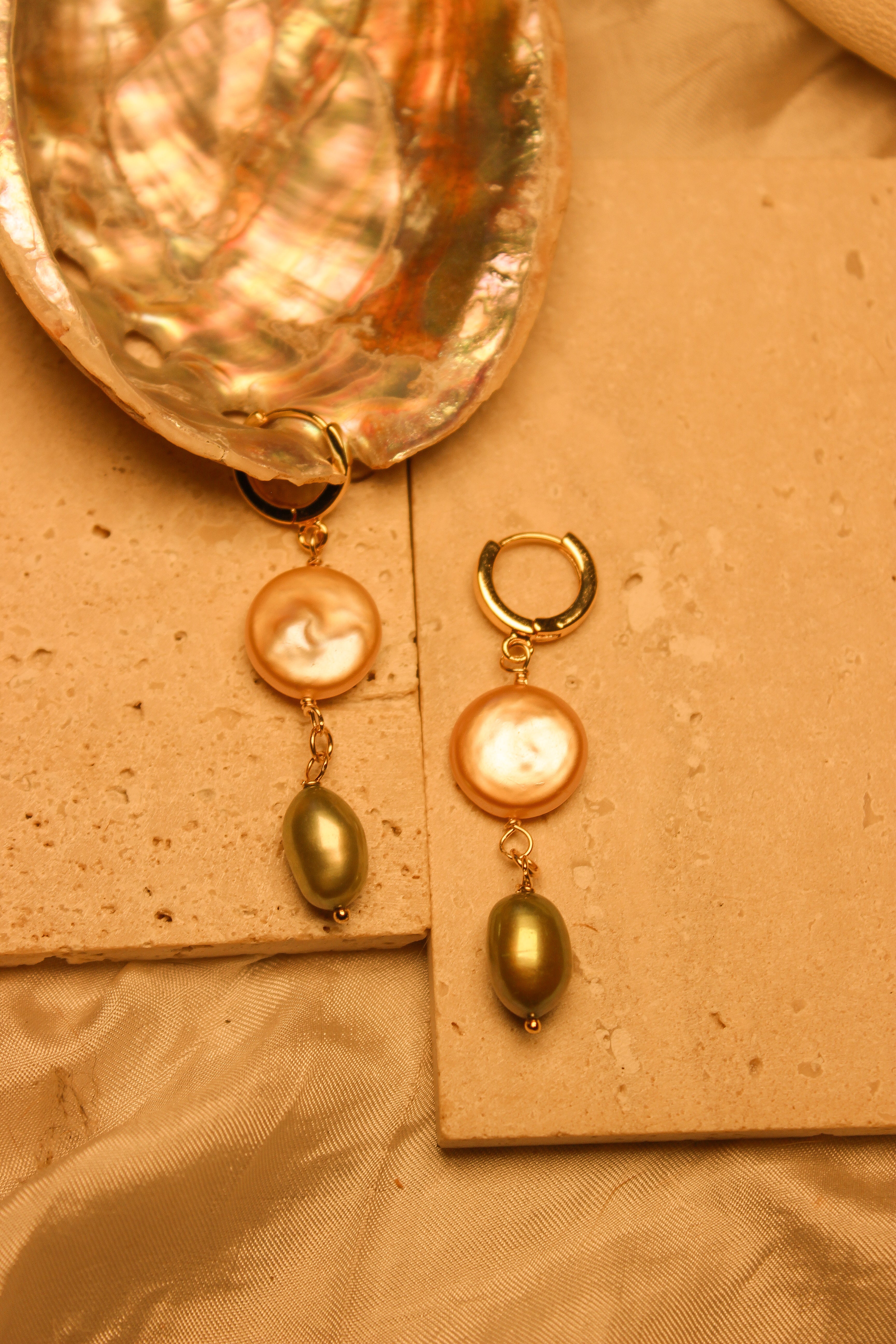 Soft glow, bold finish. These gold filled huggies snap securely in place and feature a luminous coin pearl paired with a rich olive-toned drop. Elegant but grounded, they echo that golden hour light — warm, flattering, and unforgettable. Water resistant and lightweight, they’re made to shine from salty mornings to candlelit nights.