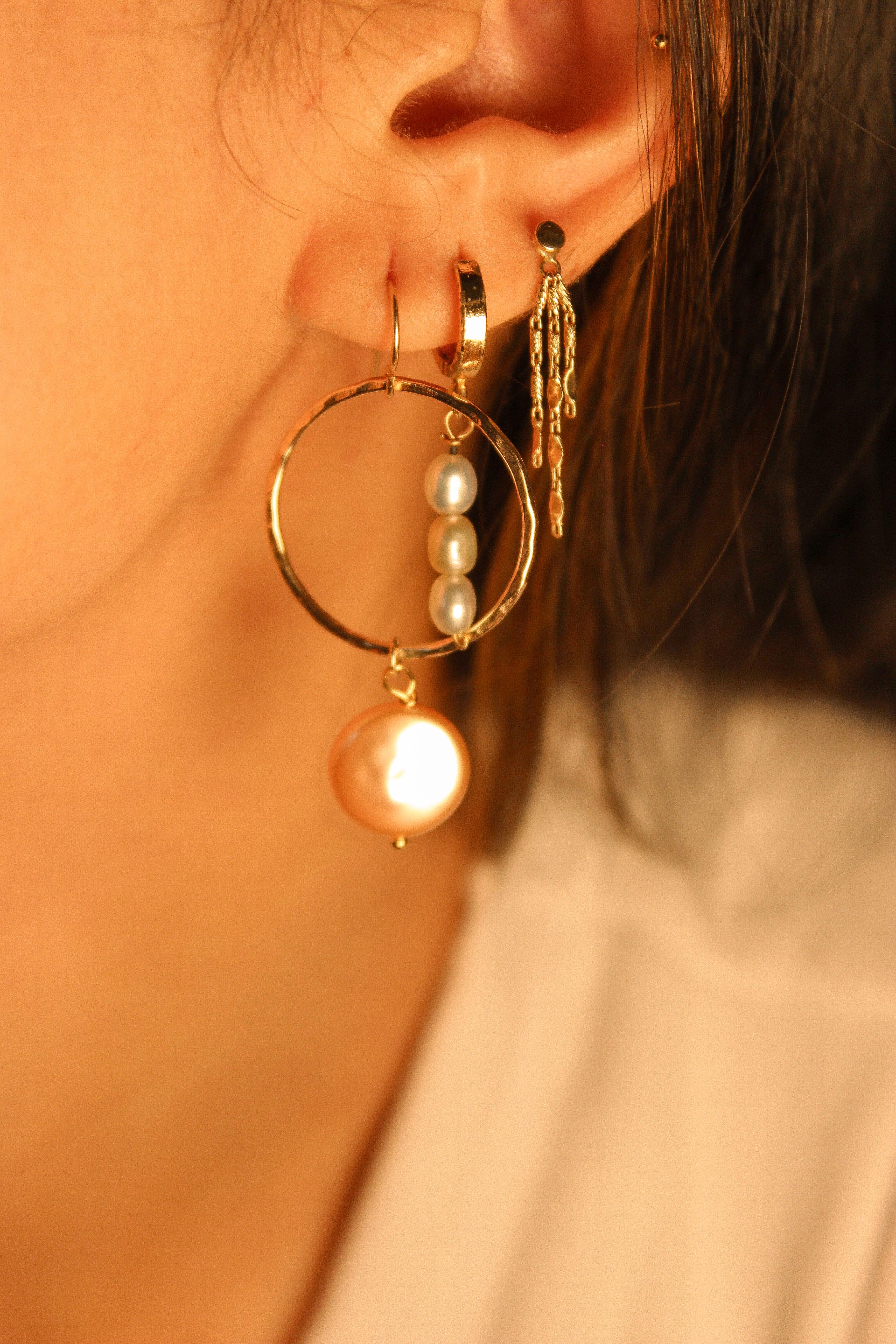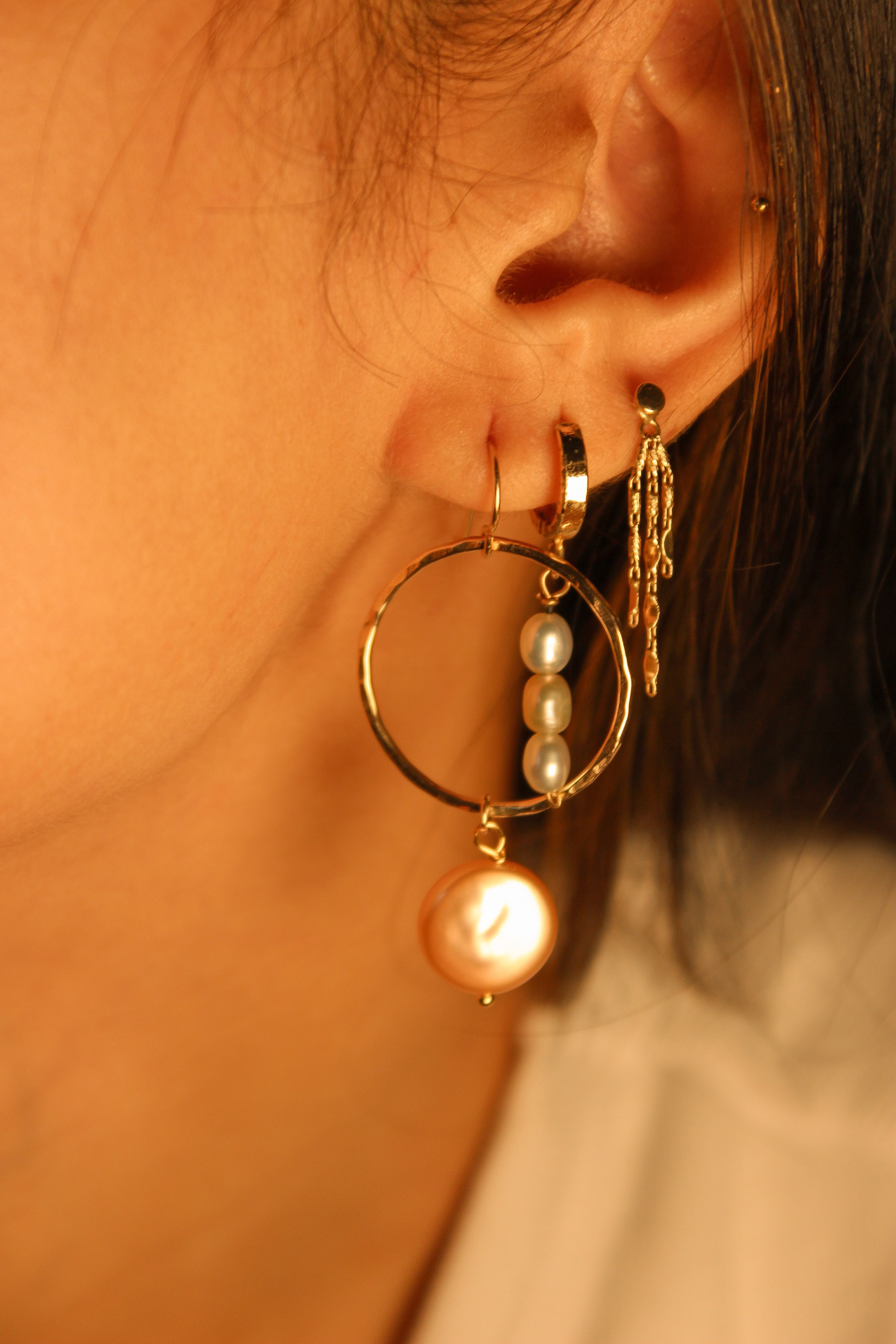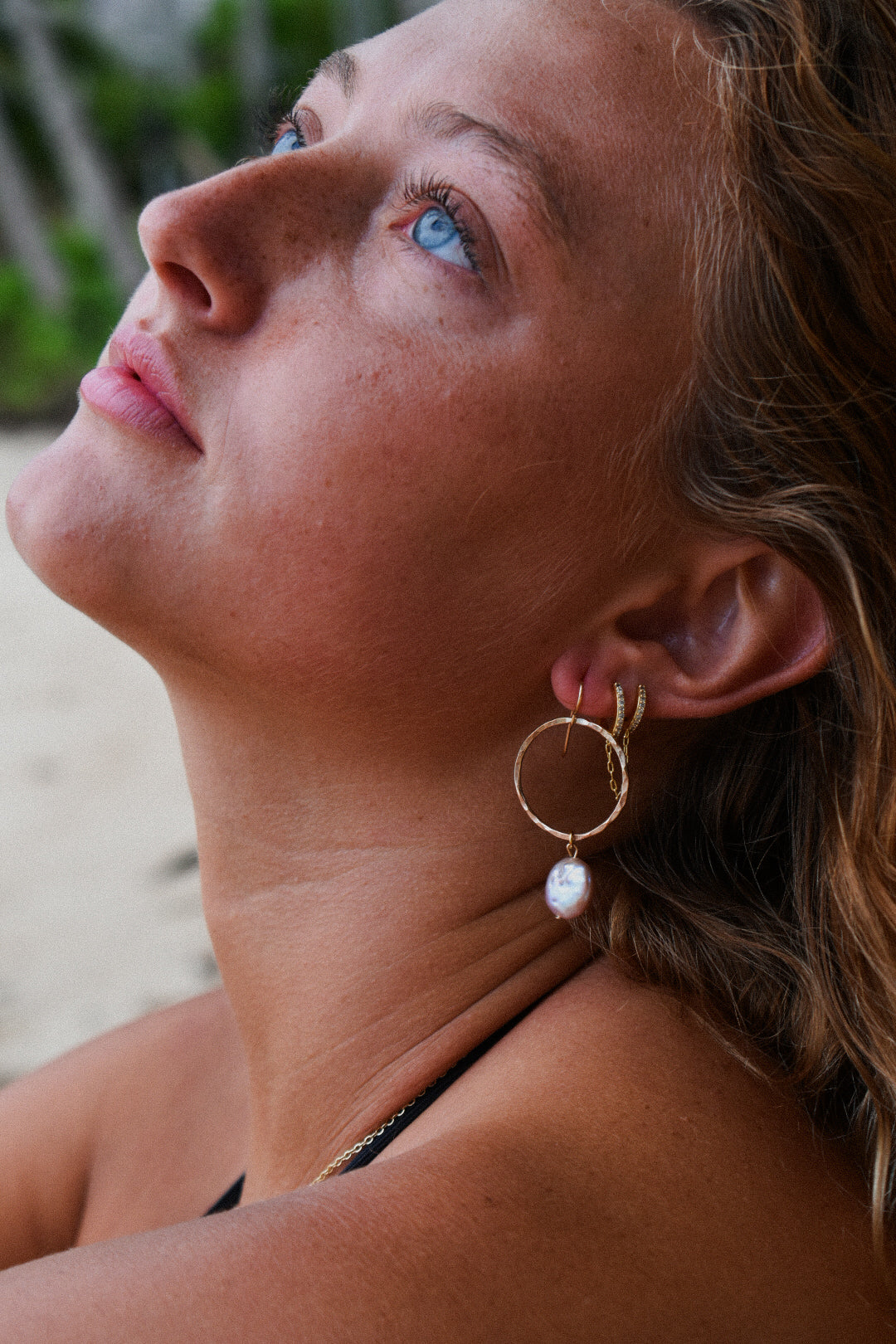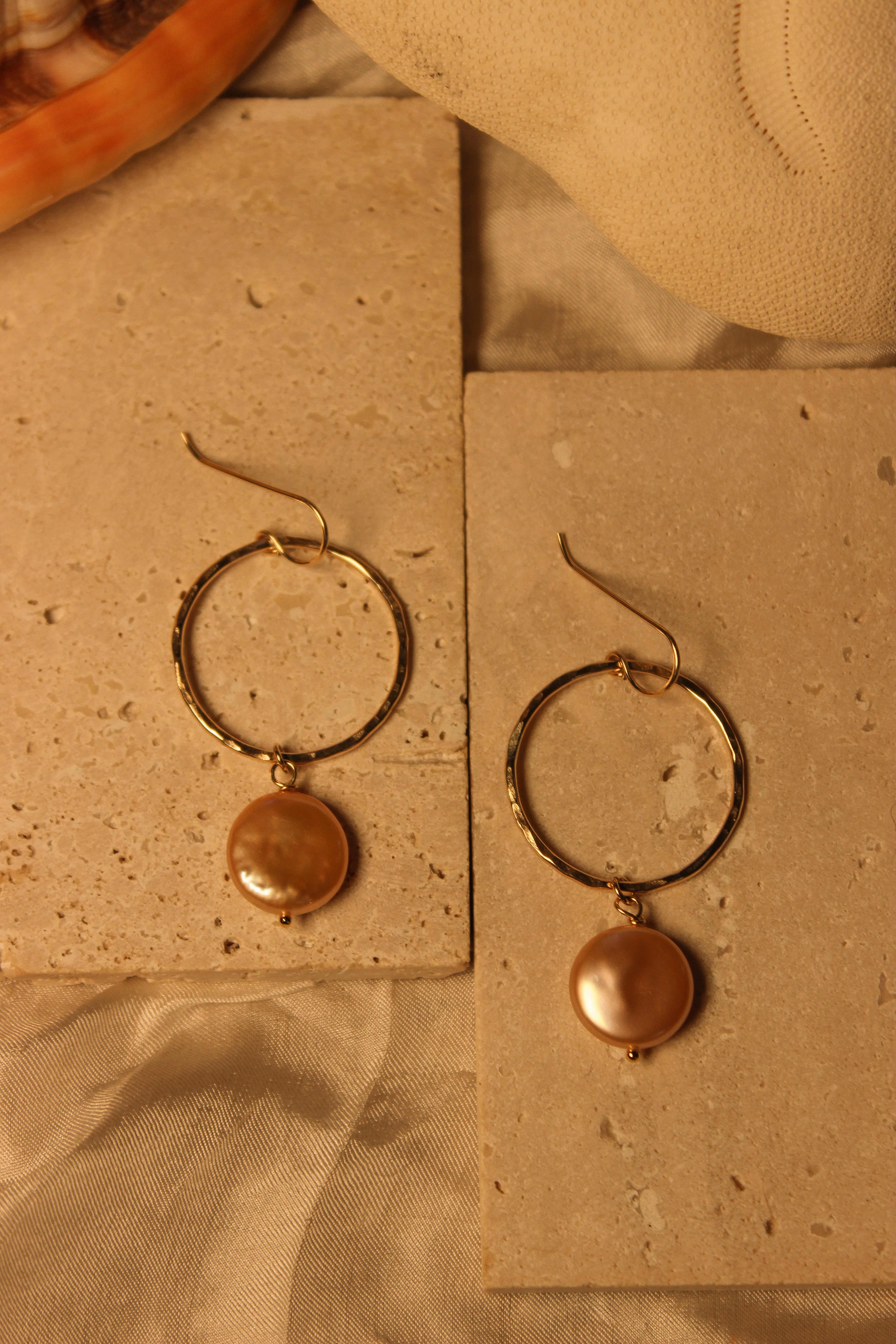 These Hoops are the perfect blend of elegance and simplicity. Crafted from high-quality gold filled or sterling silver, these mini hammered hoops feature a stunning pink iridescent baroque pearl. Elevate any outfit with these versatile and timeless hoops.
