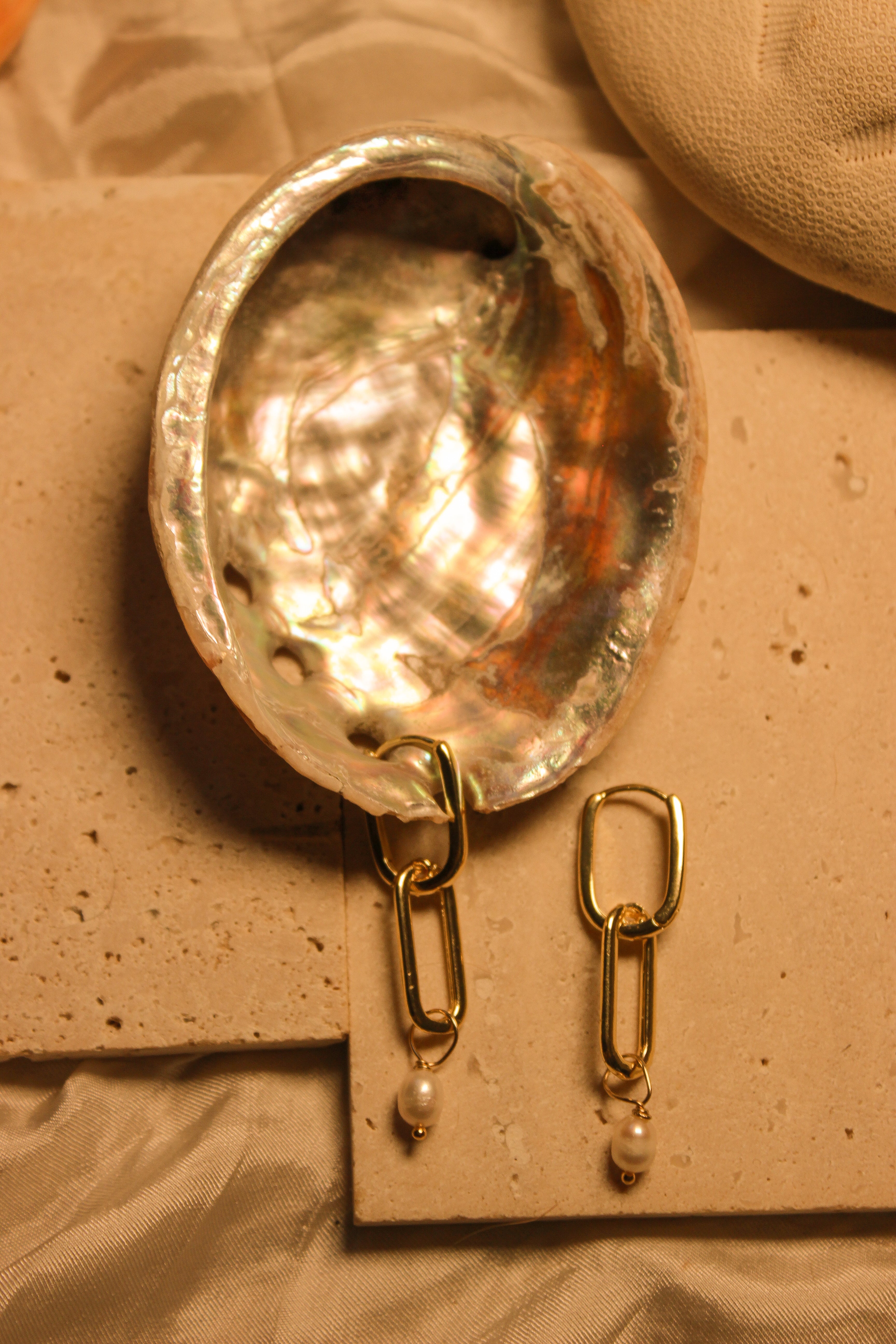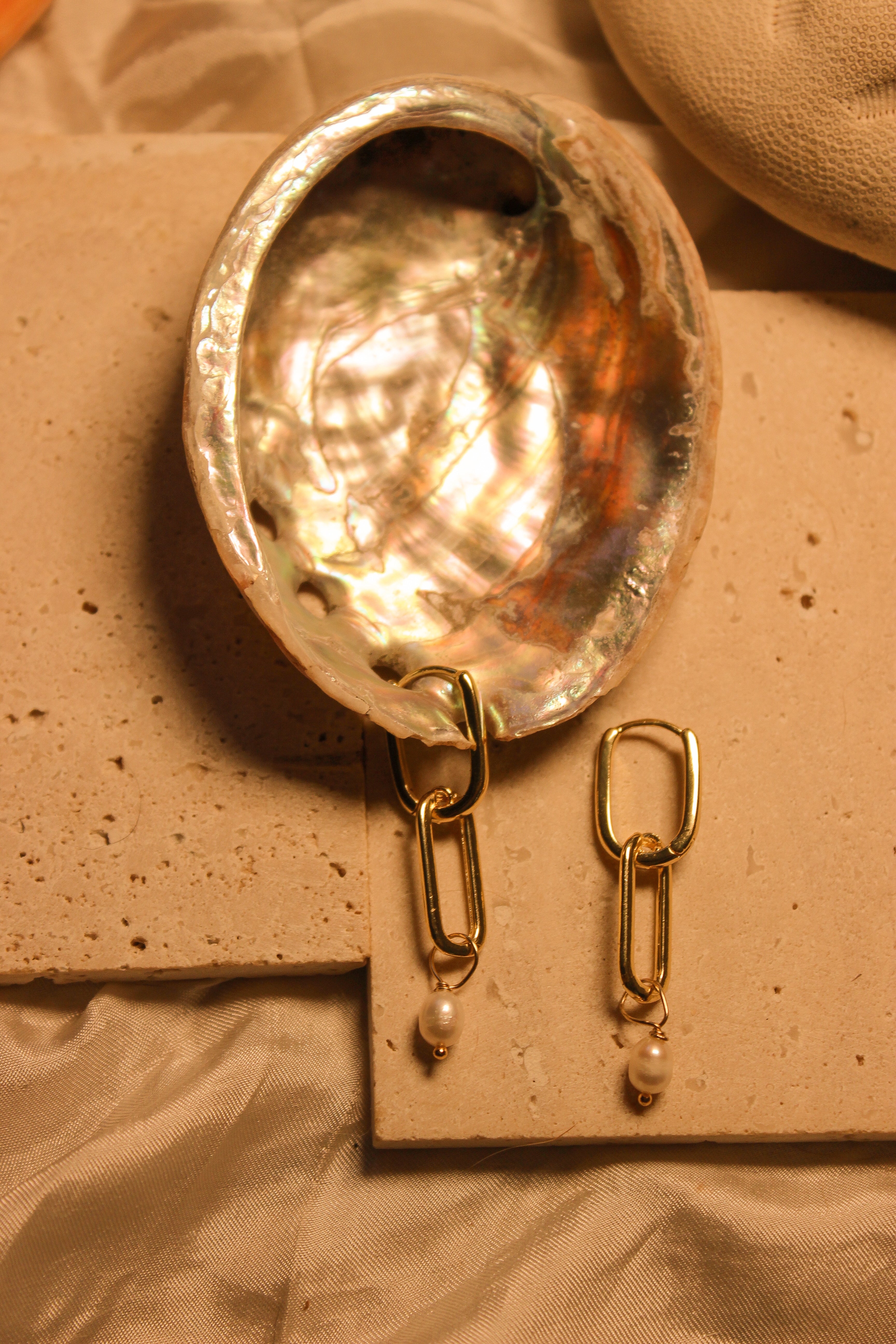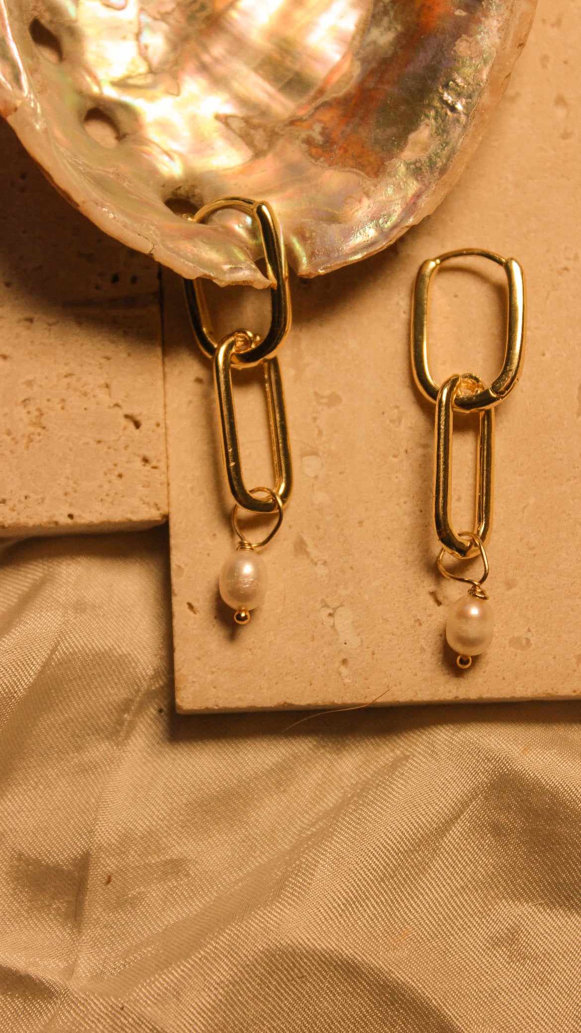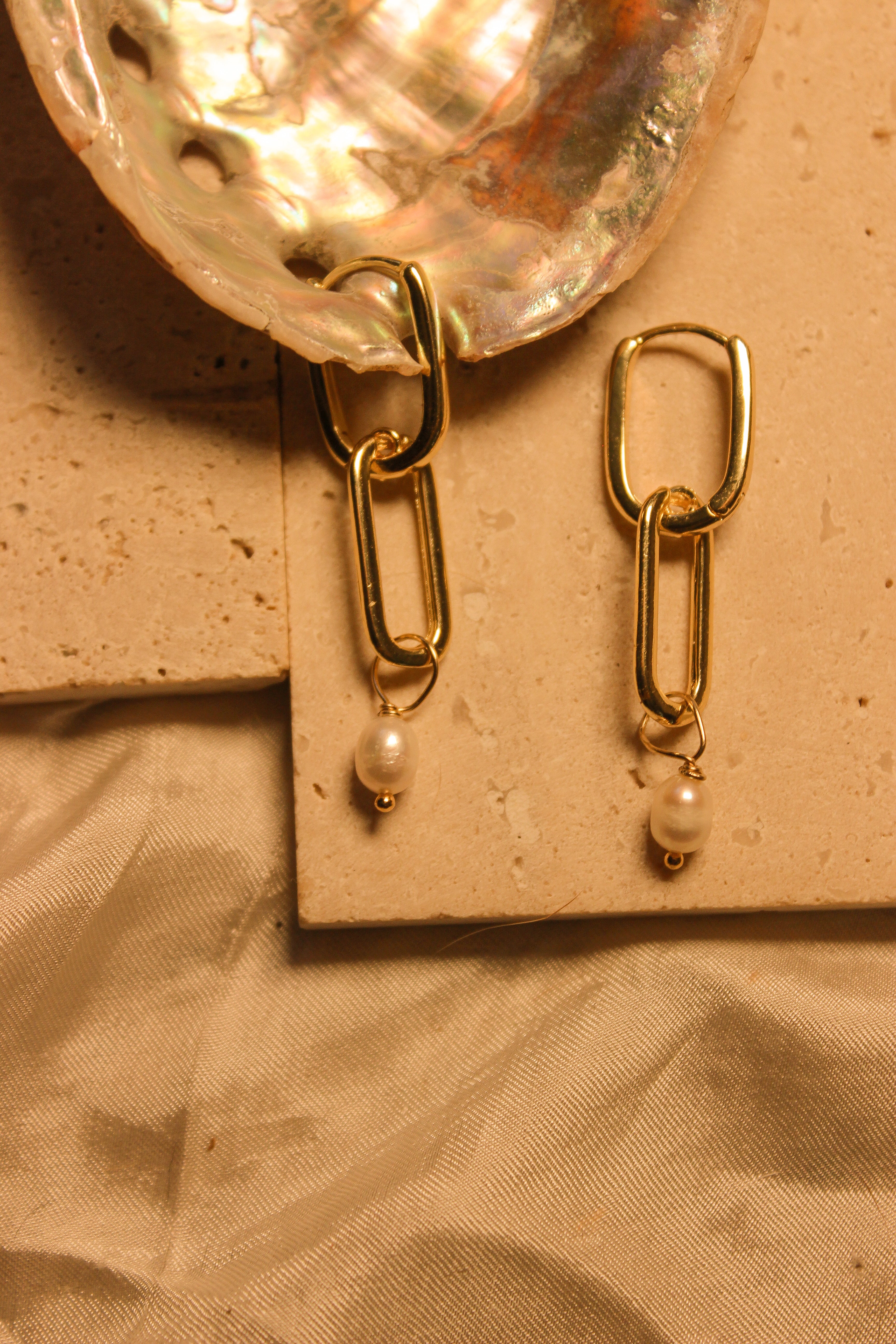 A bold drop of gold with a touch of tide. These statement earrings feature elongated gold filled links paired with a single freshwater pearl — minimal, luminous, and designed to move. Water resistant and lightweight, they’re made to carry you from breezy days by the sea to golden hour dinners.