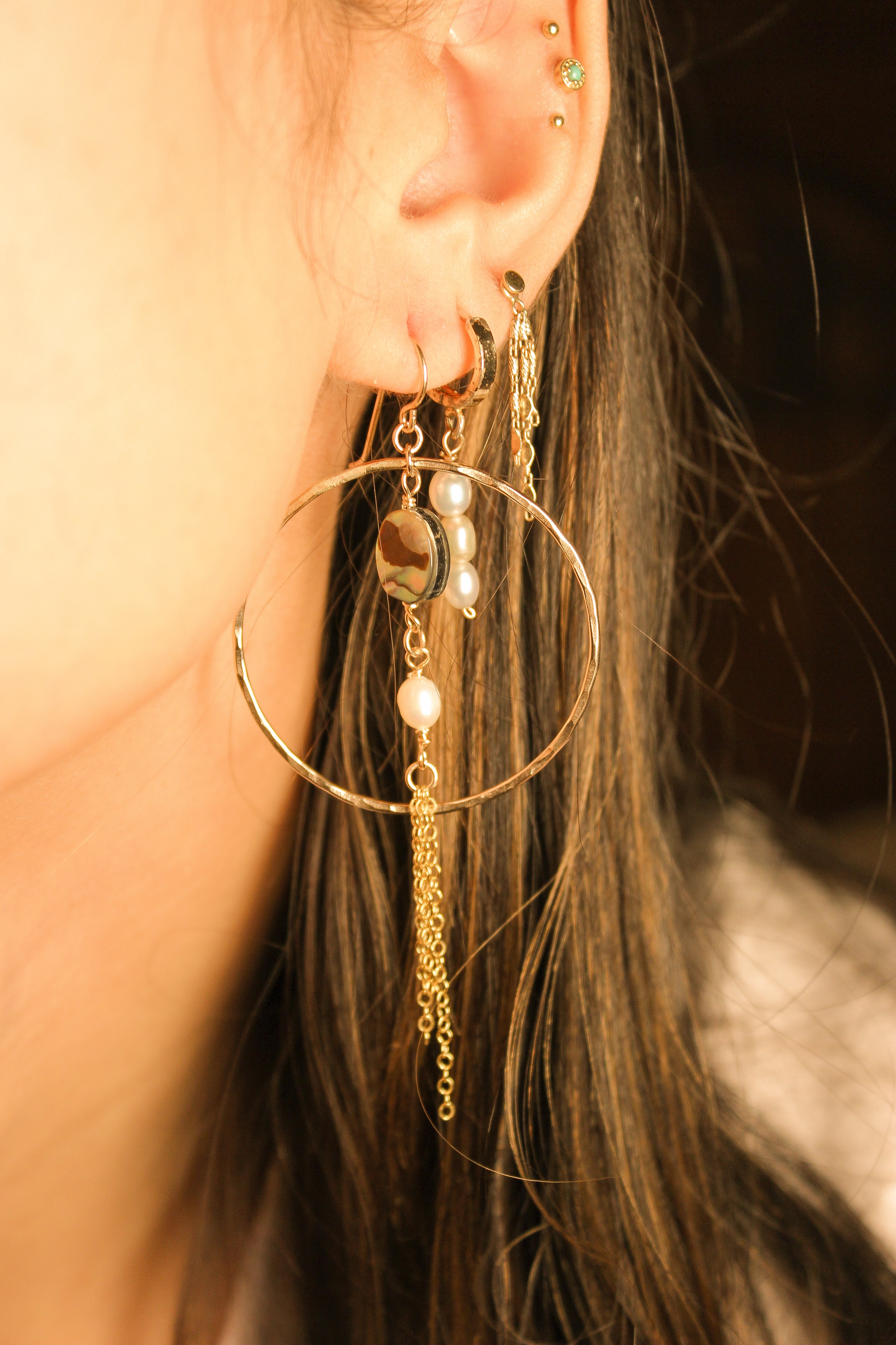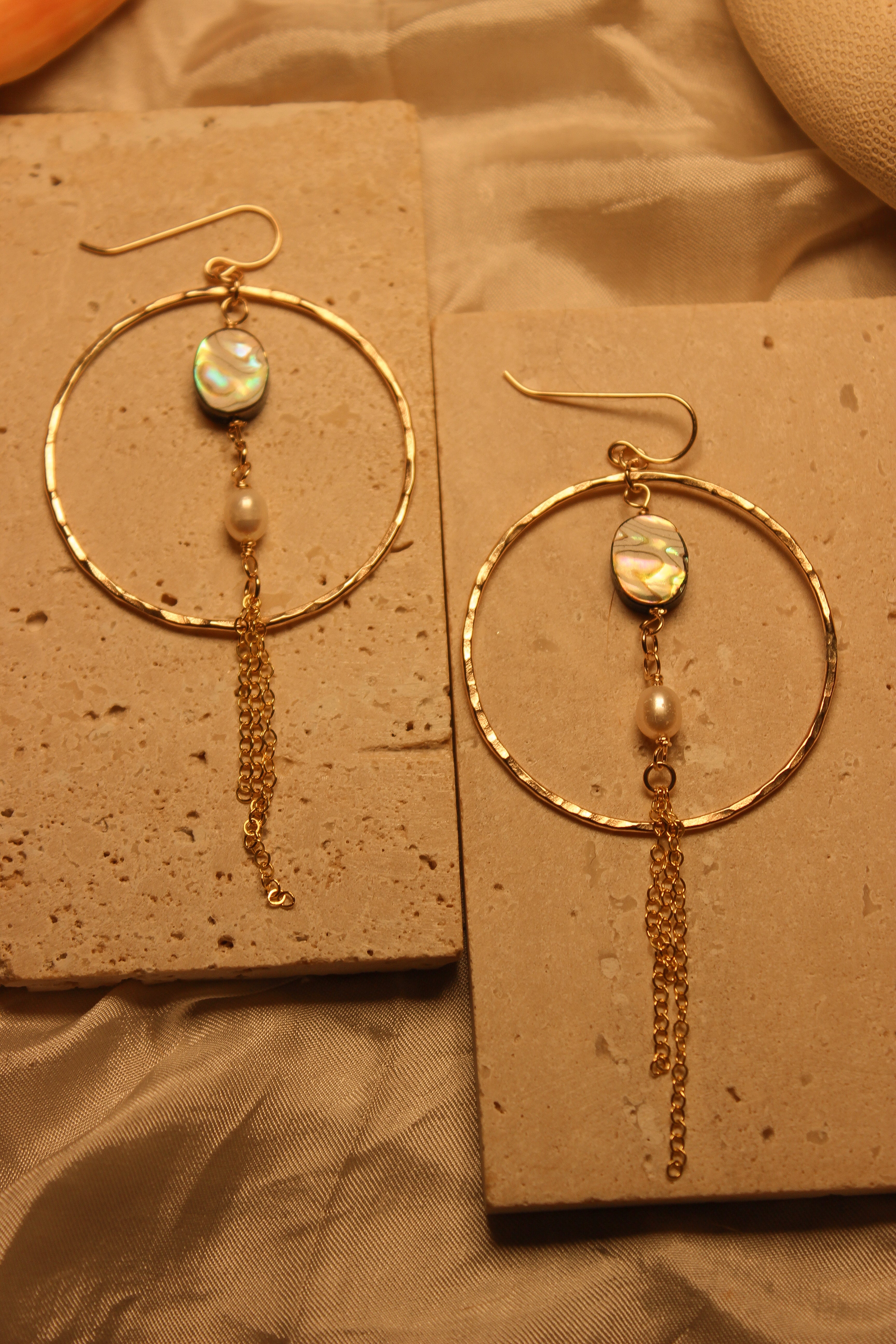 Five inches of sunlit shimmer — these gold filled hoops are lightweight, water resistant, and made to move with you. Dangling from each hammered circle is an iridescent abalone shell, a single freshwater pearl, and a cascade of gold filled chain that catches the light like seafoam at sunset. Designed for bold beach days, breezy nights, and everything in between.