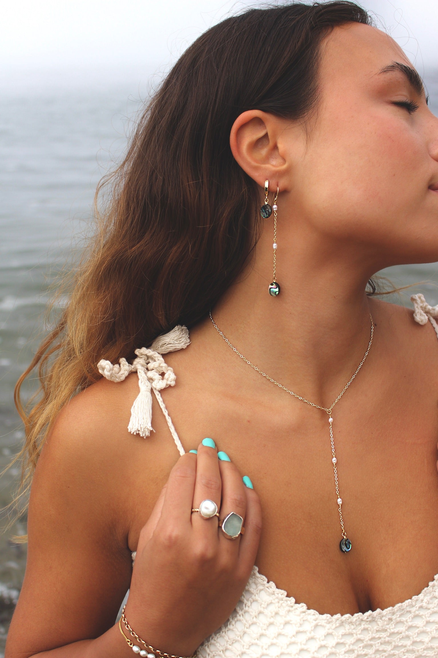 Introducing the Arielle Abalone Lariat, a stunning accessory for any occasion. Made with a gold filled chain and adorned with small dainty freshwater pearls and a shimmering abalone oval piece, this necklace is adjustable from 14 to 18 inches, making it the perfect fit for any neckline. Elevate your style with this elegant and versatile piece.