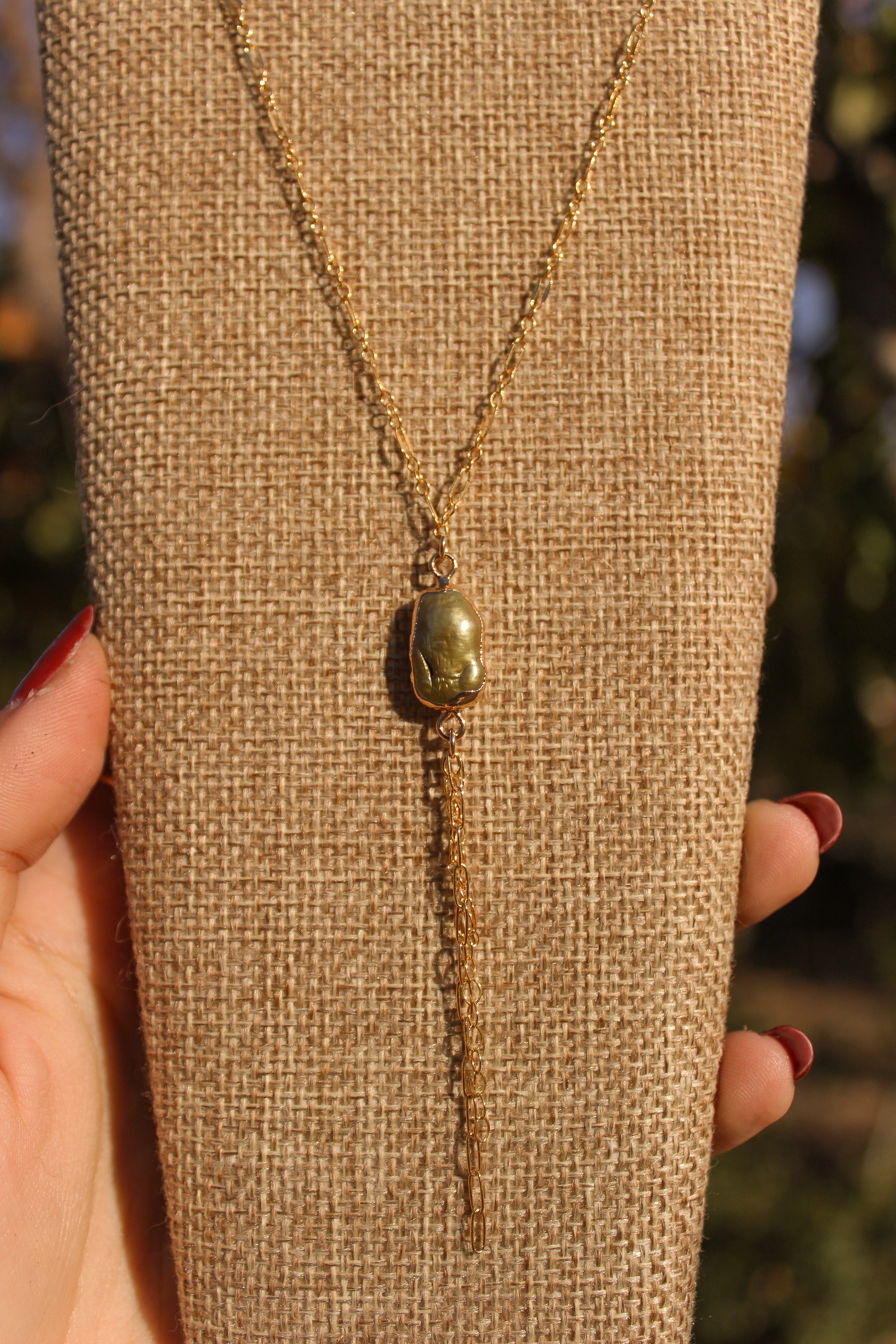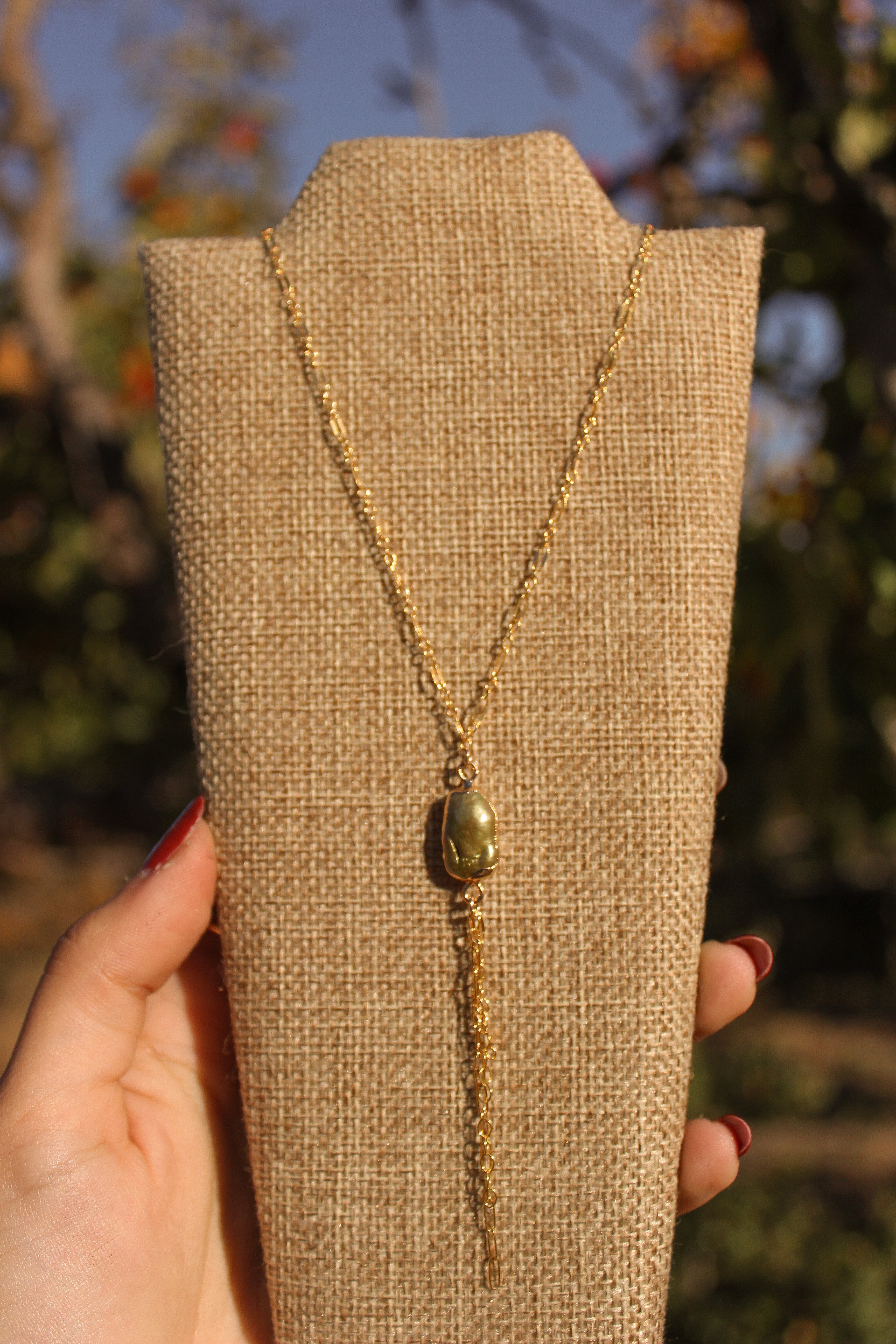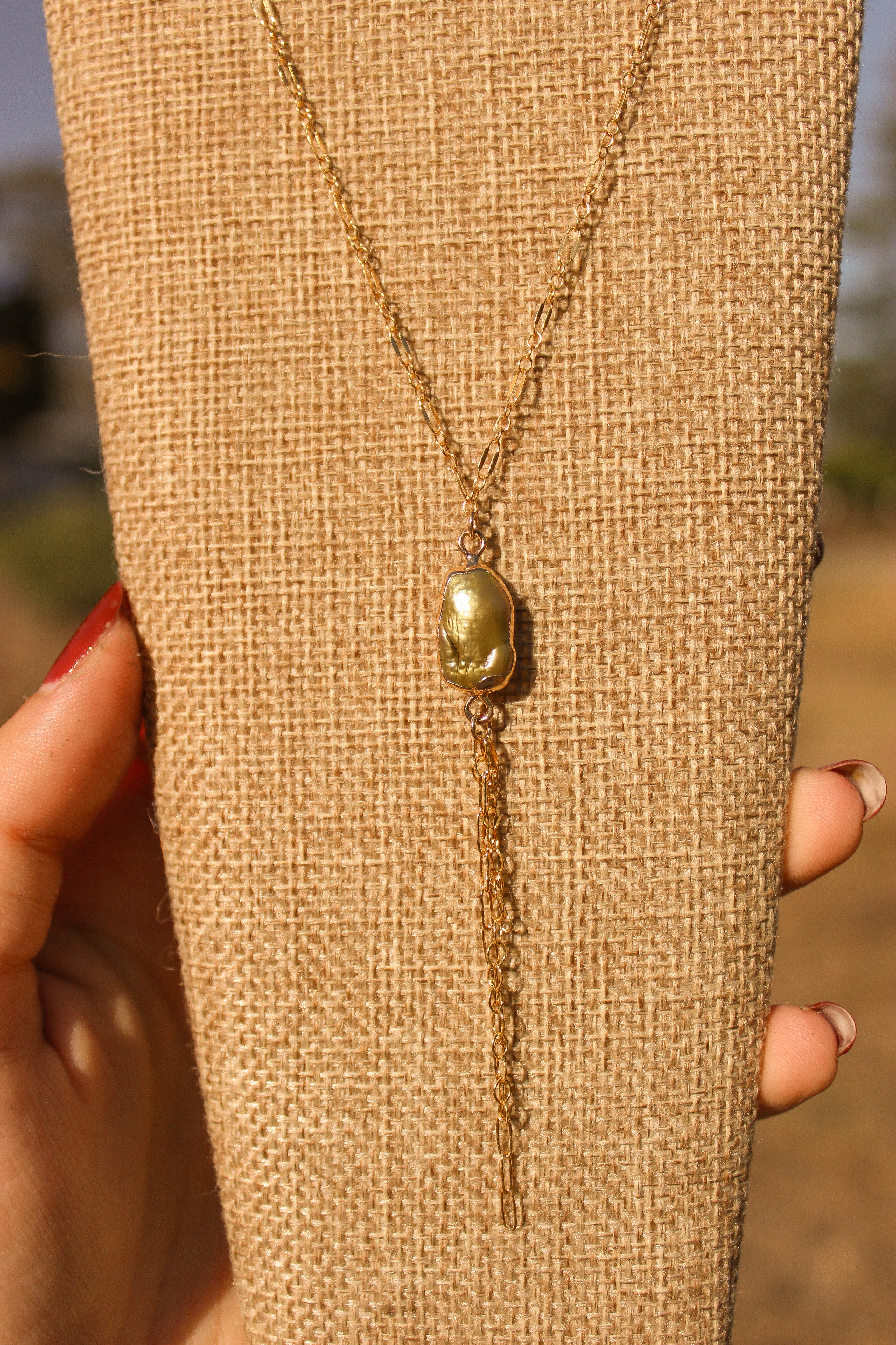 The Evergreen Lariat is a piece that holds onto color as the seasons change. A glowing electroplated green pearl is paired with a cascading drop chain, catching light with every movement. Crafted with three distinct 14k gold-filled chains for a shimmery, layered look and adjustable from 14–18 inches for the perfect fit. While the chain is water resistant, we recommend avoiding extended water exposure to preserve the pearl’s rich green finish.