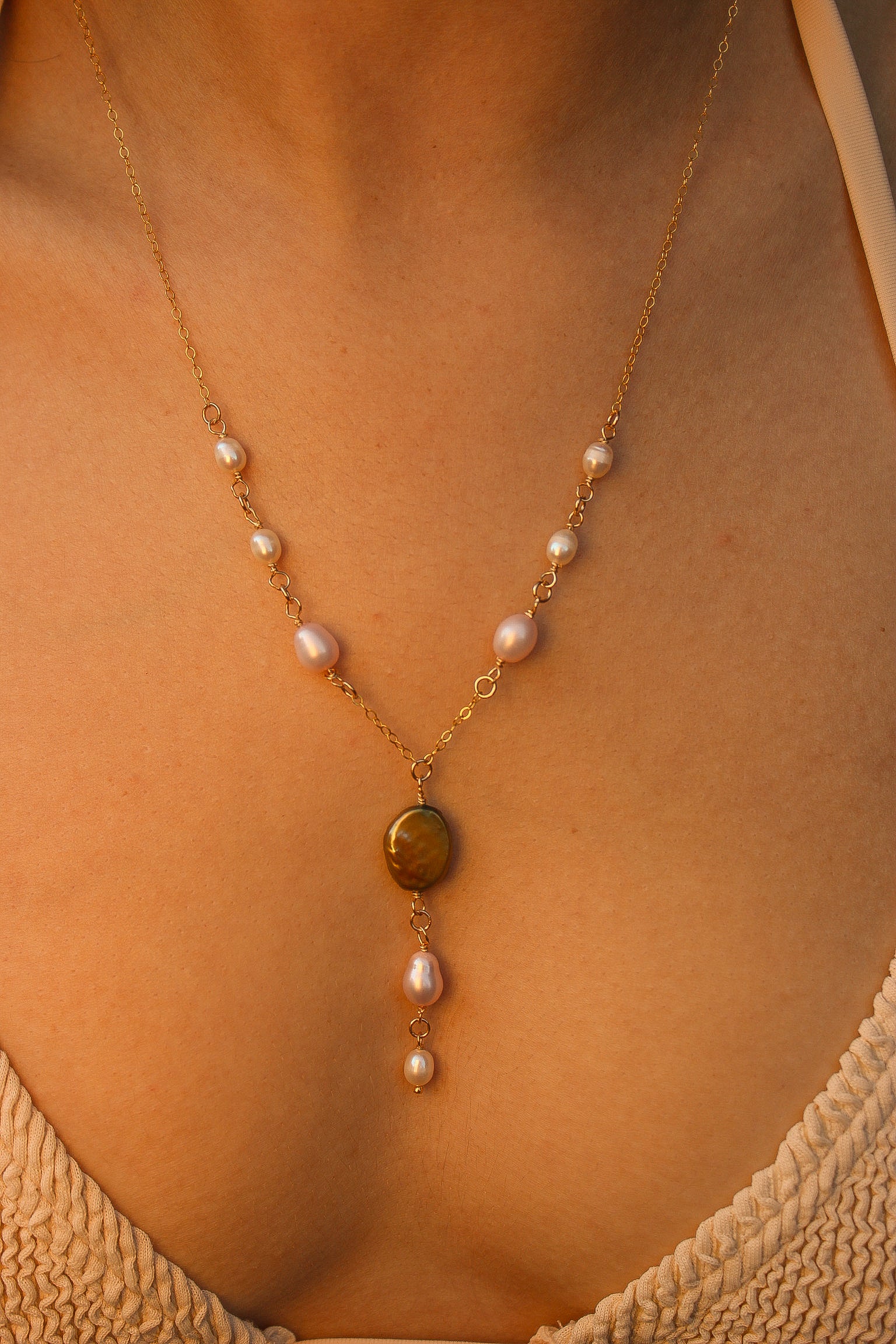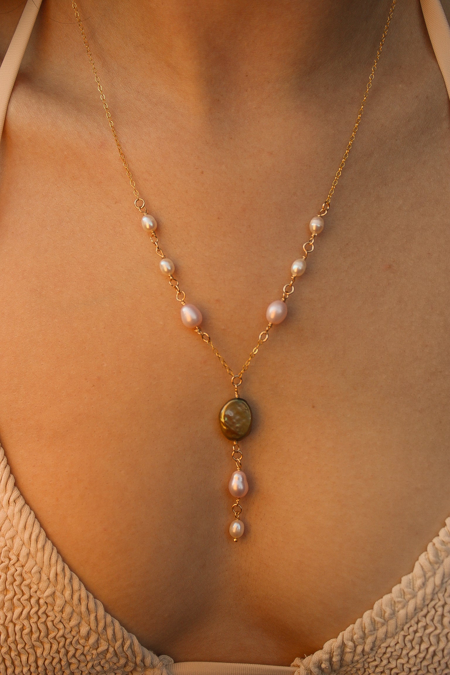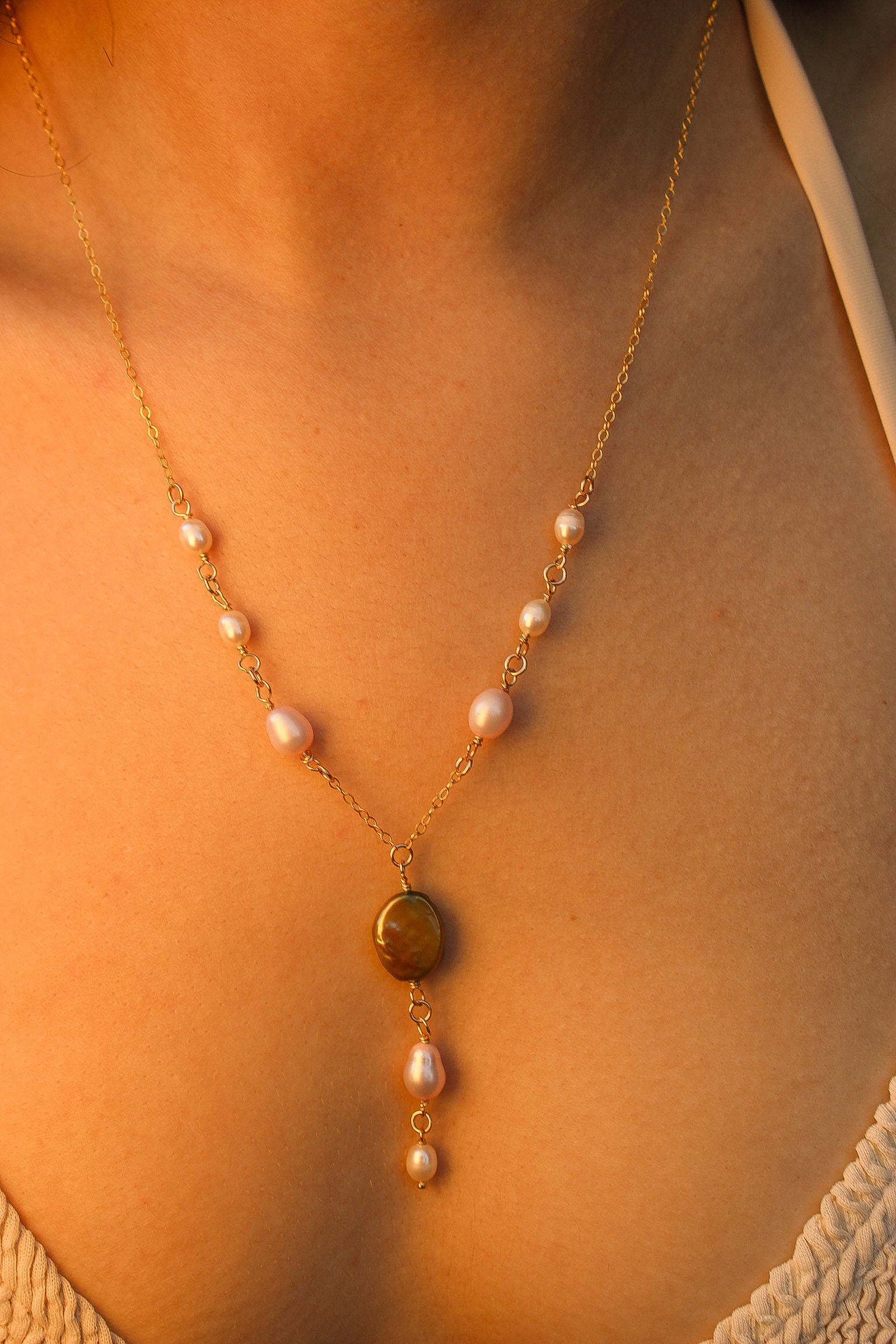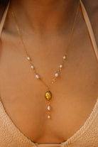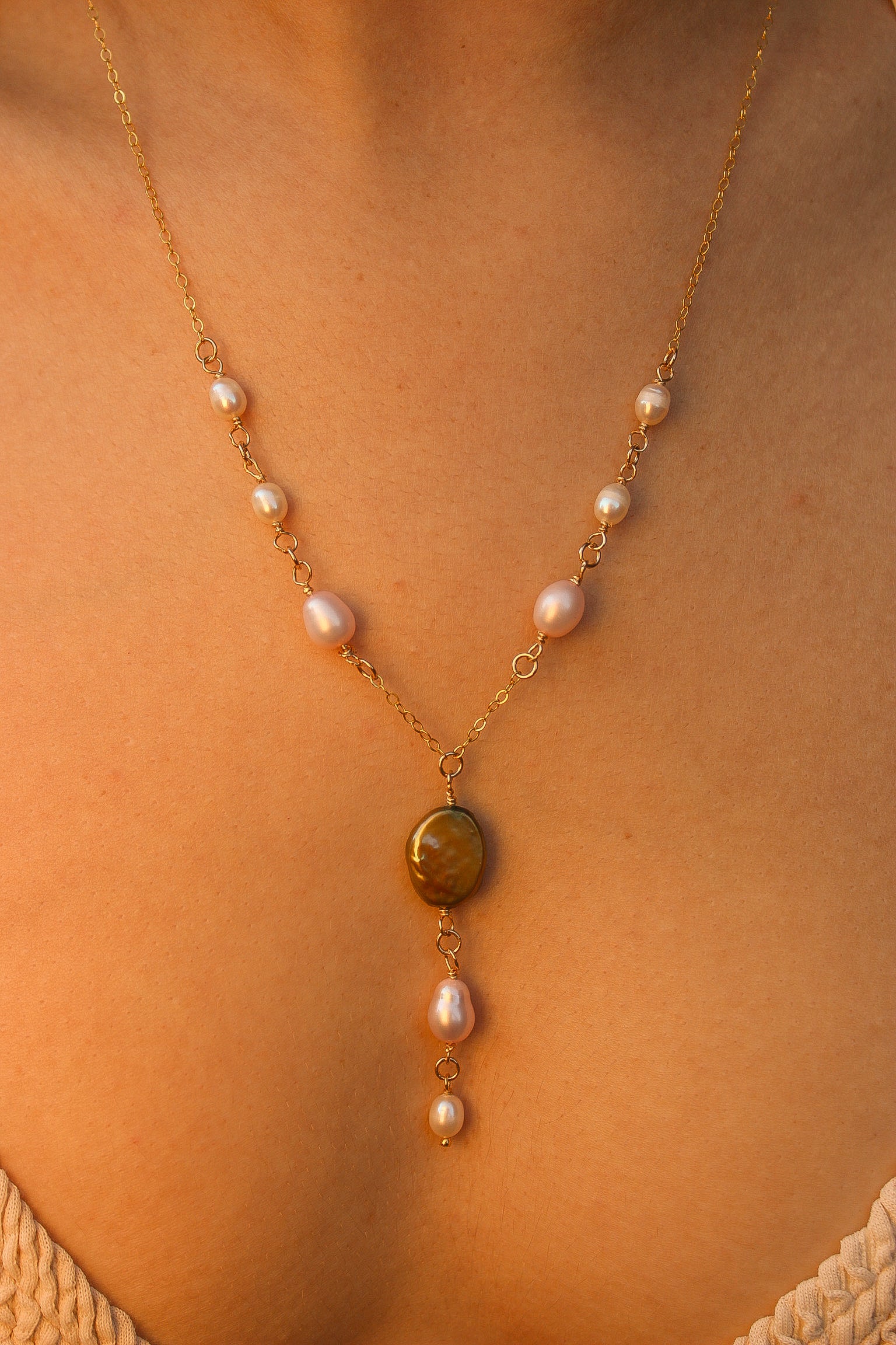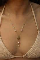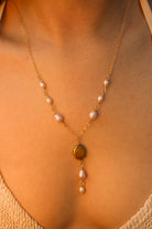 Add some magic to your style with the Faerie Necklace. This 14"-16" adjustable gold filled chain features white, pink, and green pearls that are water resistant and tarnish free. A little white pearl drop down at the back adds a charming touch. (No need for fairy dust!)
