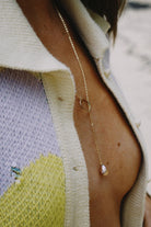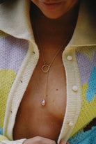 24” long statement necklace. Features a hammered gold filled circle that is threaded through to reveal a drop down pink Edison Pearl. Can be adjusted for different lengths.