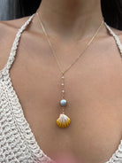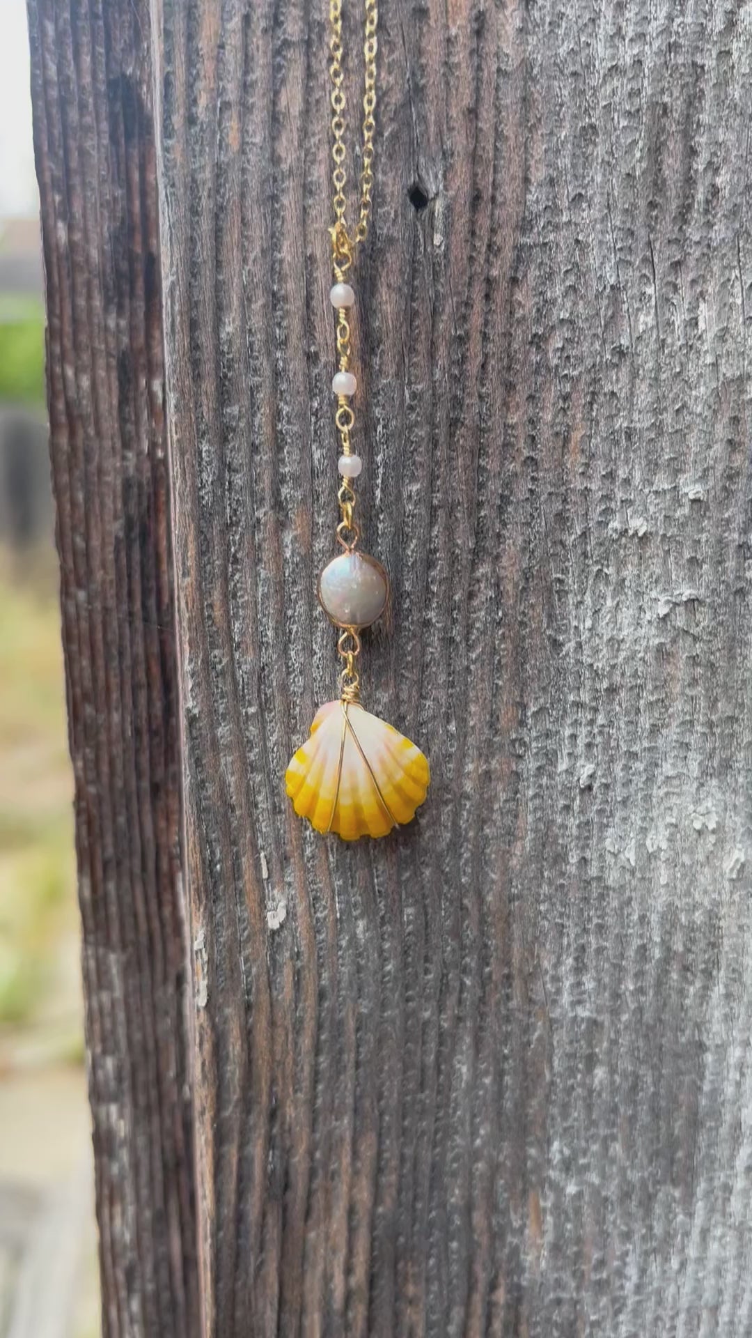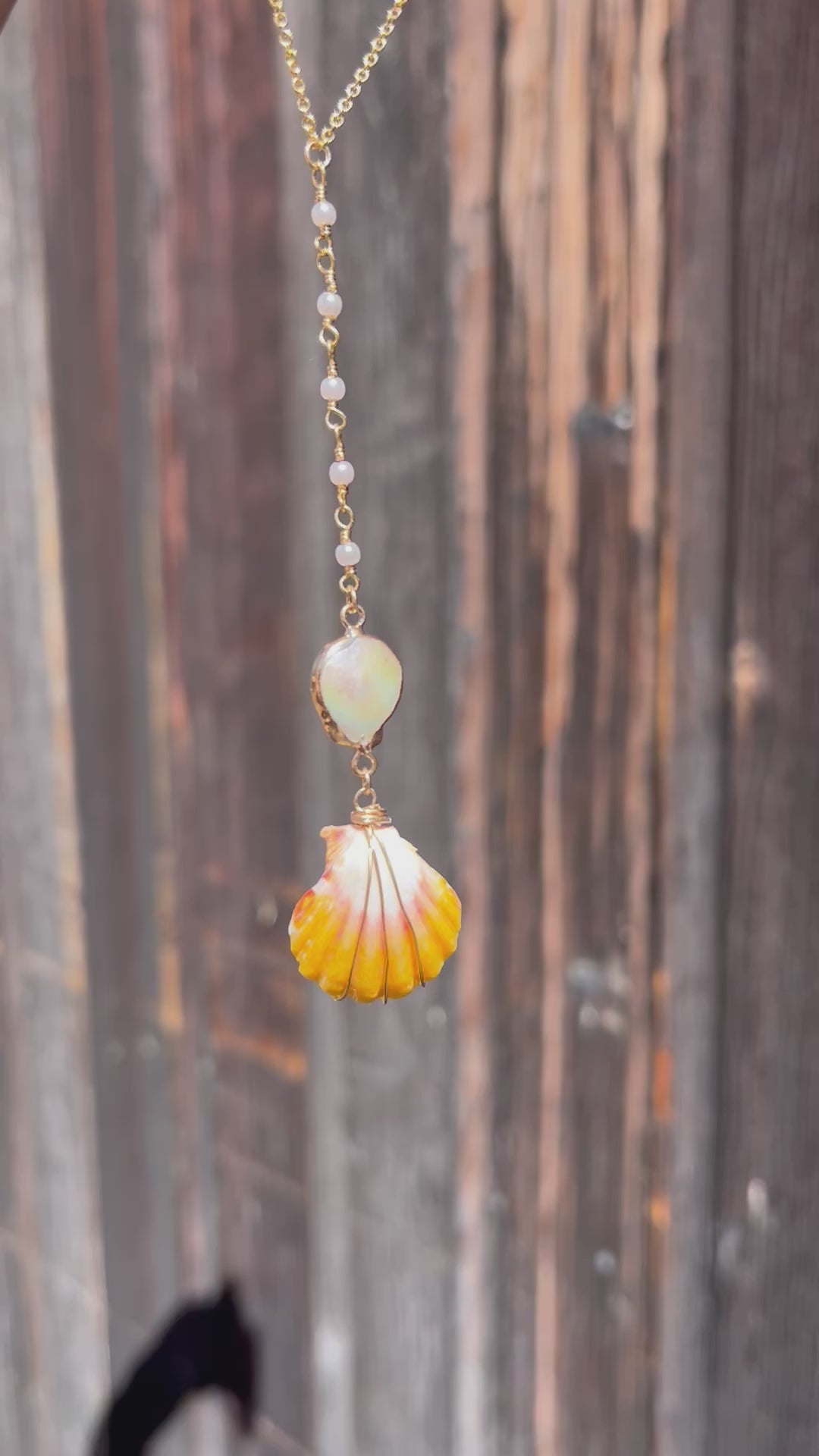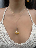 Explore the wonders of nature with our Sunny Shell Lariat. This elegant 14"-17" gold-filled cable chain features a delicate plated keshi pearl chain with an electroplated gold electroplated baroque pearl and a one-of-a-kind sunrise shell. With an adjustable length and secure gold-filled lobster clasp, each shell is unique in size and color for a truly natural and beautiful piece. Due to the nature of the design, no water wear or use will keep this piece at its best.