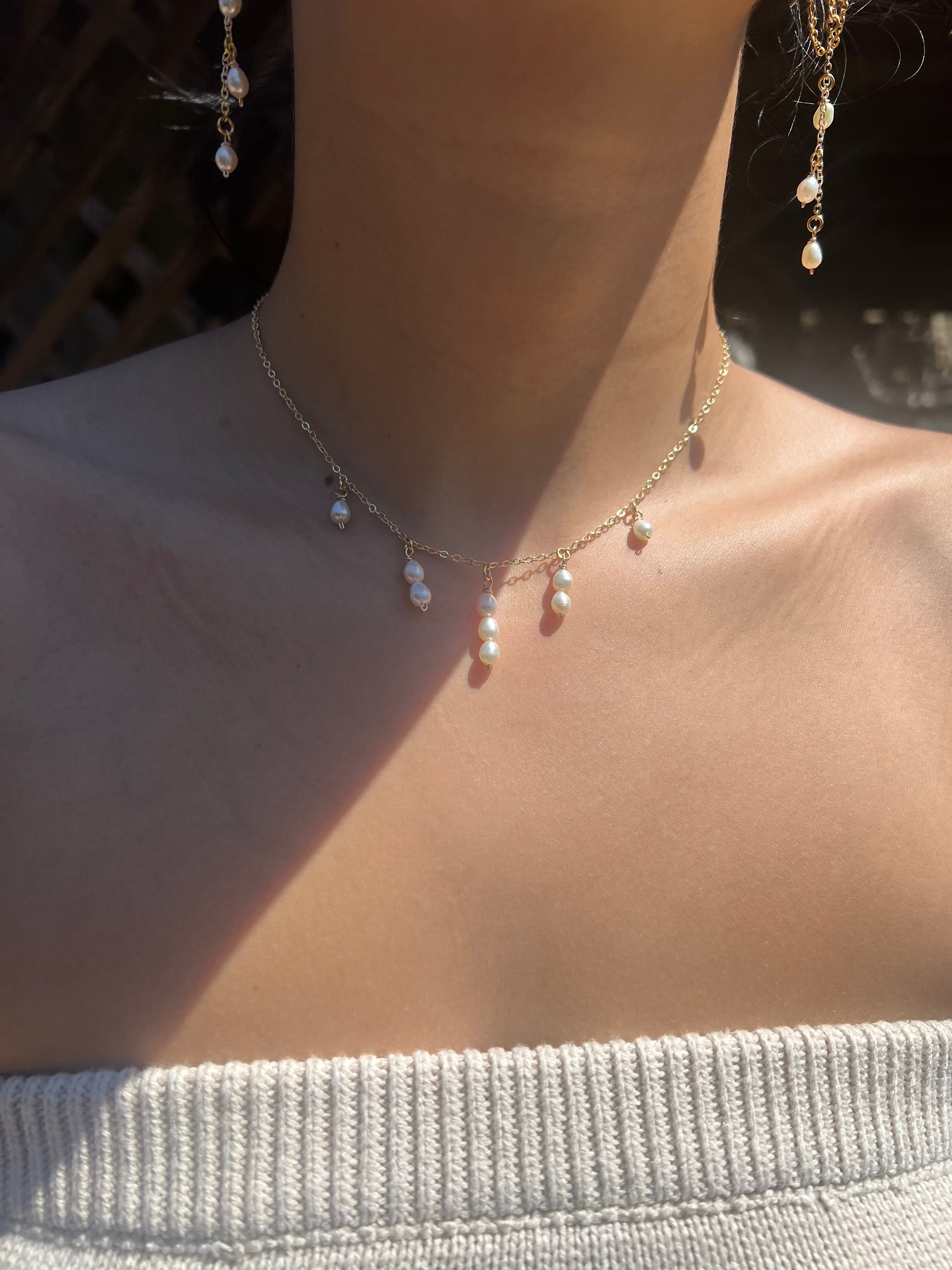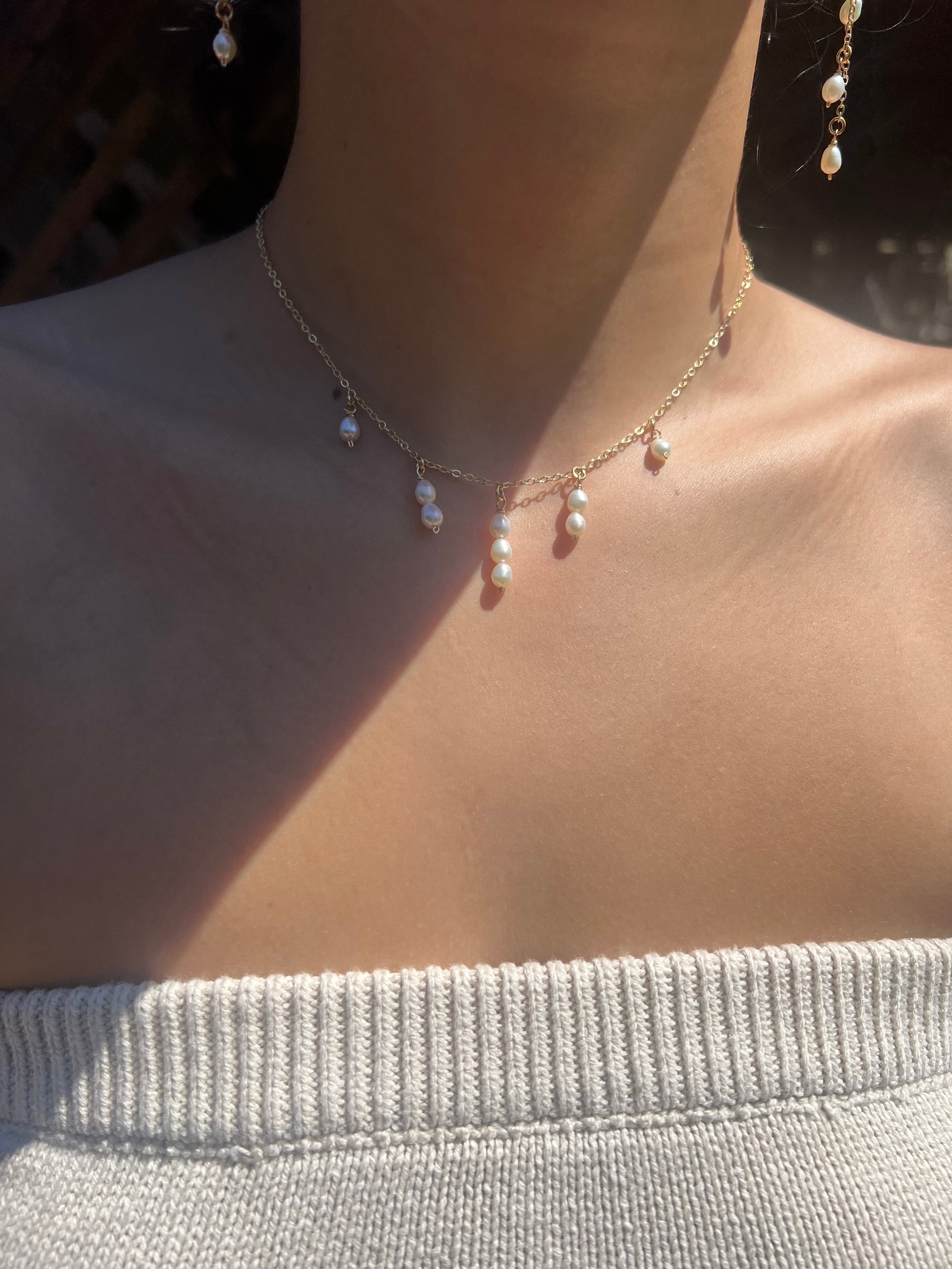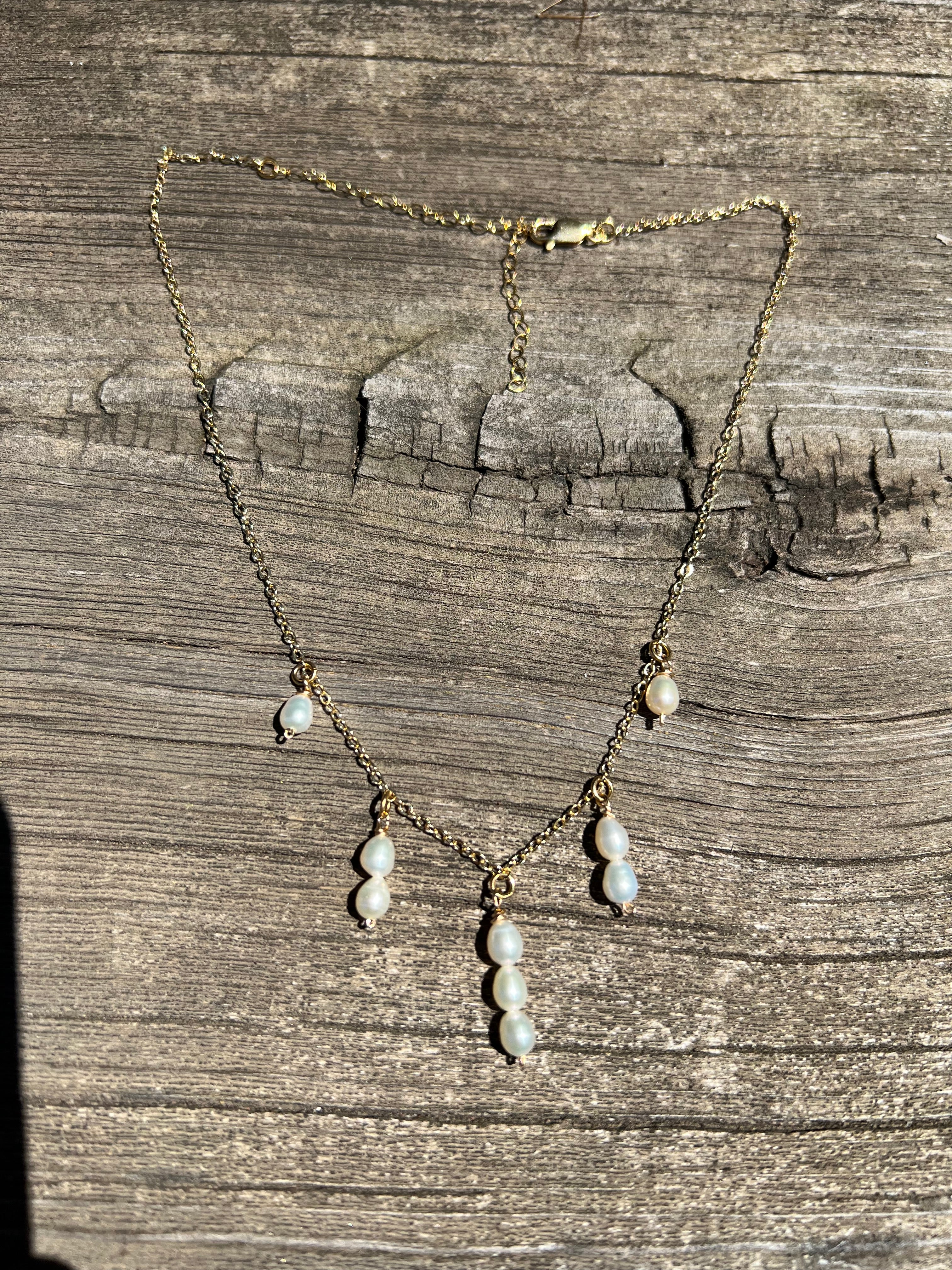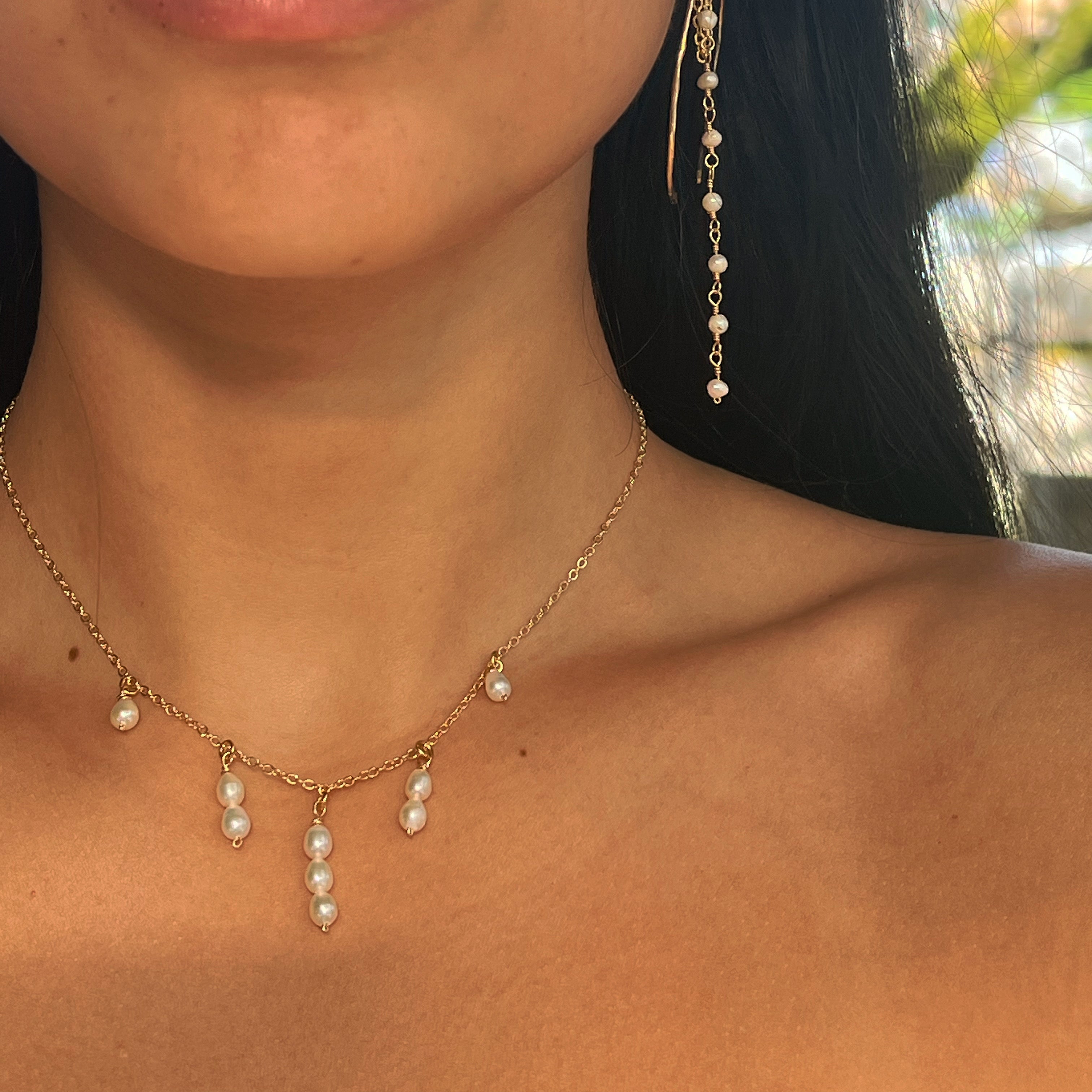 This exquisite Waterfall Necklace features delicate, hand-wrapped pearls in a cascading waterfall pattern. The adjustable 14"-17" chain ensures a perfect fit with a lobster clasp. Elevate any outfit with this stunning accessory. All gold-filled.
