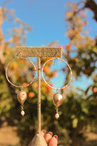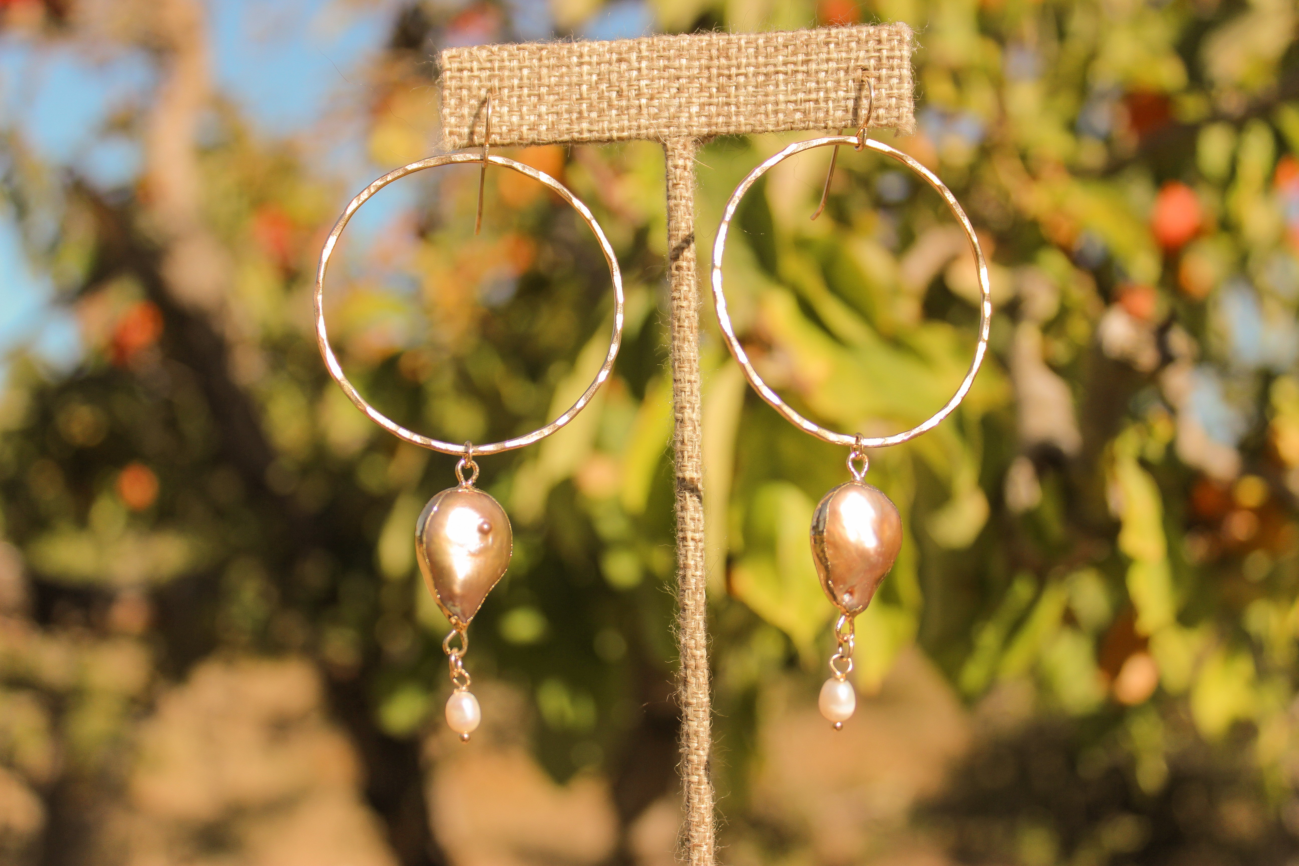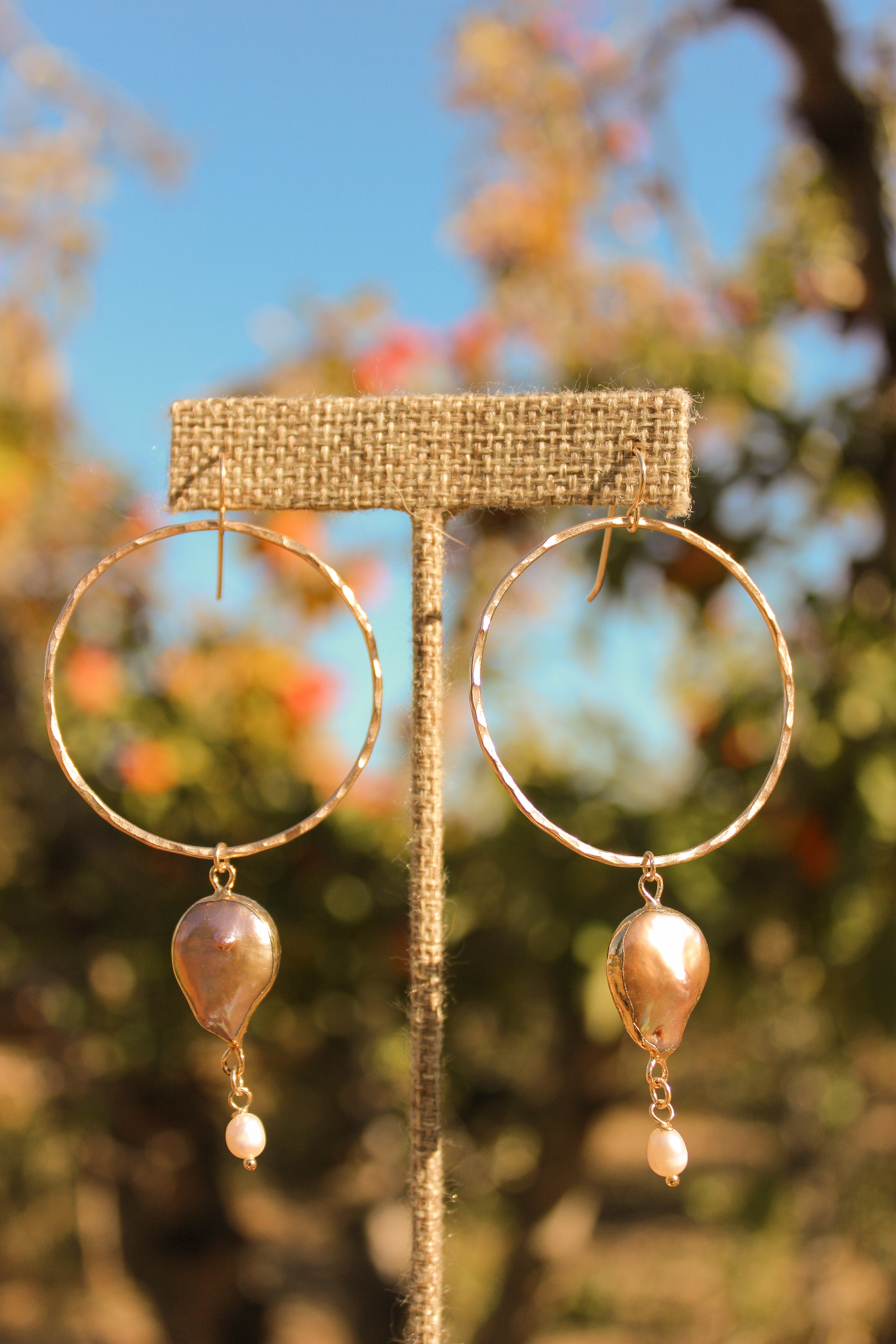 The Twilight Hoops capture that fleeting moment when the sky turns gold and violet before night falls. Hand-hammered gold hoops hold a glowing electroplated purple-gold pearl, finished with a keshi pearl drop for extra shimmer. Crafted with 14k gold-filled hoops and fully water resistant, these earrings are bold yet effortless — perfect for adding a little evening magic to any look.