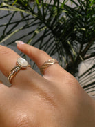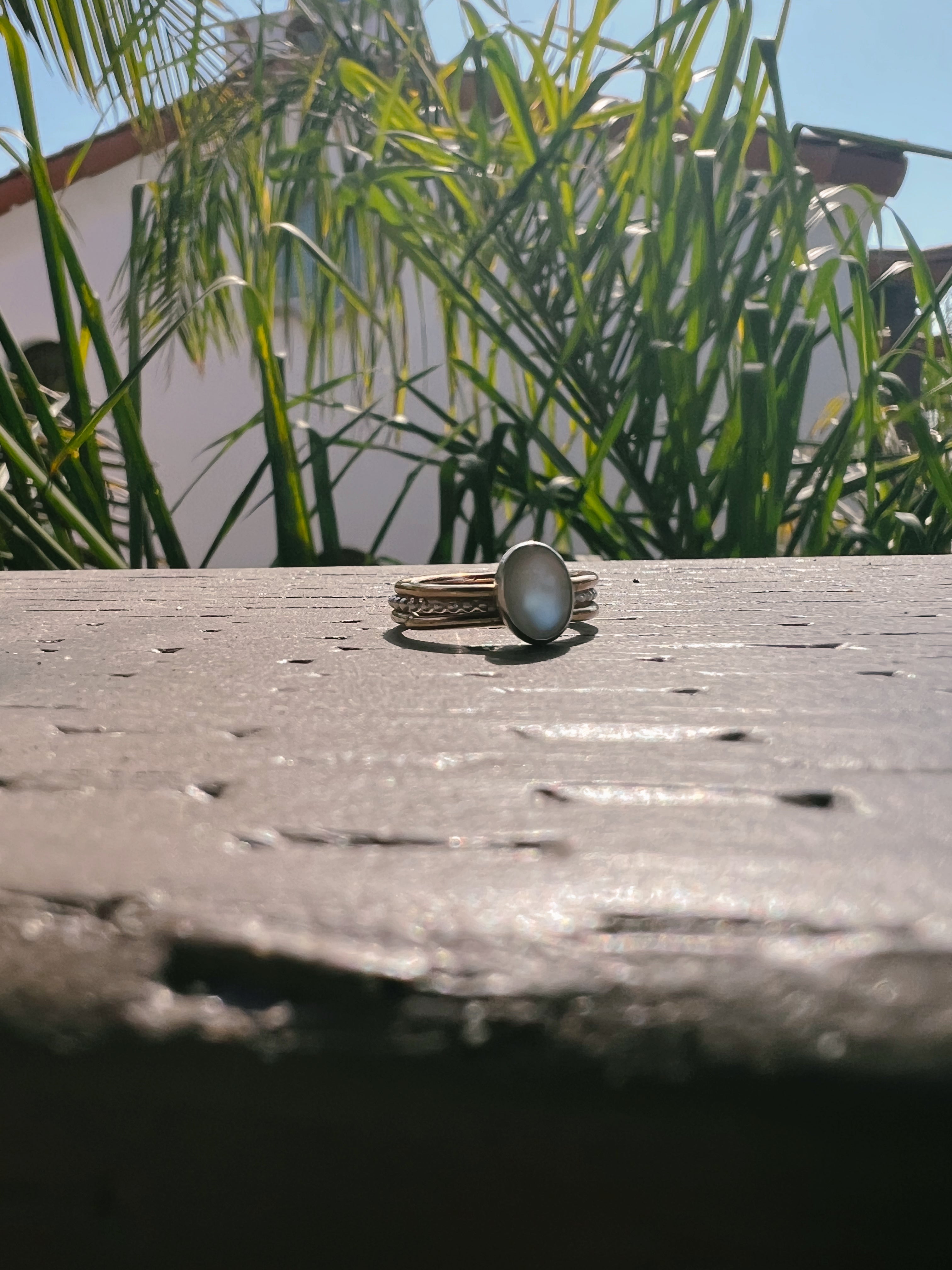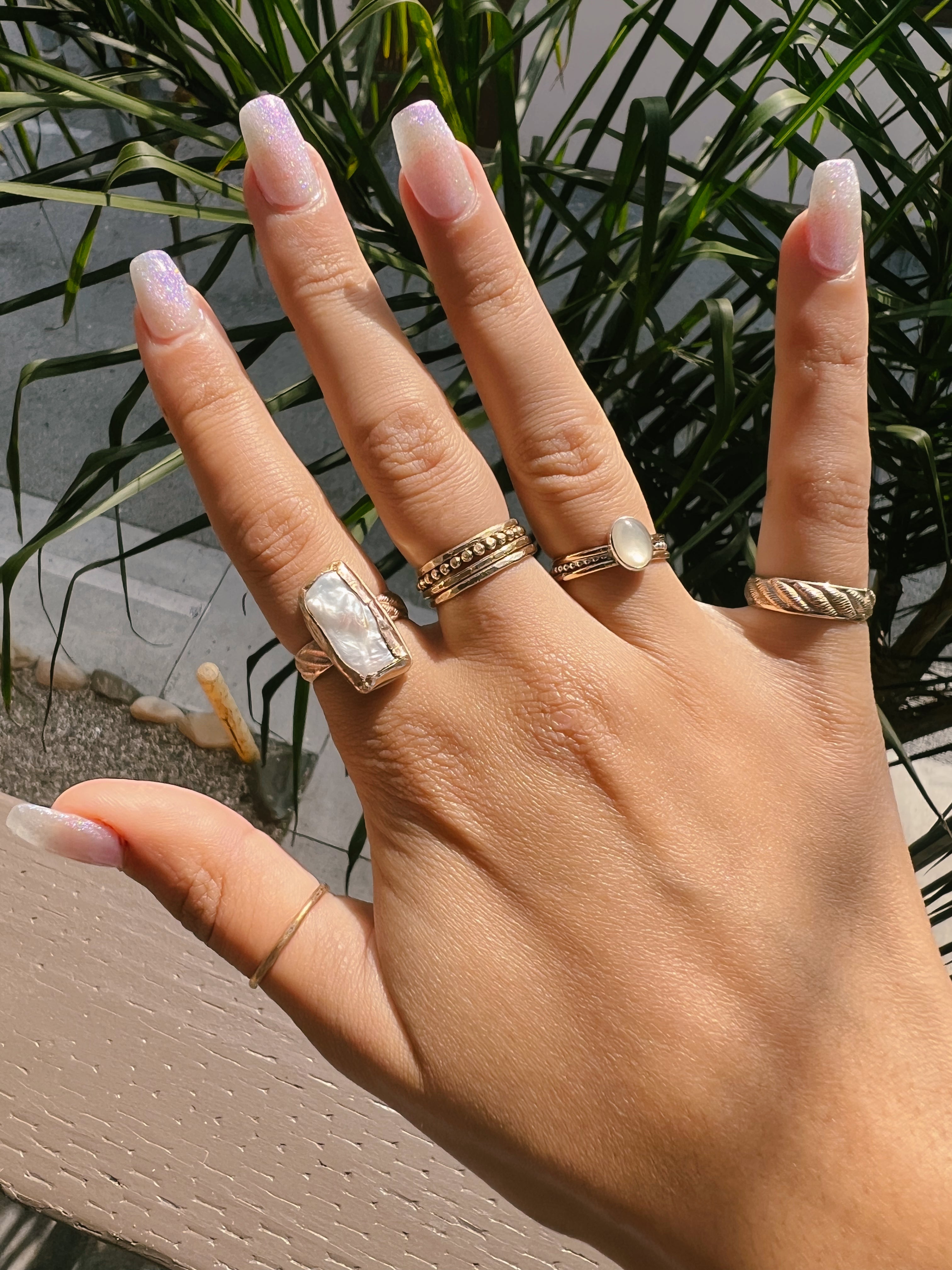 This Nova Pearl Ring features two stunning gold-filled bands and a bezel pearl oval, paired with a sterling silver beaded style band in the middle. Its waterproof design is available in sizes 5-9, making it perfect for everyday wear.