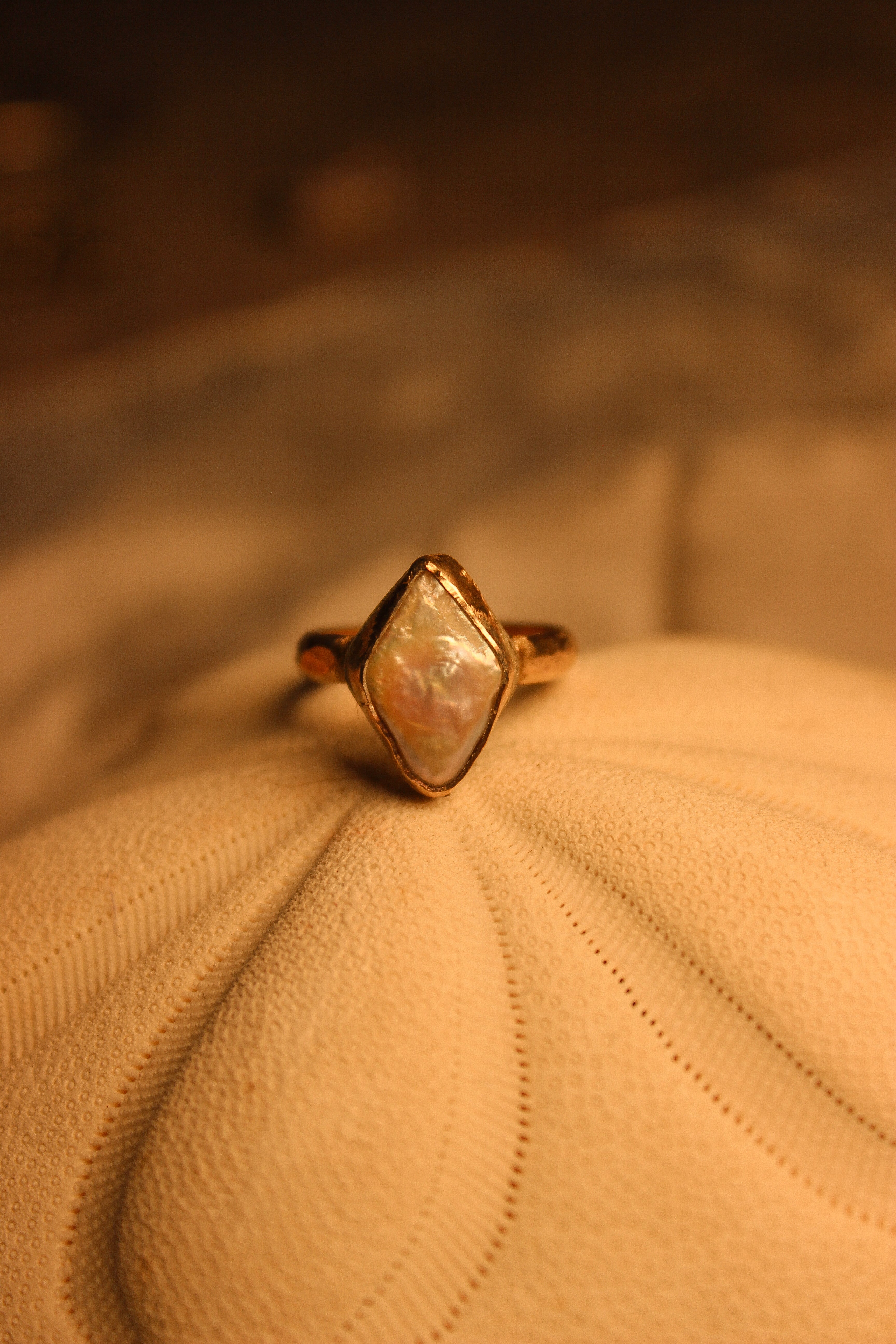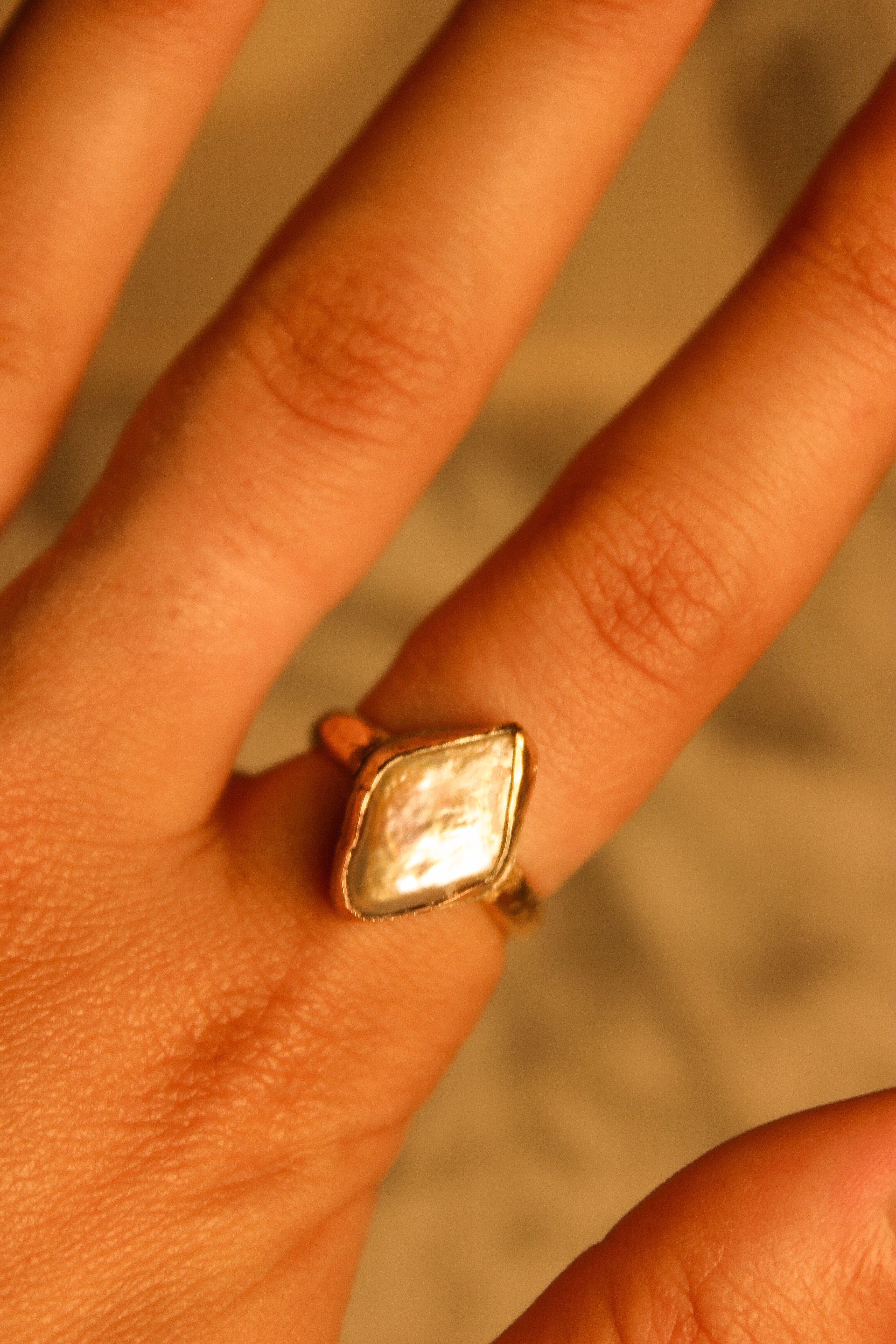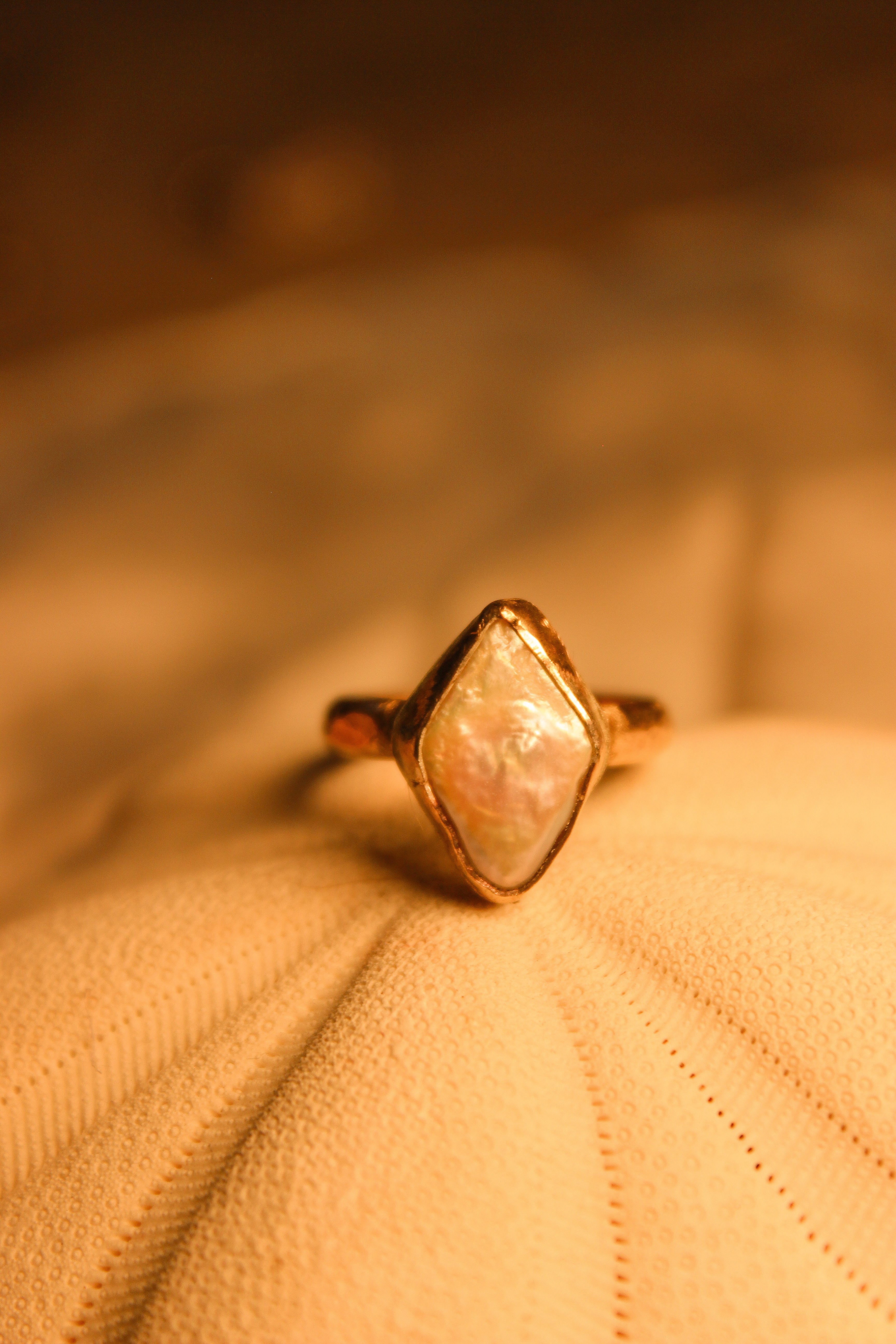 A one-of-a-kind, diamond-cut freshwater pearl set in a hand-hammered texture gold-filled band that hugs every edge of its natural shape. The pearl has a soft iridescence that shifts with the light, like sun on the sea. Water-resistant and available in whole sizes 5–10. Need a half size? Leave it in the notes at checkout.