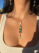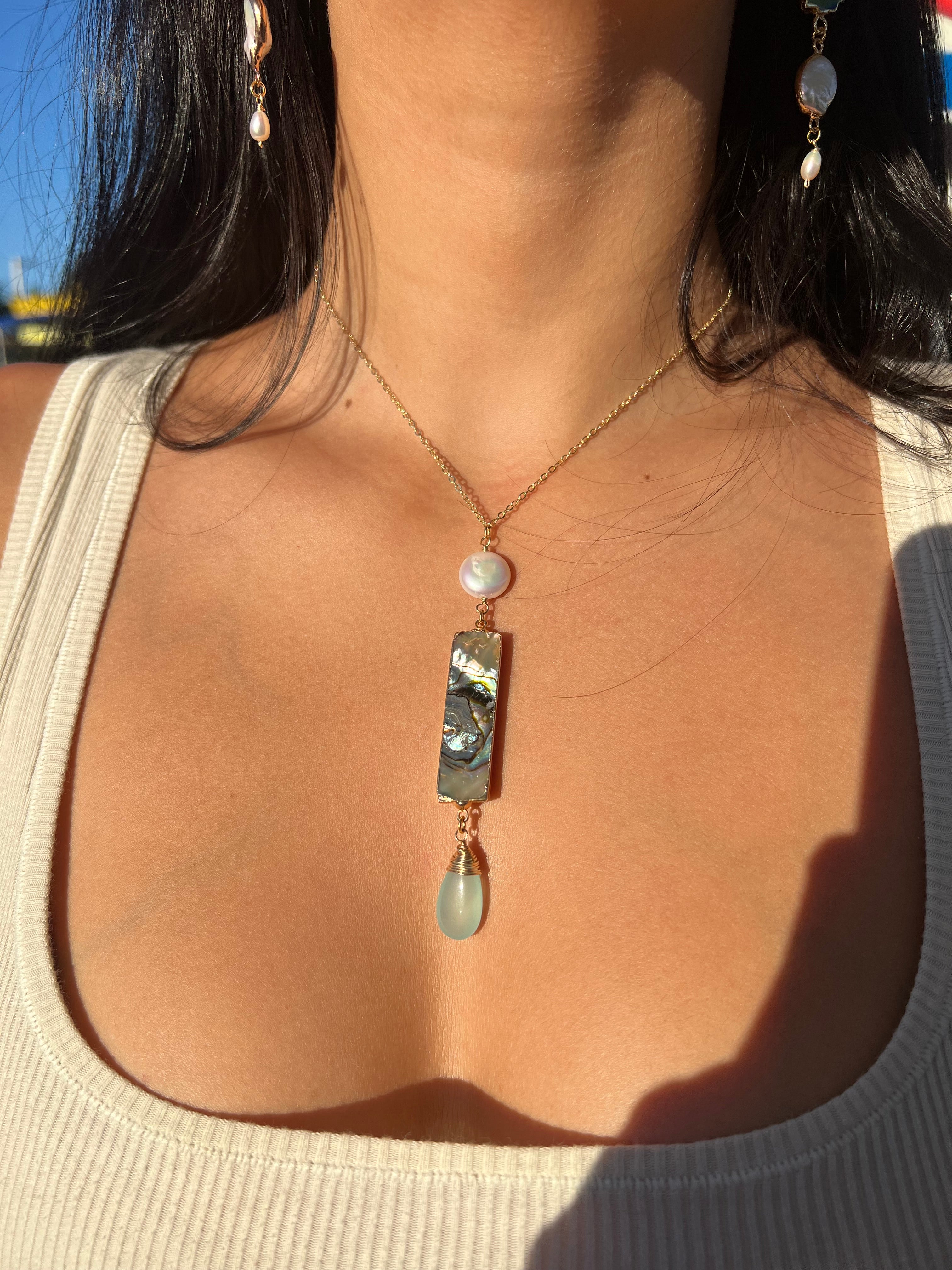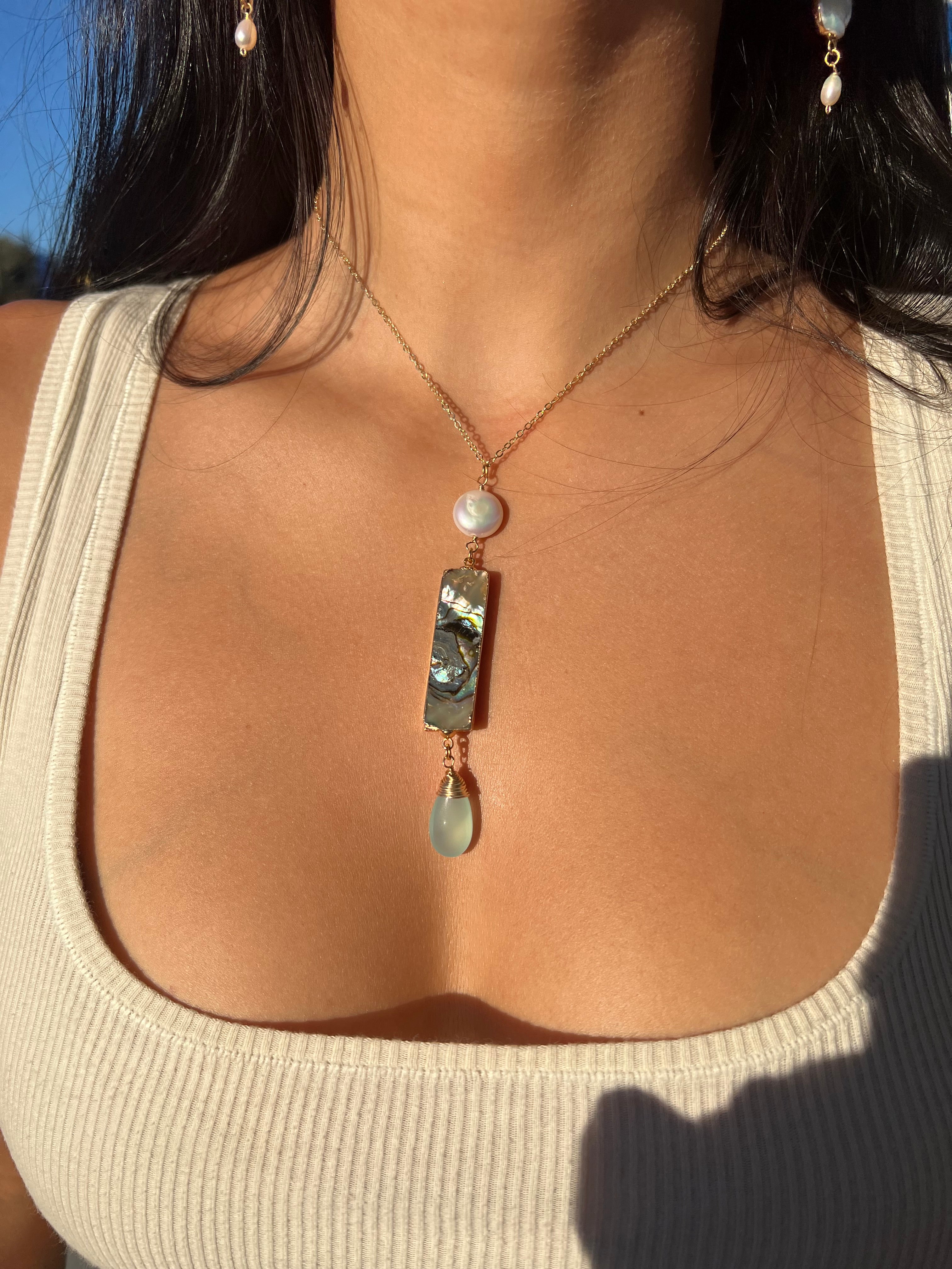 The Aqua Lariat is a stunning necklace made with a gold filled chain, featuring a round pearl, a gold electroplated abalone bar, and a blue gemstone wrapped in gold filled wire. With a length of 12-16 inches, this elegant piece is perfect for any occasion. Note: necklace should not be worn in water due to gold dipping.