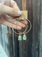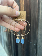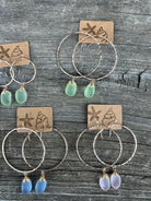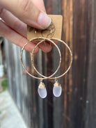5” gold filled or sterling silver hammered hoops featuring a pink frosted wire wrapped piece of sea glass.