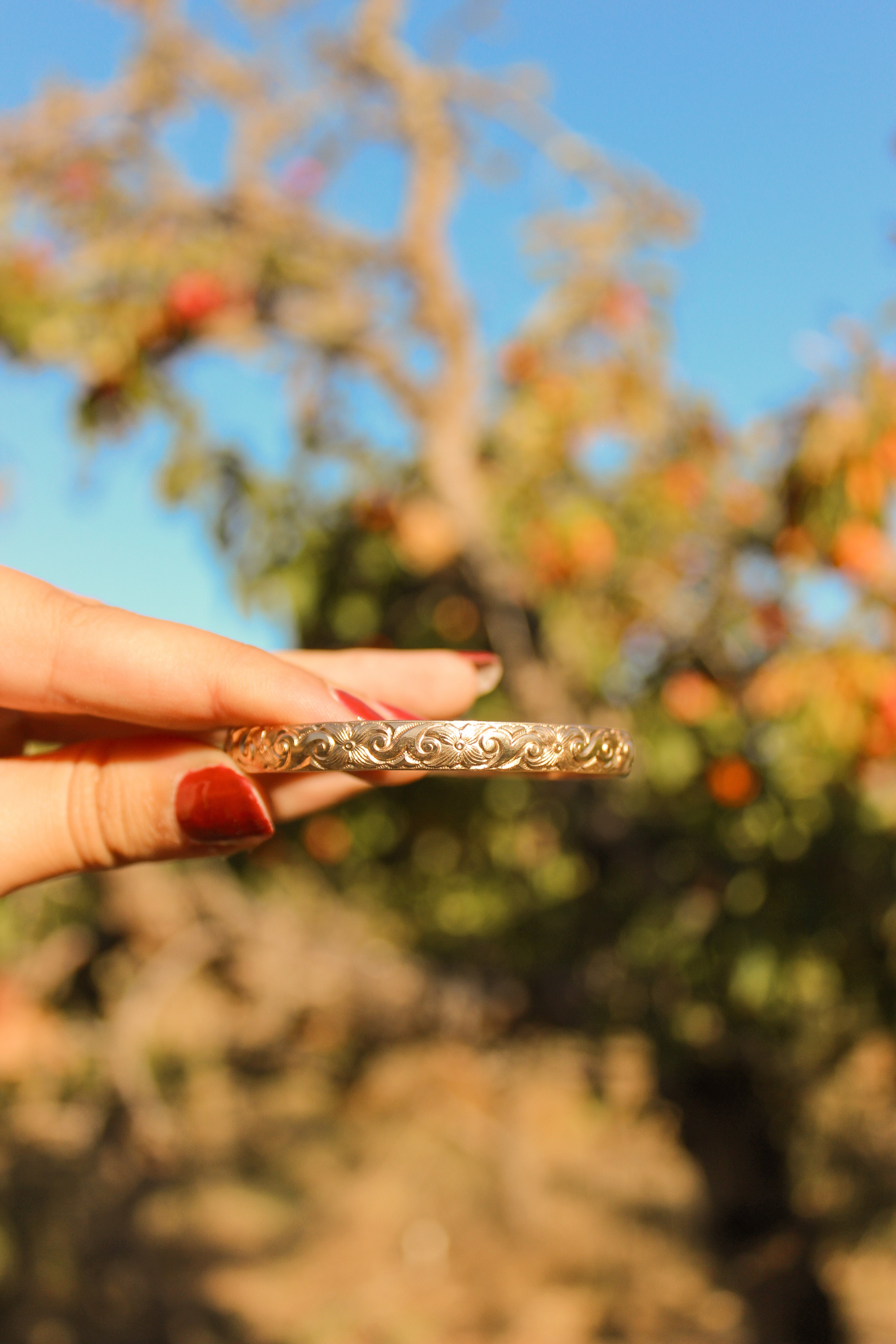 The Equinox Bangle is where golden hour meets autumn’s first chill. Hand-crafted in 14k gold fill, its swirling pattern mirrors leaves caught in a warm breeze, shifting with the light as seasons do. This bangle is firm with no flexibility — we recommend sizing up for an easy, comfortable fit. A piece meant to mark change and transformation, perfect for stacking as the days grow shorter and the sunsets richer.