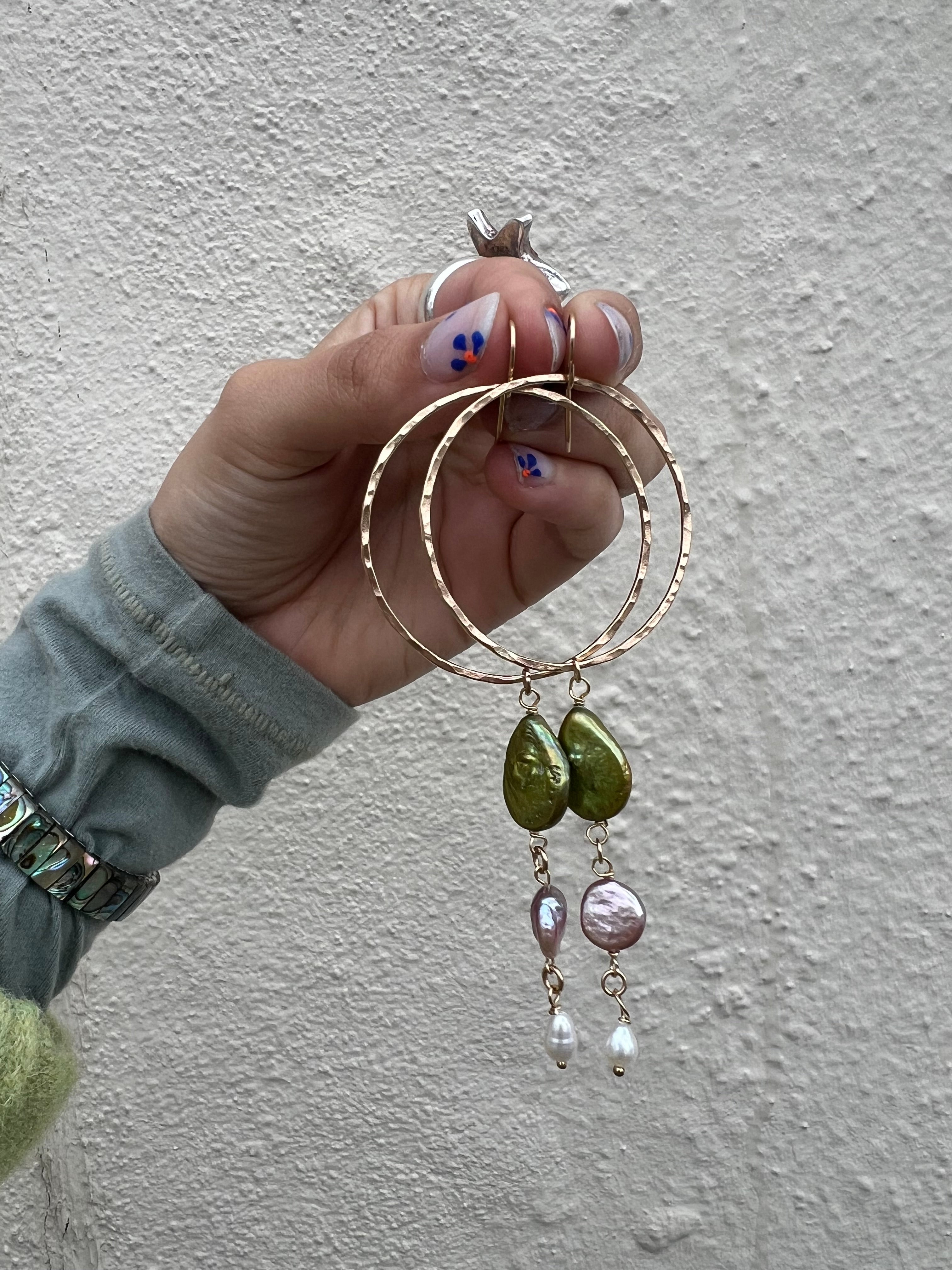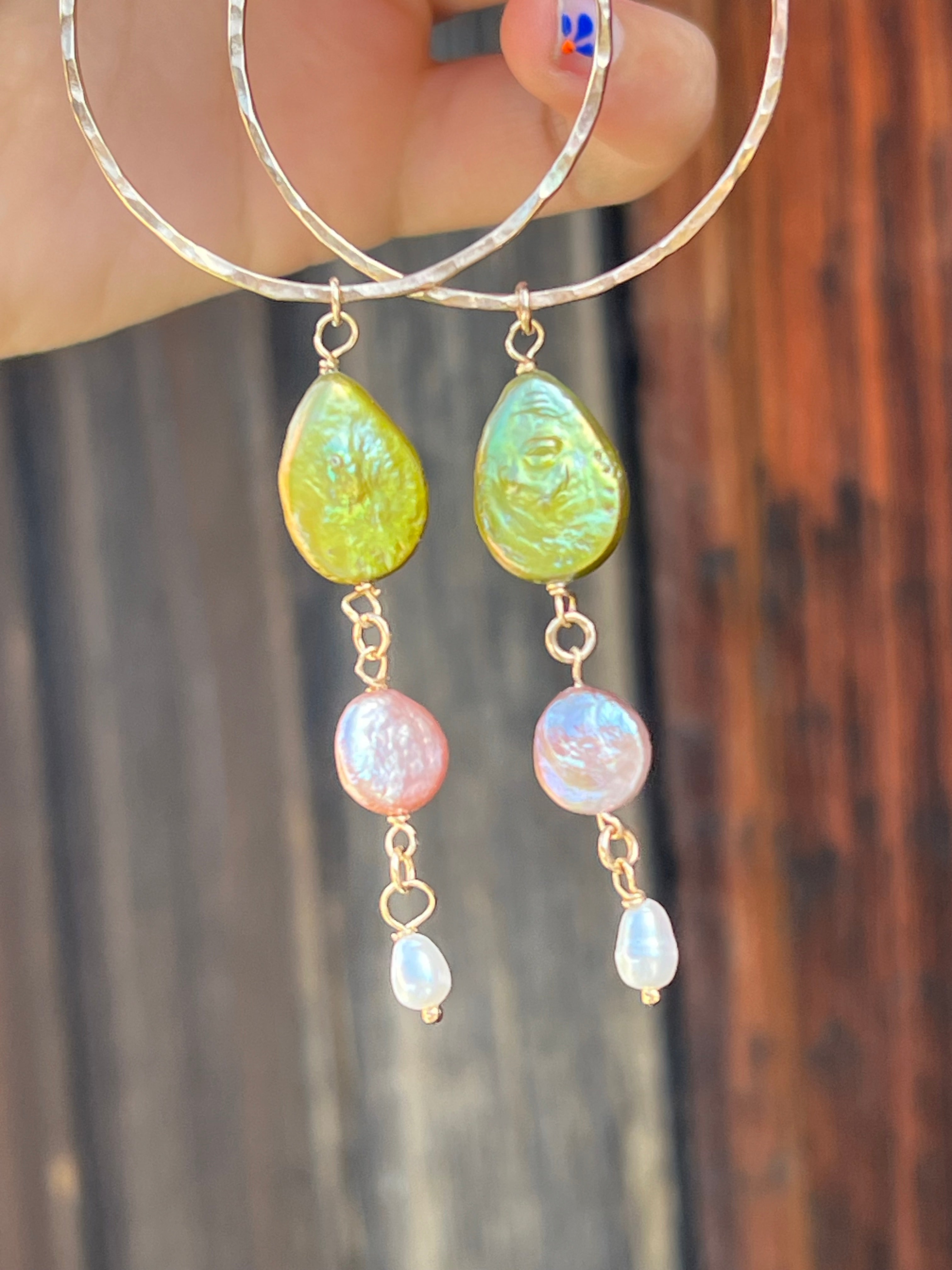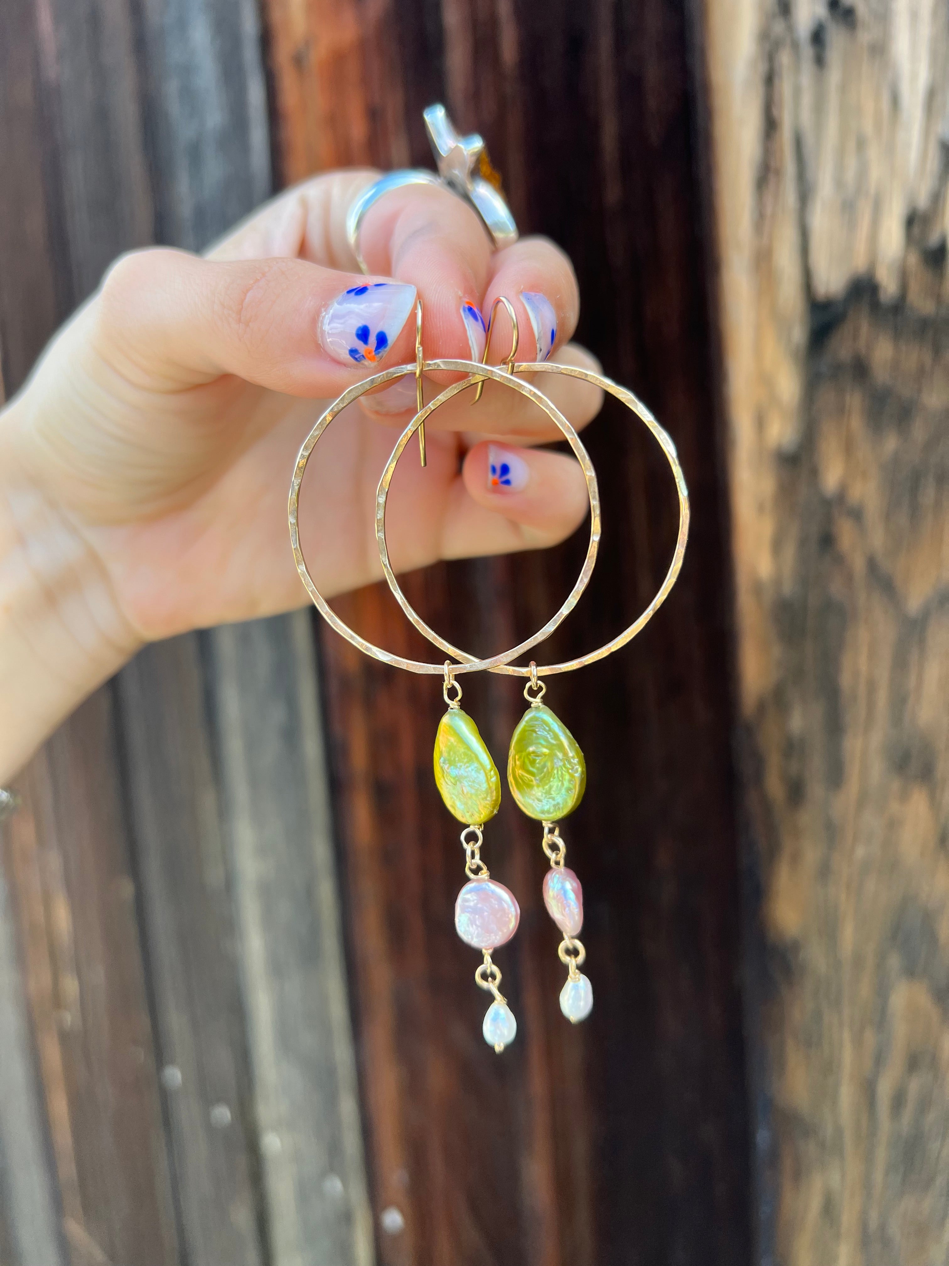 Add a touch of magic to your look with these Faerie Hoops! These 5" hoops, crafted from gold-filled material, feature a hammered texture for a unique touch. Adorned with green, pink, and gold pearls, they bring a playful and whimsical feel to any outfit. Get ready to shine and enchant with these Faerie Hoops! All water resistant and hypoallergenic
