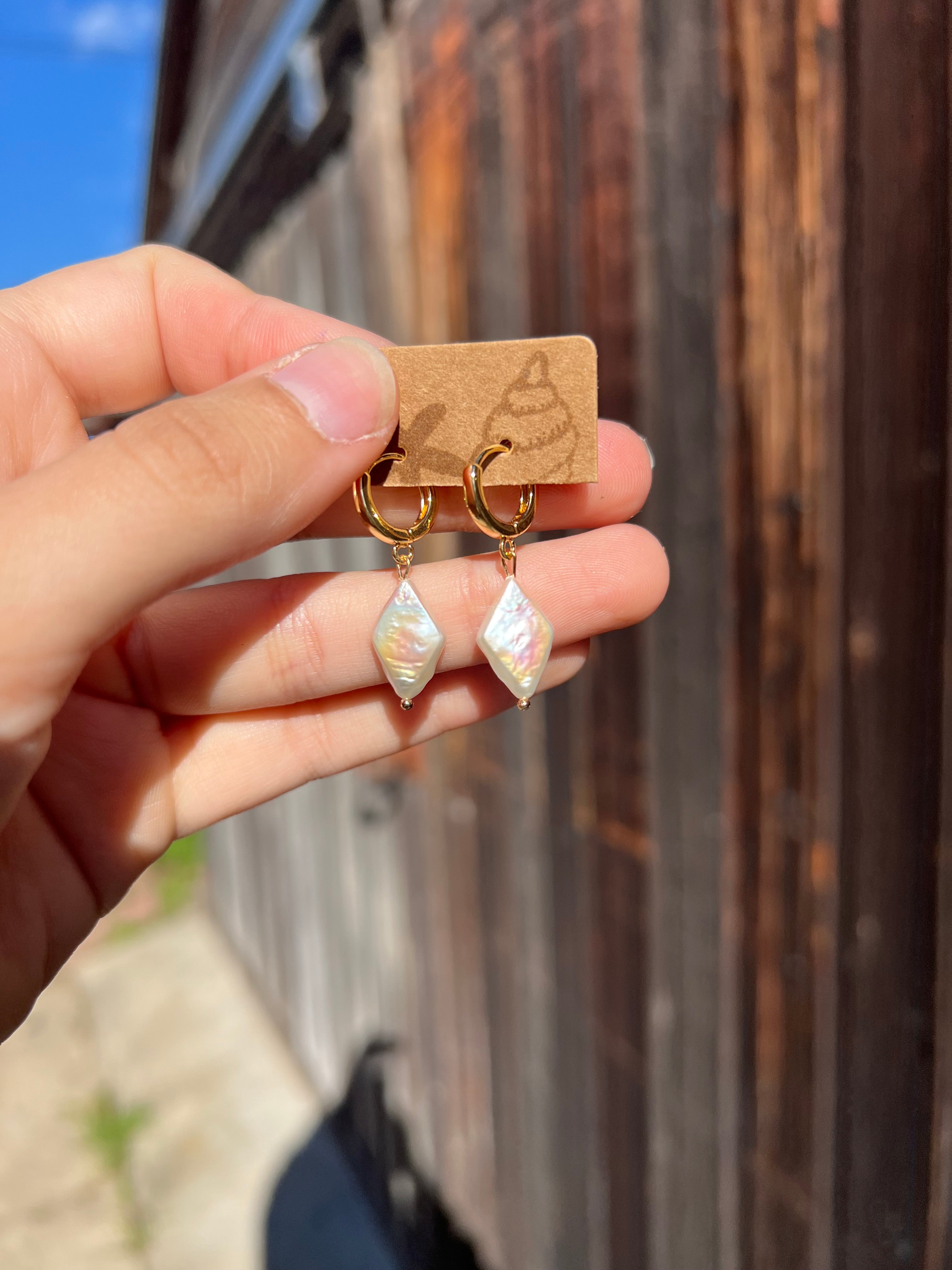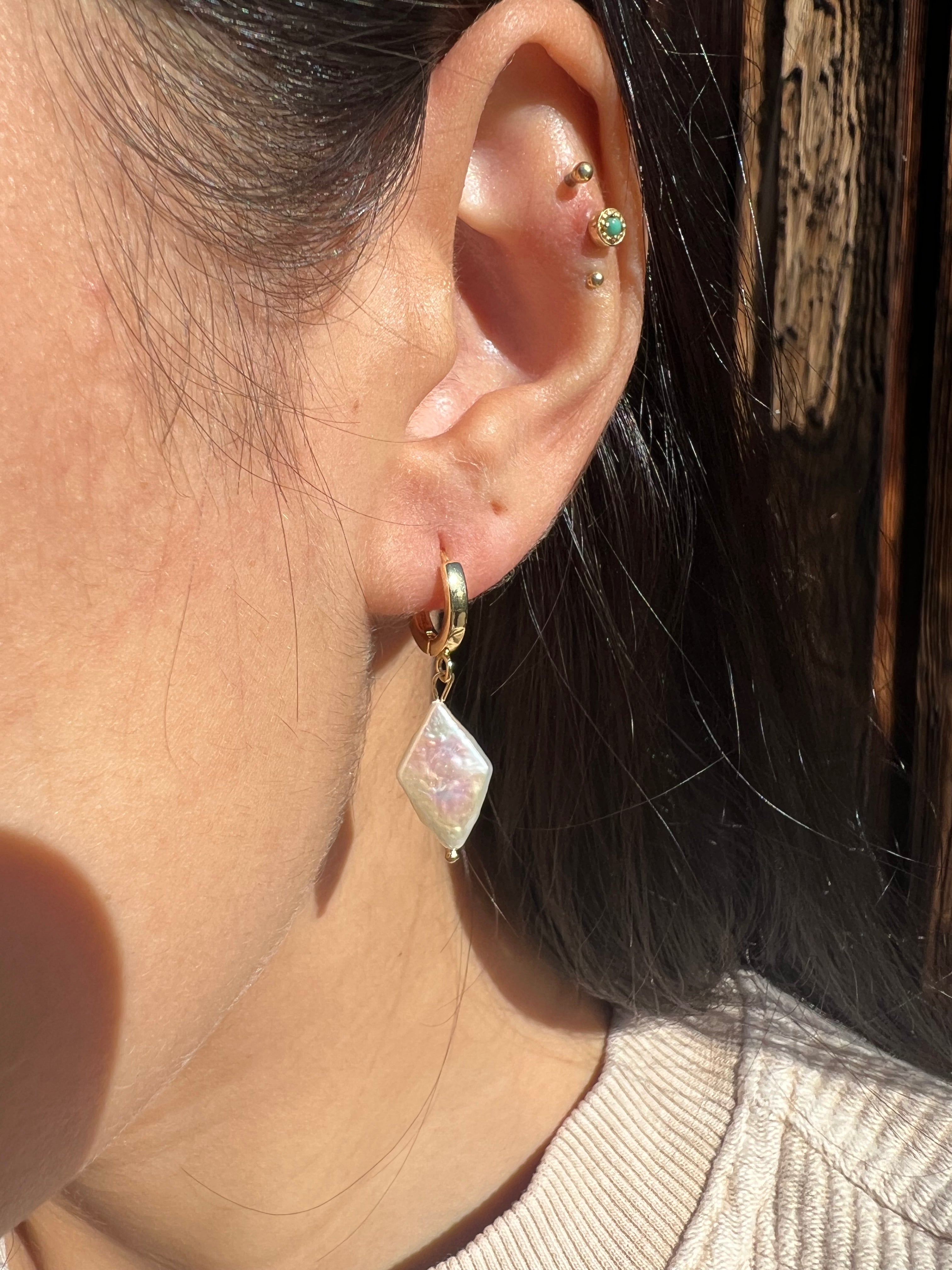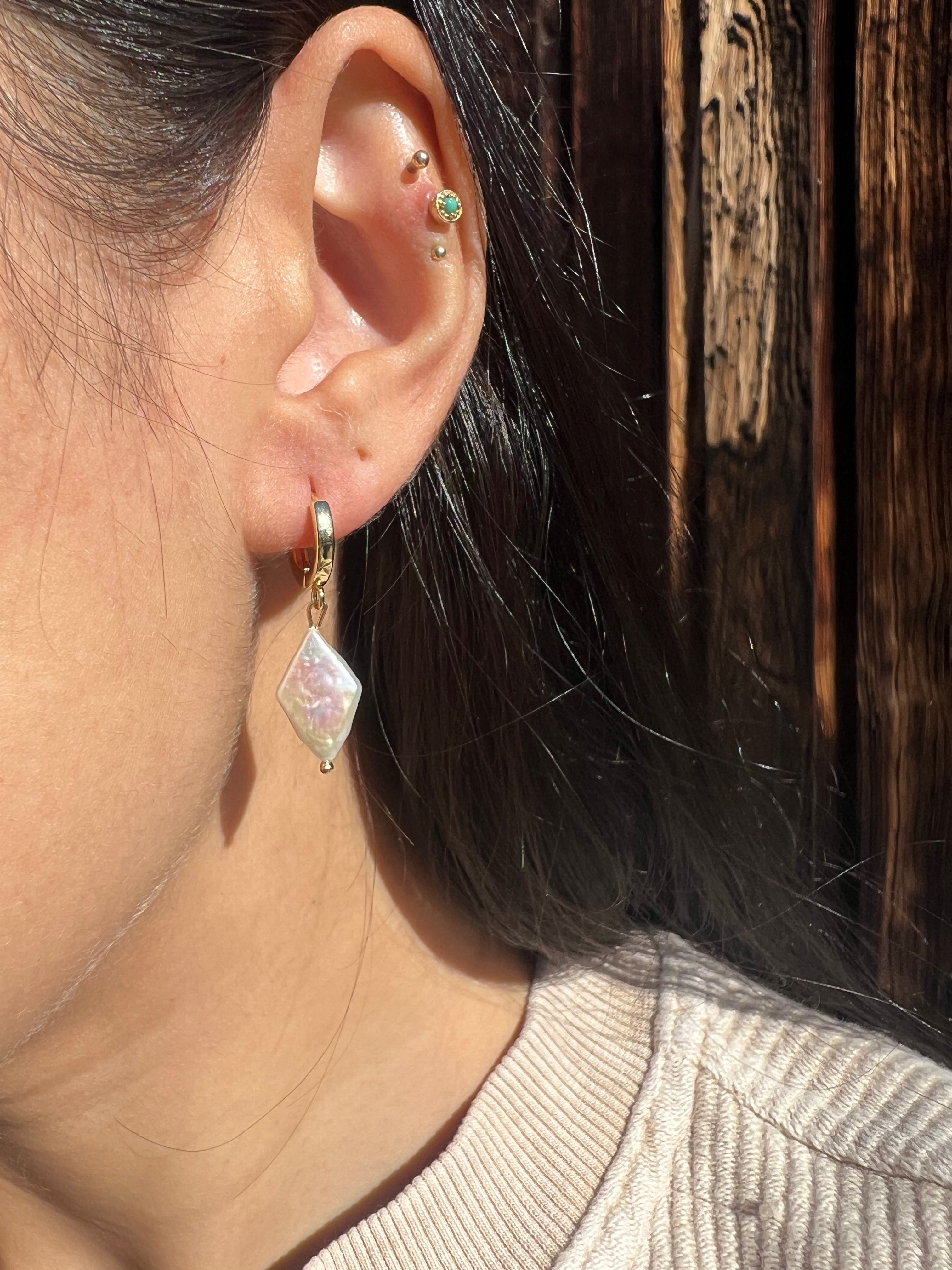 Crafted with gold filled or sterling silver, our Finn Huggies feature a diamond shaped freshwater pearl that adds a touch of elegance to any outfit. These earrings are also water-resistant, making them perfect for everyday wear.