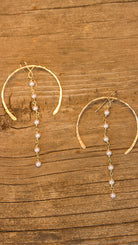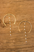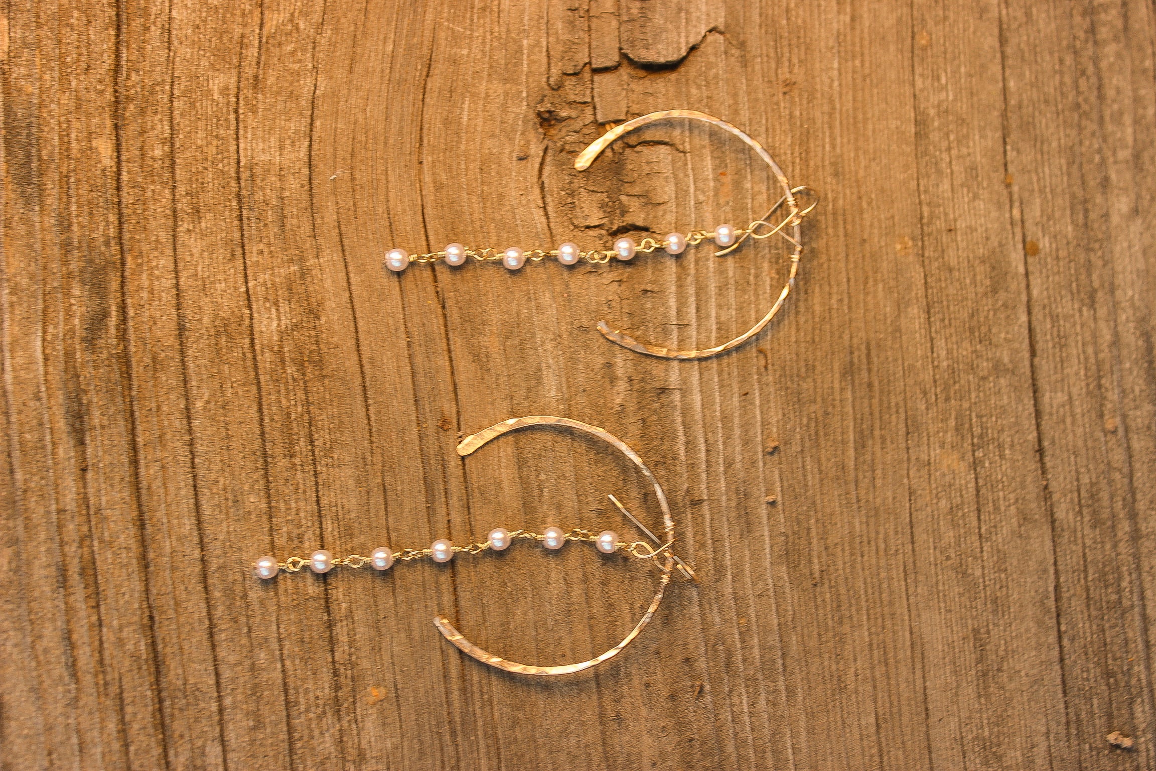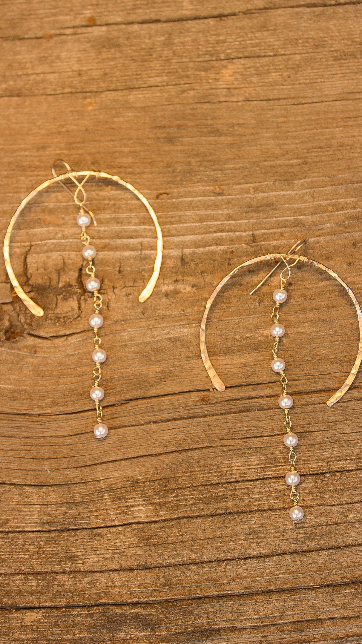 These crescent shaped 14k gold filled wire hoops feature a chain of white keshi pearls. Available in gold and sterling silver.