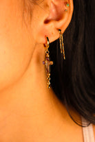 An iridescent abalone cross hangs from a gold filled huggie, reflecting shifting tones of ocean light with every movement. No two pieces are exactly alike, each one carrying its own natural pattern shaped by the sea.
