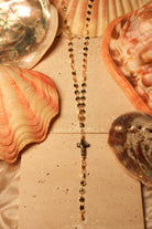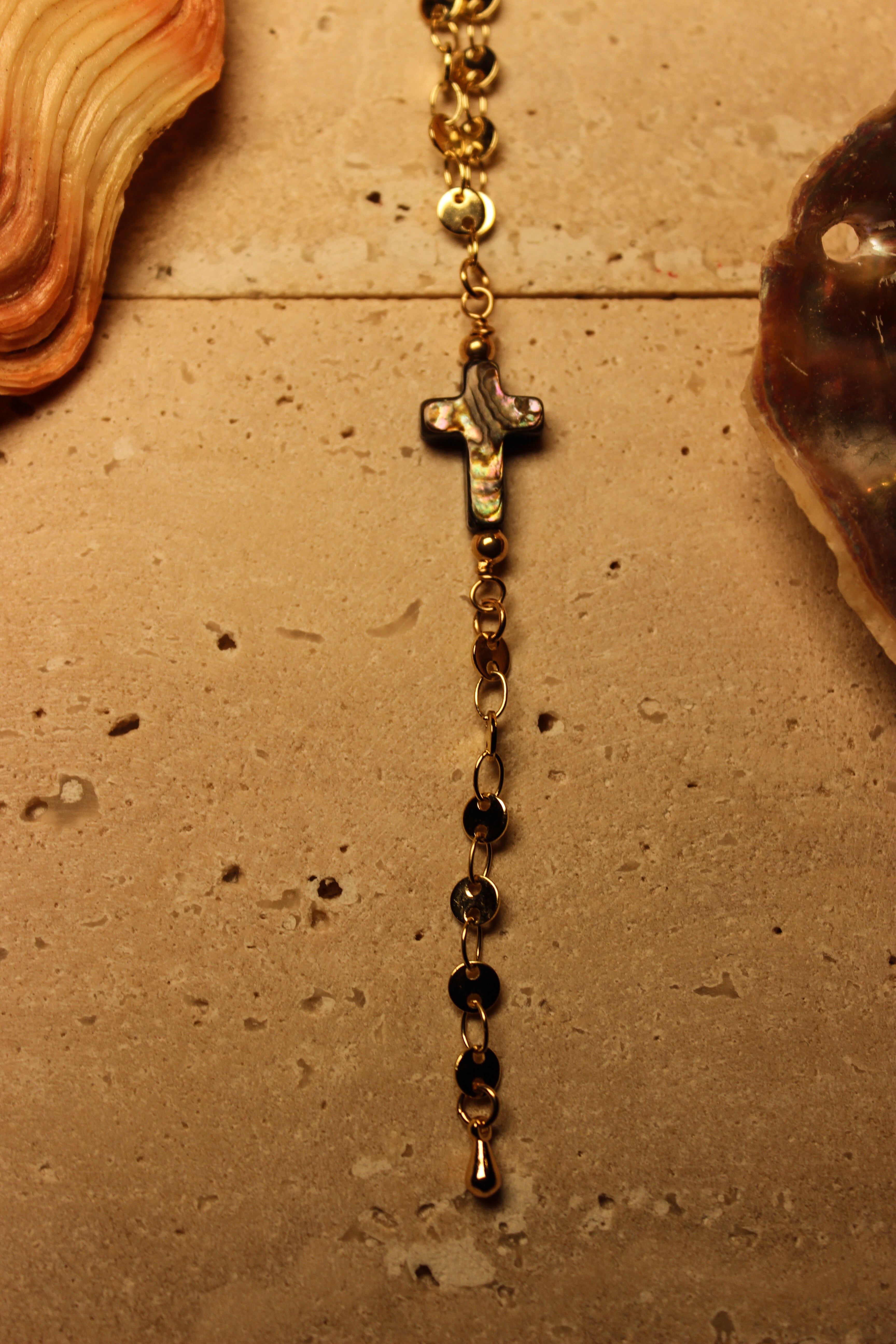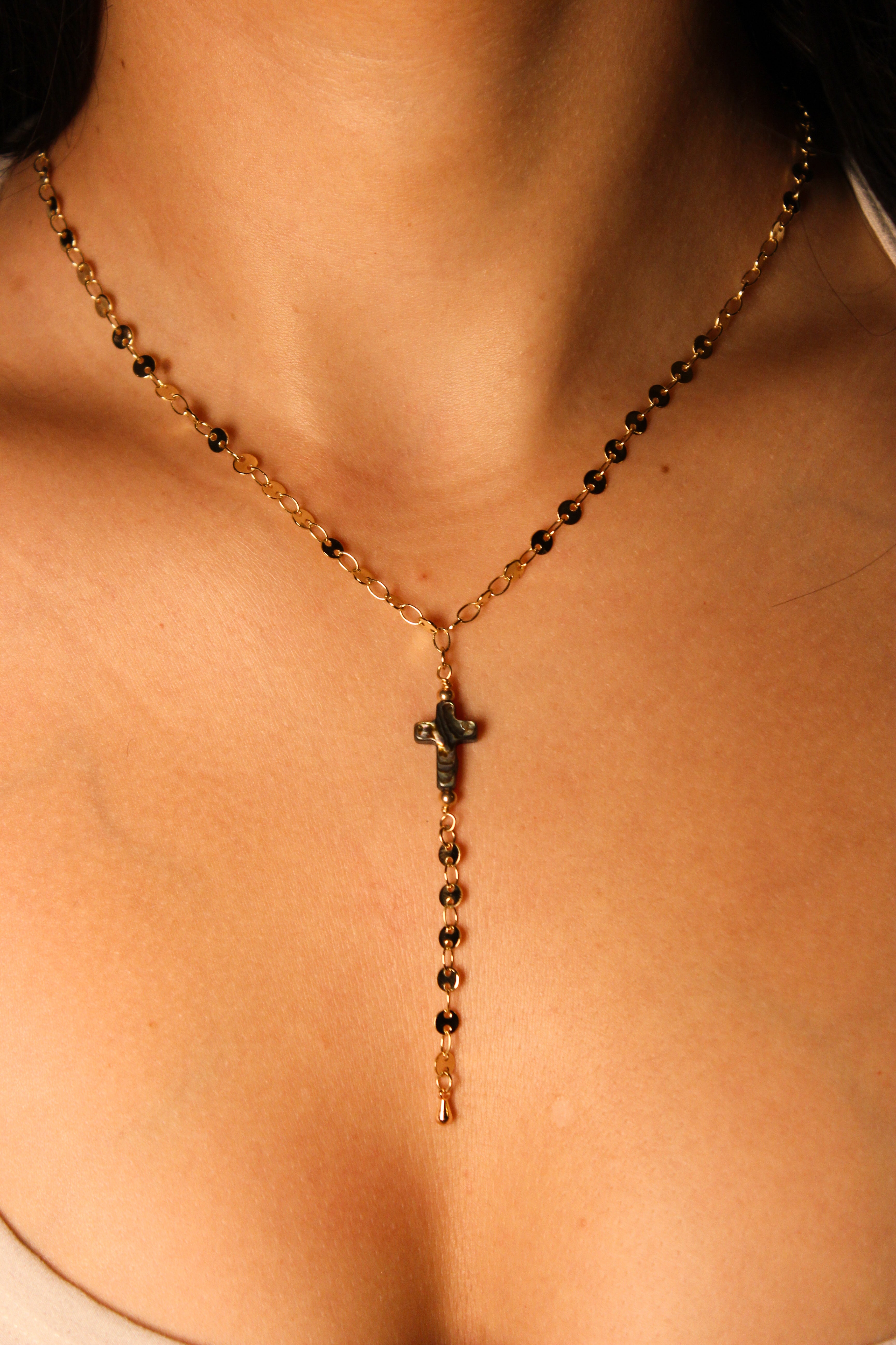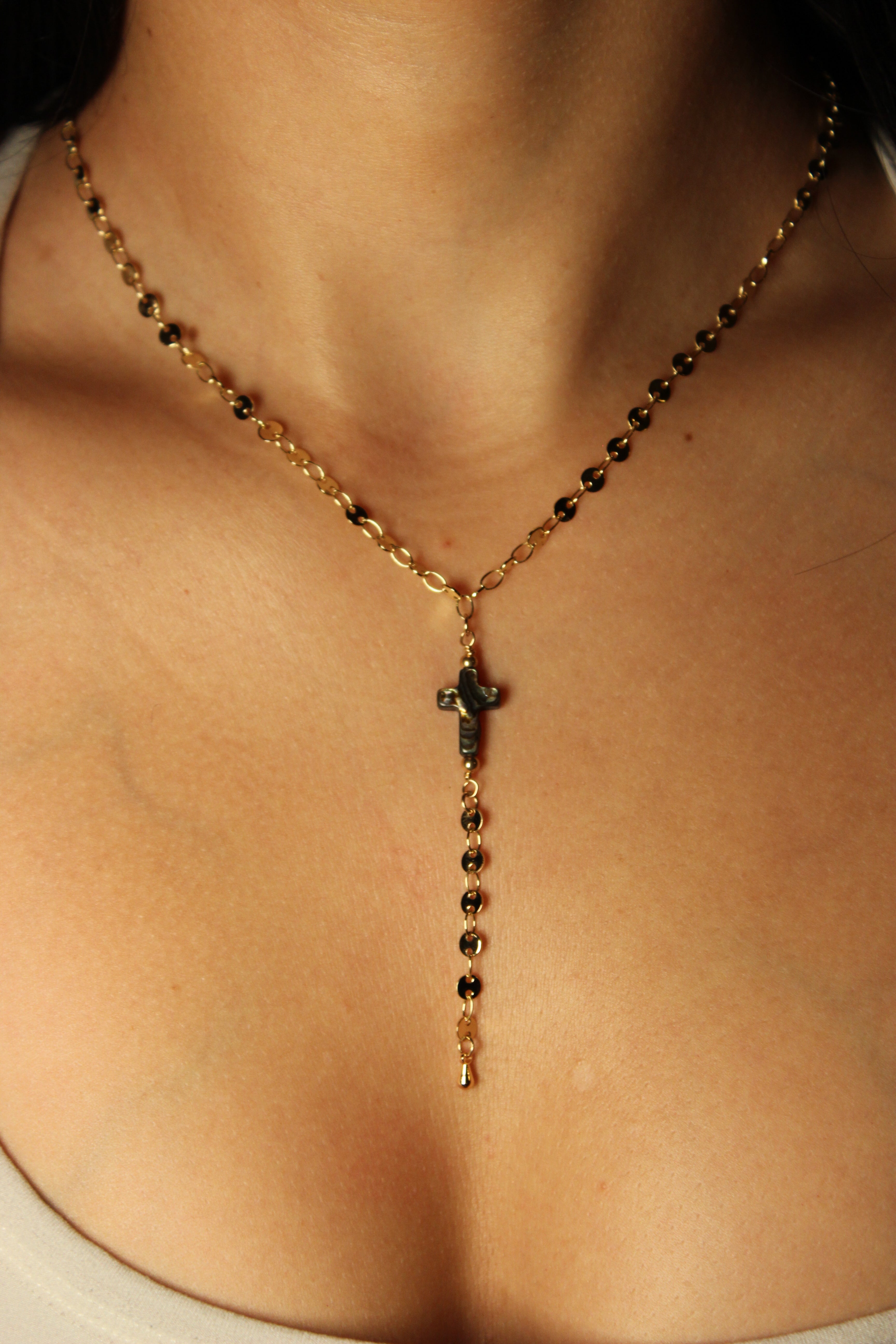 An iridescent abalone cross rests at the center, suspended from a gold filled chain accented with delicate gold filled beads. Below, a single drop of chain creates a soft, elongating silhouette that moves naturally with your body.