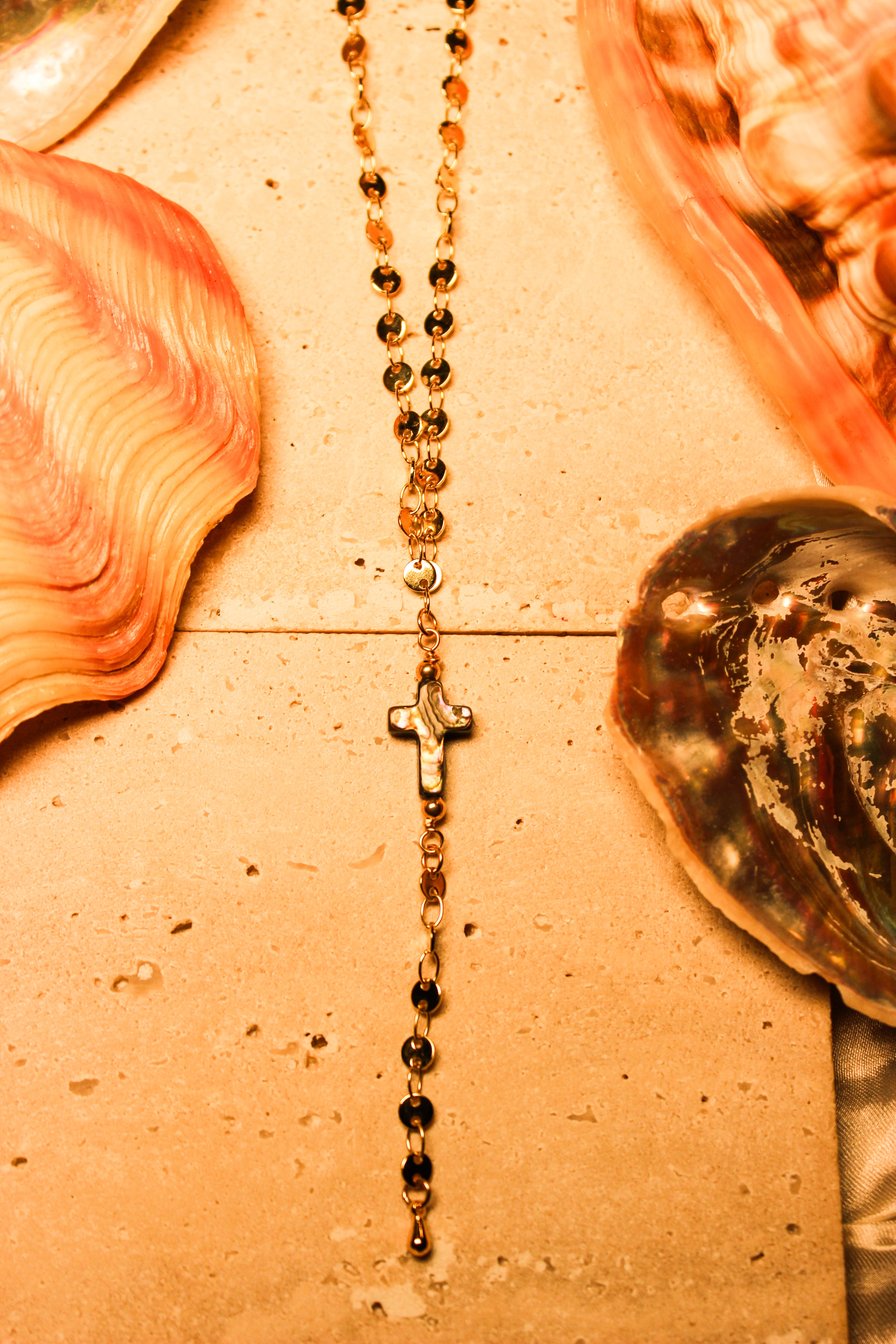 Lightweight and water resistant, the Abalone Cross Lariat is made for everyday wear. A quiet symbol of protection and presence, designed to rest close to the heart.