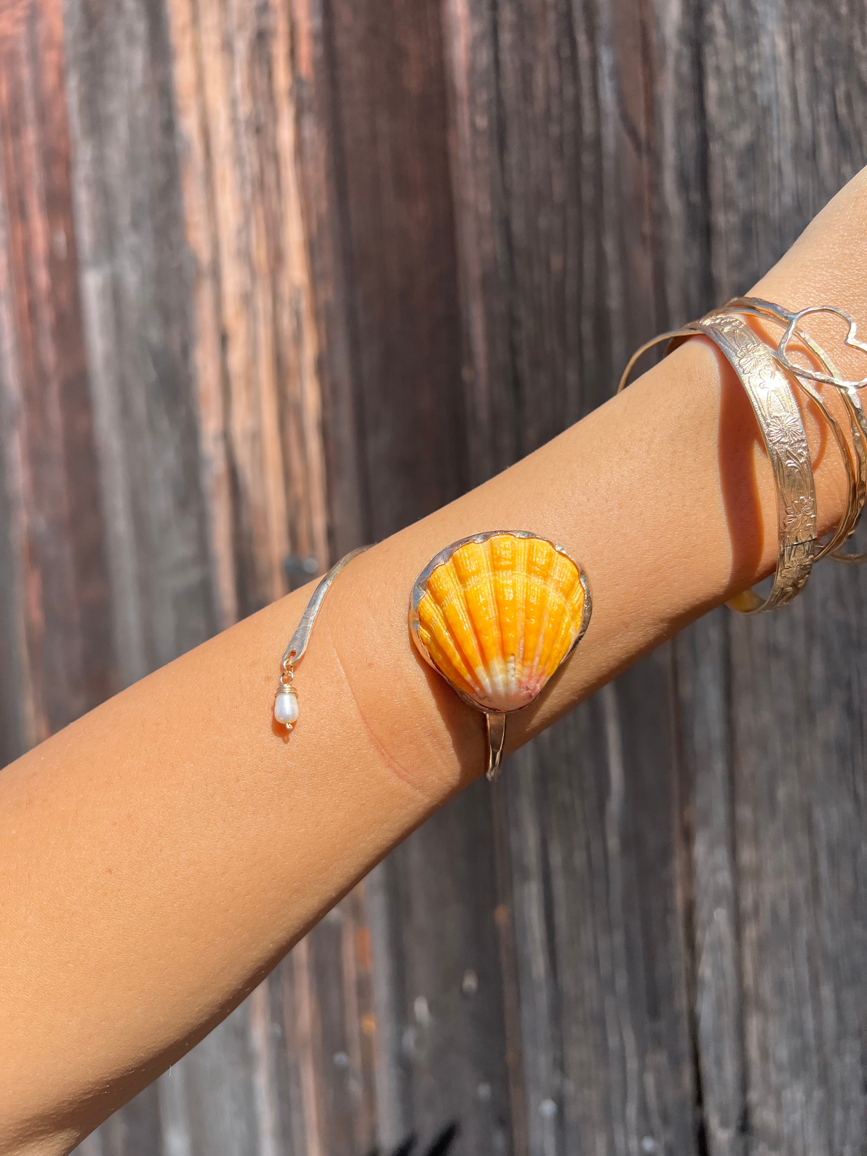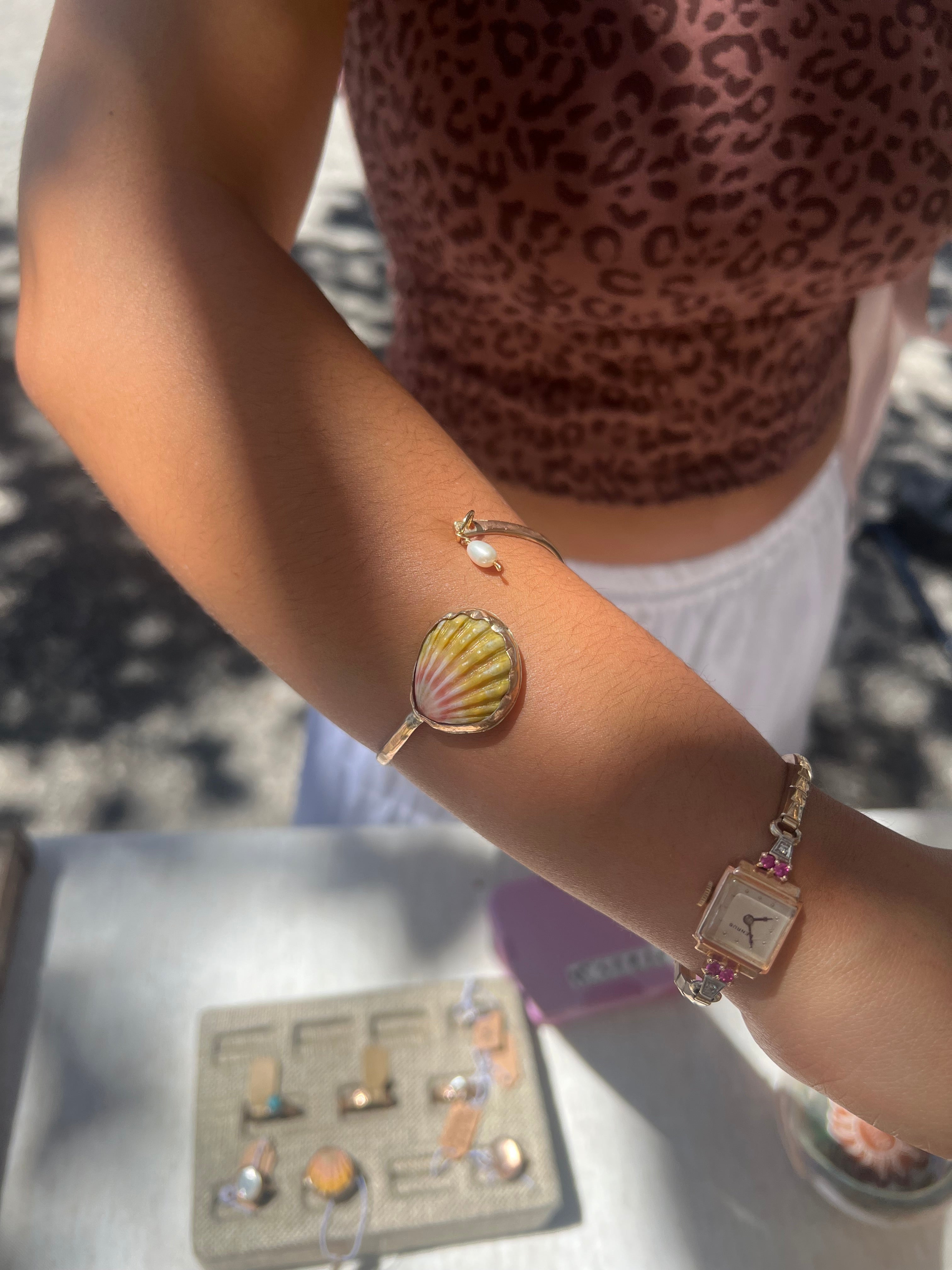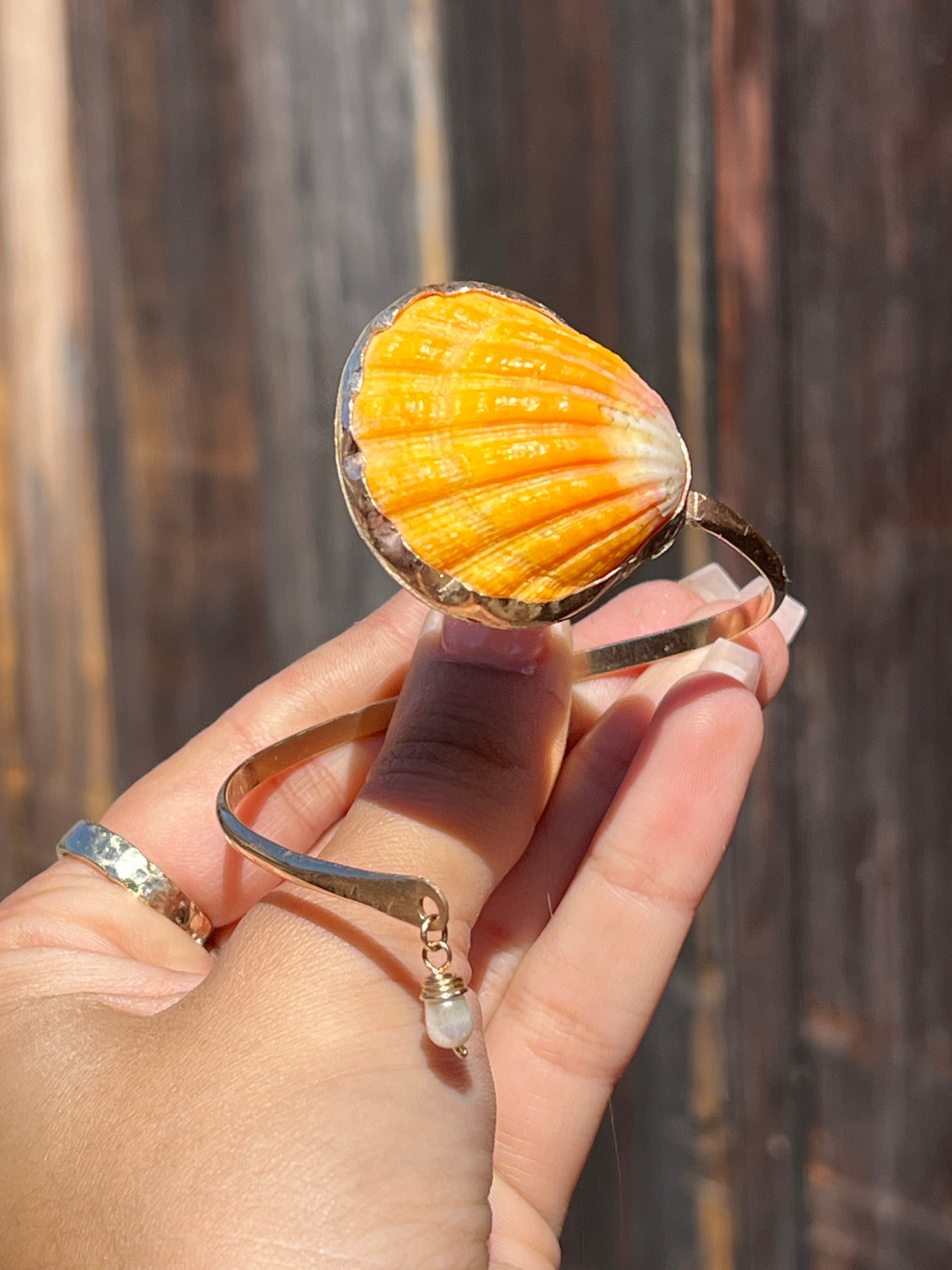 So excited to release these babies. Gold filled thick gauge wire hammered to perfection featuring a hand soldered, filed and bezeled sunrise shell ring from Oahu. Available in 7”, 8”, and 9” lengths to perfectly fit the arm. You can wear it on your wrist, forearm, or upper arm if you’re feeling crazy, (size up). Choose you size and customer will be emailed shell options we have available once purchased:) Each shell will vary as they are all unique, no two will be the same. In the other end of the cuff is a beautiful keshi pearl meant to drop down and cascade the arm. When putting on cuff DO NOT OPEN SIDE TO SIDE (pull apart) rather open with both sides vertically pull away from eachother. Easily adjust to your arm as the wire is malleable. Make it yours!! ABSOLUTELY NO RETURNS ON THESE. thank you for your understanding