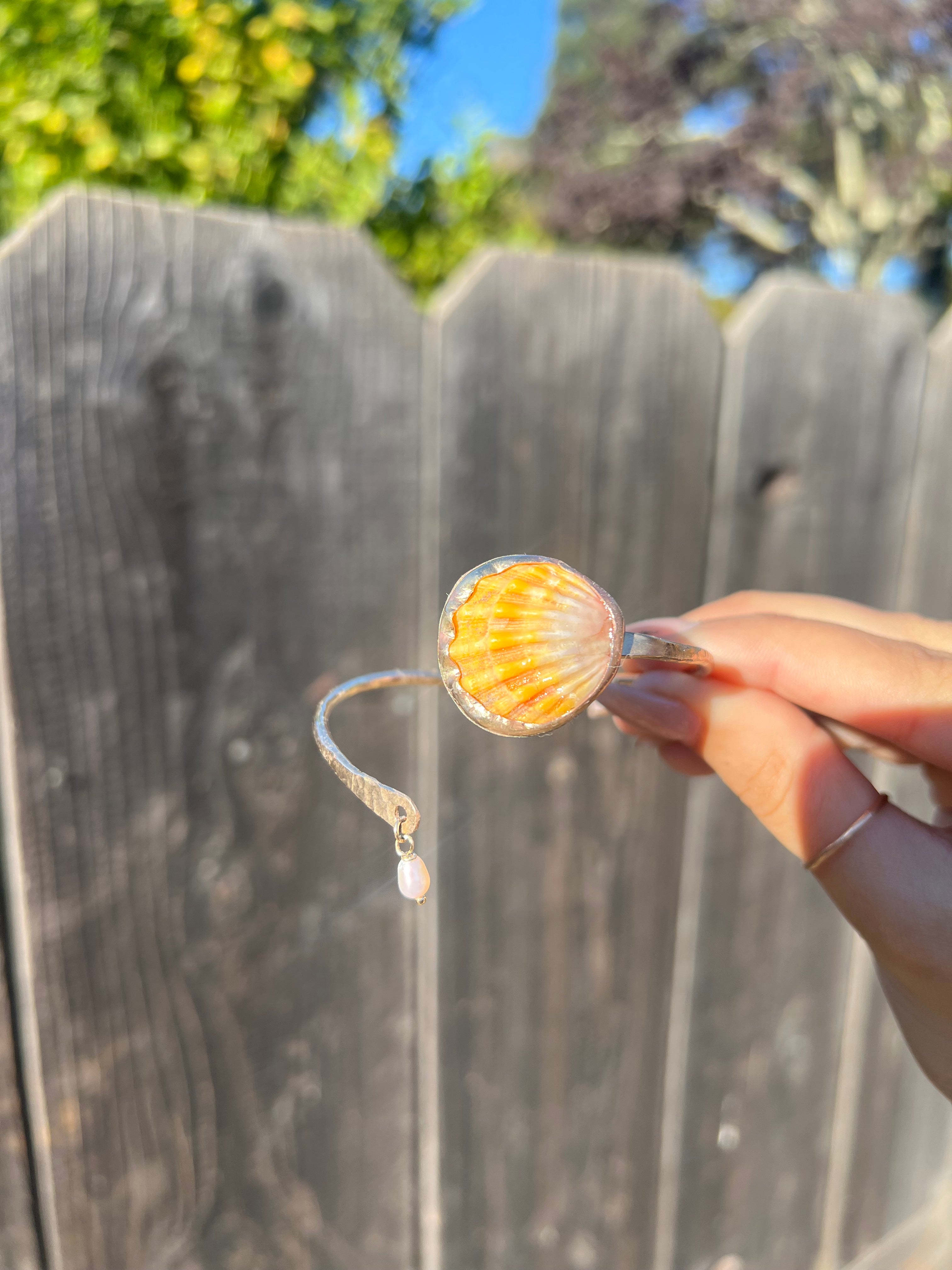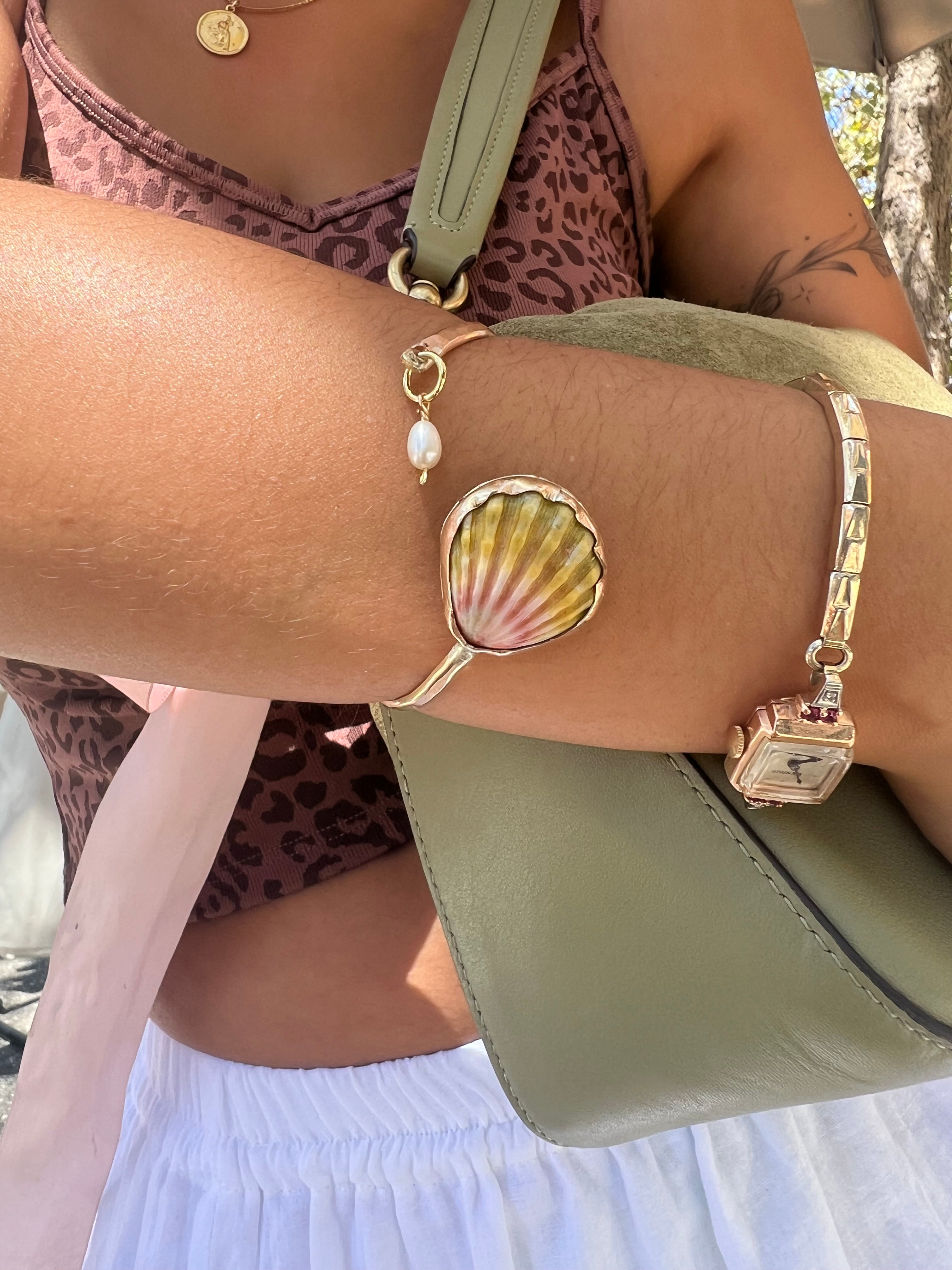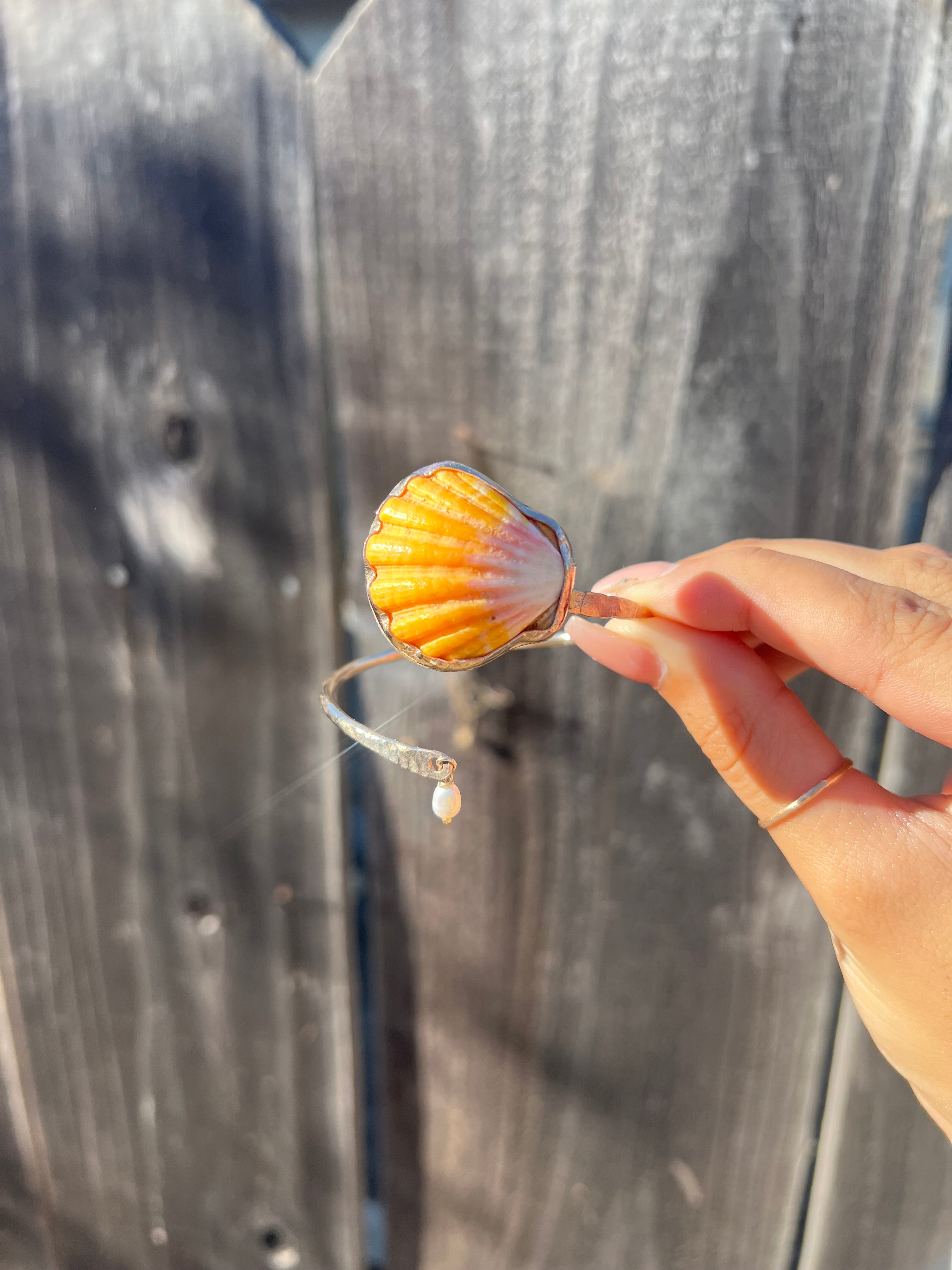 So excited to release these babies. Gold filled thick gauge wire hammered to perfection featuring a hand soldered, filed and bezeled sunrise shell ring from Oahu. Available in 7”, 8”, and 9” lengths to perfectly fit the arm. You can wear it on your wrist, forearm, or upper arm if you’re feeling crazy, (size up). Choose you size and customer will be emailed shell options we have available once purchased:) Each shell will vary as they are all unique, no two will be the same. In the other end of the cuff is a beautiful keshi pearl meant to drop down and cascade the arm. When putting on cuff DO NOT OPEN SIDE TO SIDE (pull apart) rather open with both sides vertically pull away from eachother. Easily adjust to your arm as the wire is malleable. Make it yours!! ABSOLUTELY NO RETURNS ON THESE. thank you for your understanding