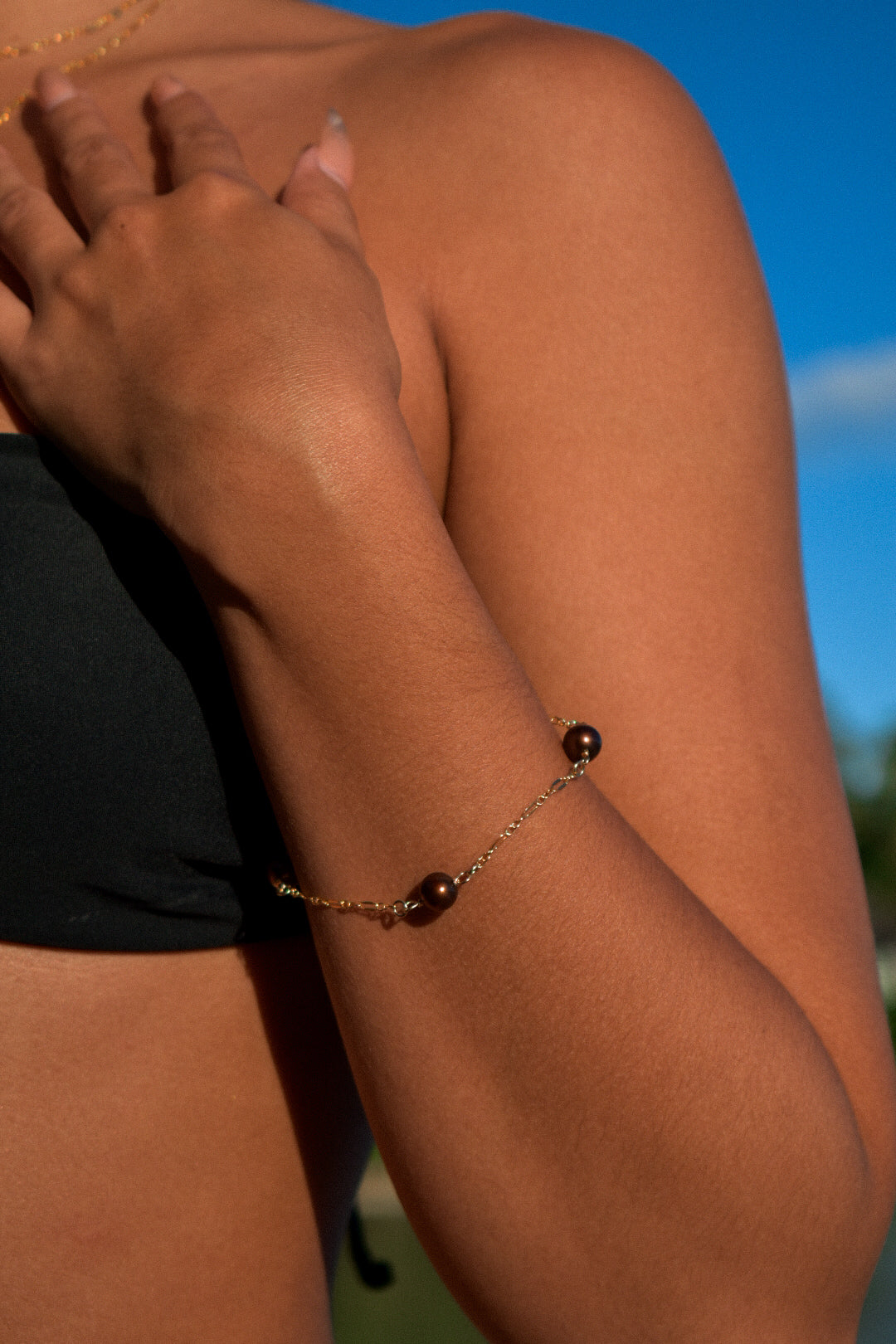This Tigerlily Bracelet features a shimmering gold filled chain that adds a touch of elegance to any outfit. The adjustable length of 5.5-7.5 inches ensures a perfect fit, while the three rich chocolate brown pearls add a luxurious touch. A must-have accessory for any fashion-forward individual.