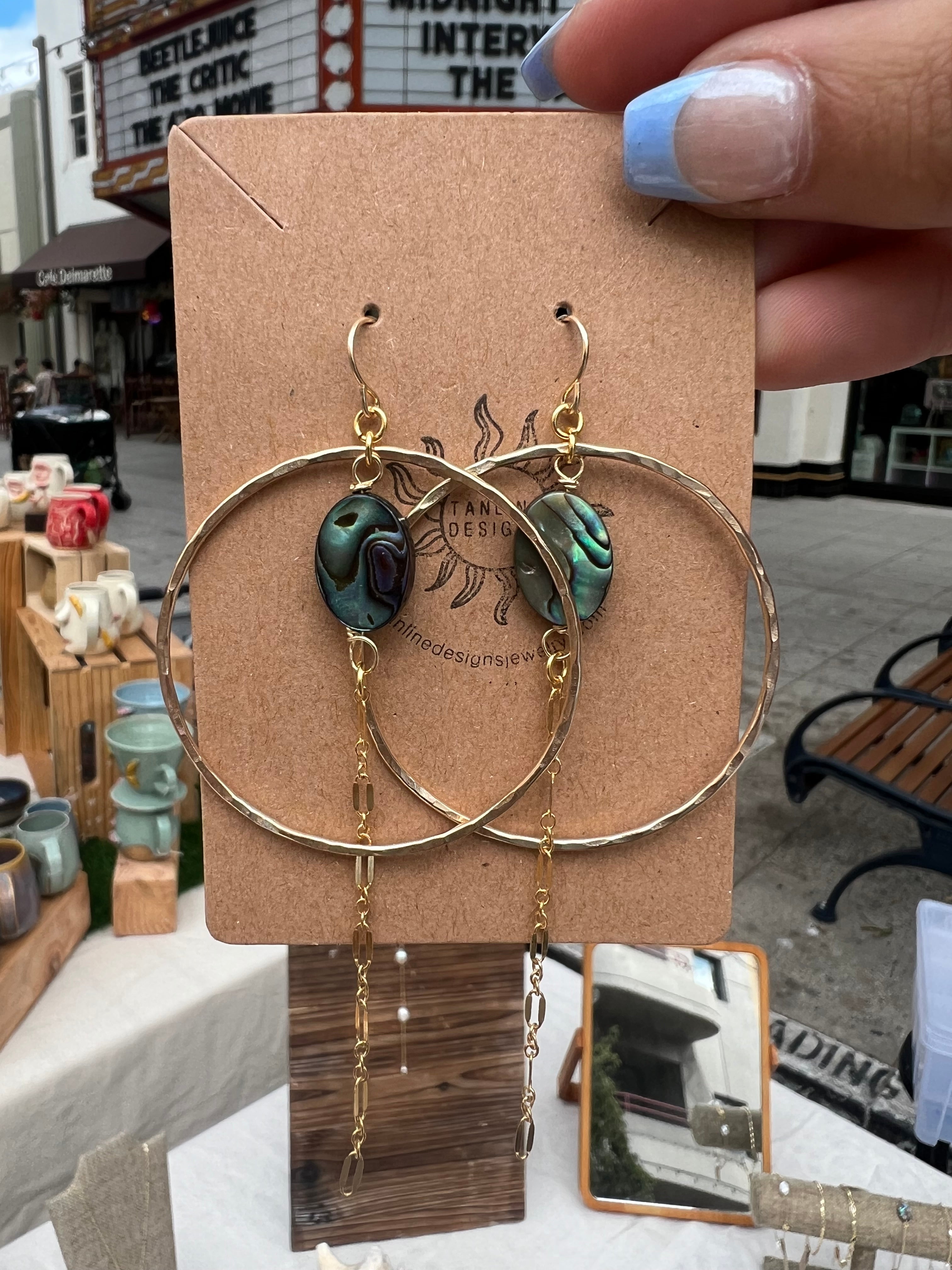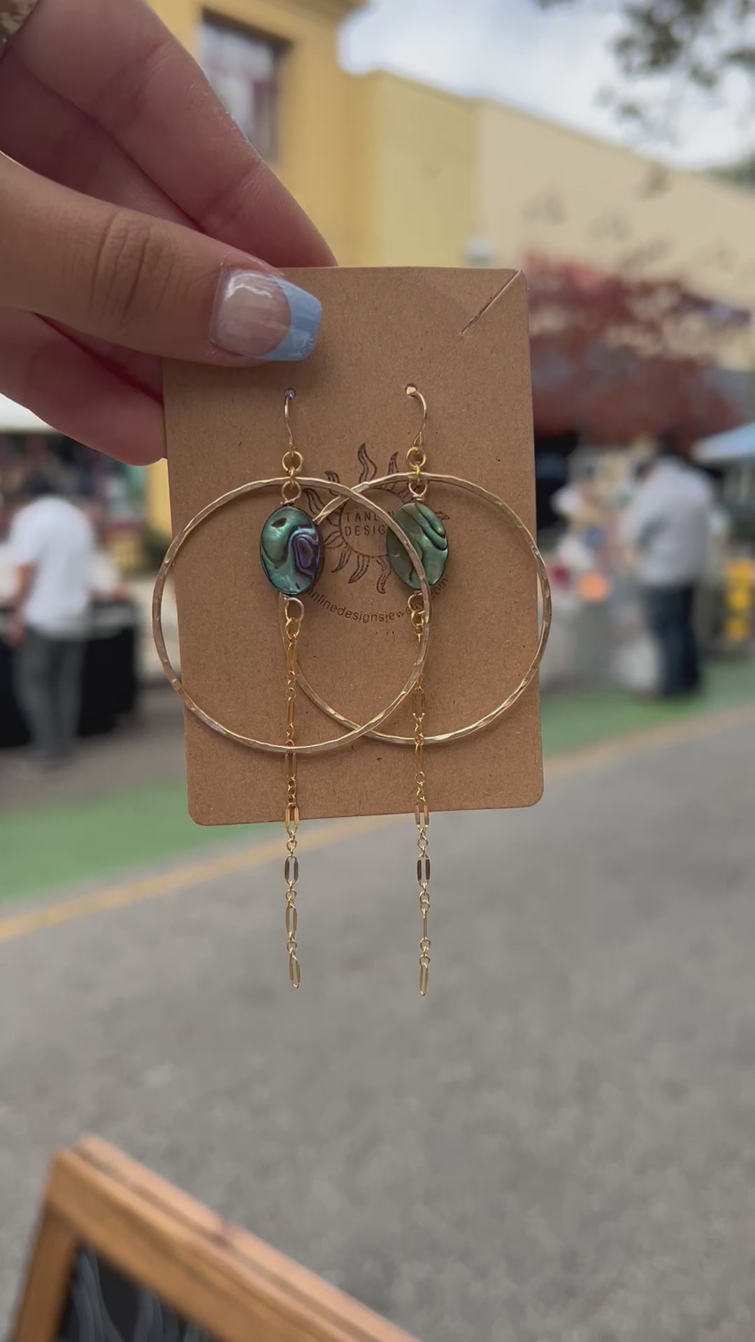 Elevate your style with our gold filled hammered texture big hoops. The unique small abalone piece and drop down disc chain add a statement vibe to any outfit. Get the perfect blend of sophistication and edge with these versatile earrings. Available in sterling silver.
